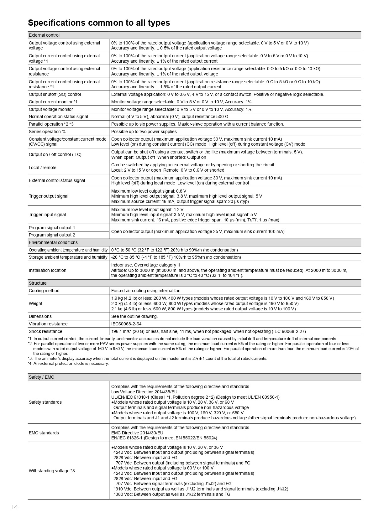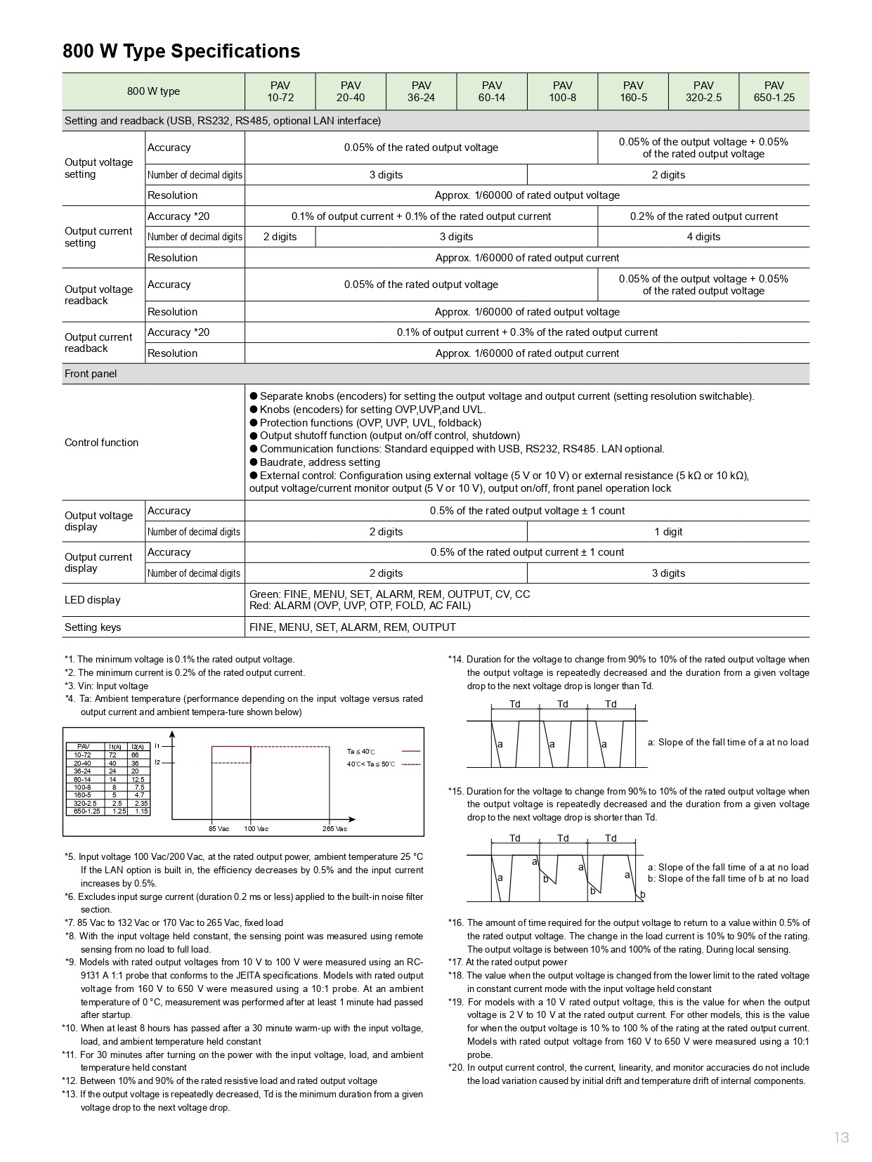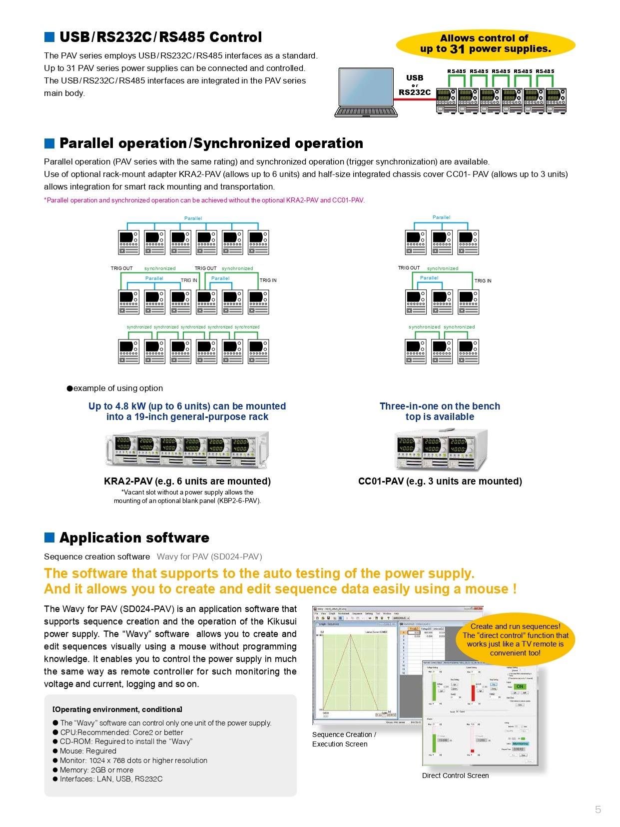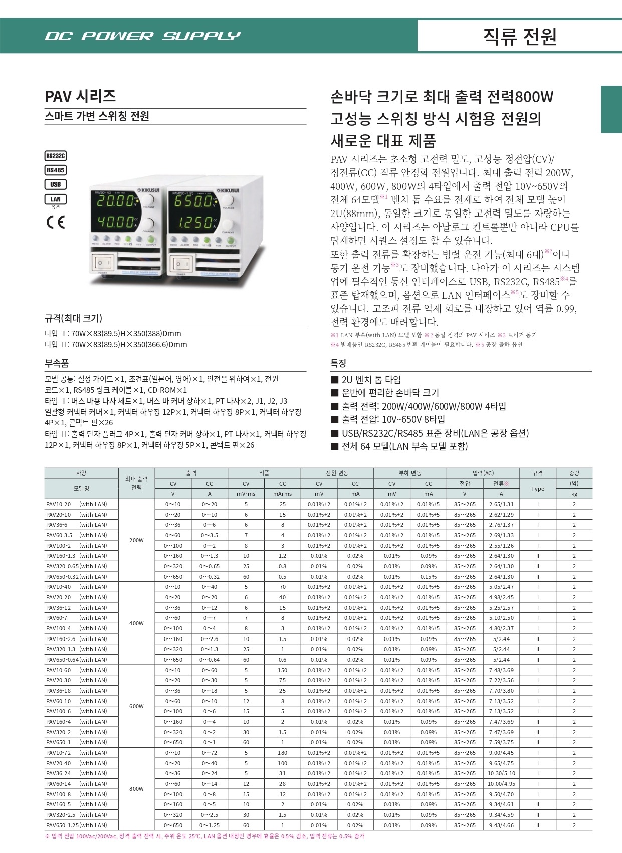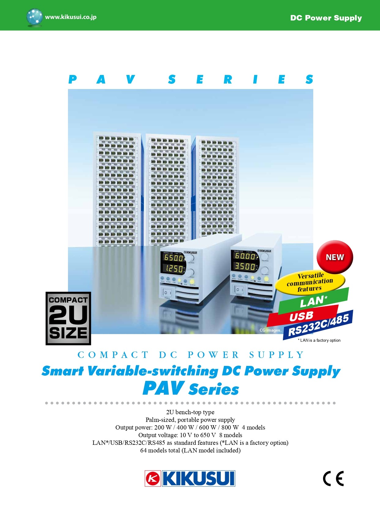 PAV 시리즈는 최소형 고전력밀도, 고성능의 정전압(CV)/정전류(CC) 가변형 스위칭 전원입니다. 최대 출력 200W, 400W, 600W, 800W의 4가지 타입으로 출력 전압 10V~650V의 총 64모델*1. 벤치톱 사용을 전제로 하여 총 모델 높이 2U (약 88mm), 동일 사이즈로 통일한 고전력밀도를 자랑하는 사양입니다. 이 시리즈는 아날로그 컨트롤뿐만 아니라 CPU를 탑재하여 시퀀스 설정도 할 수 있습니다.