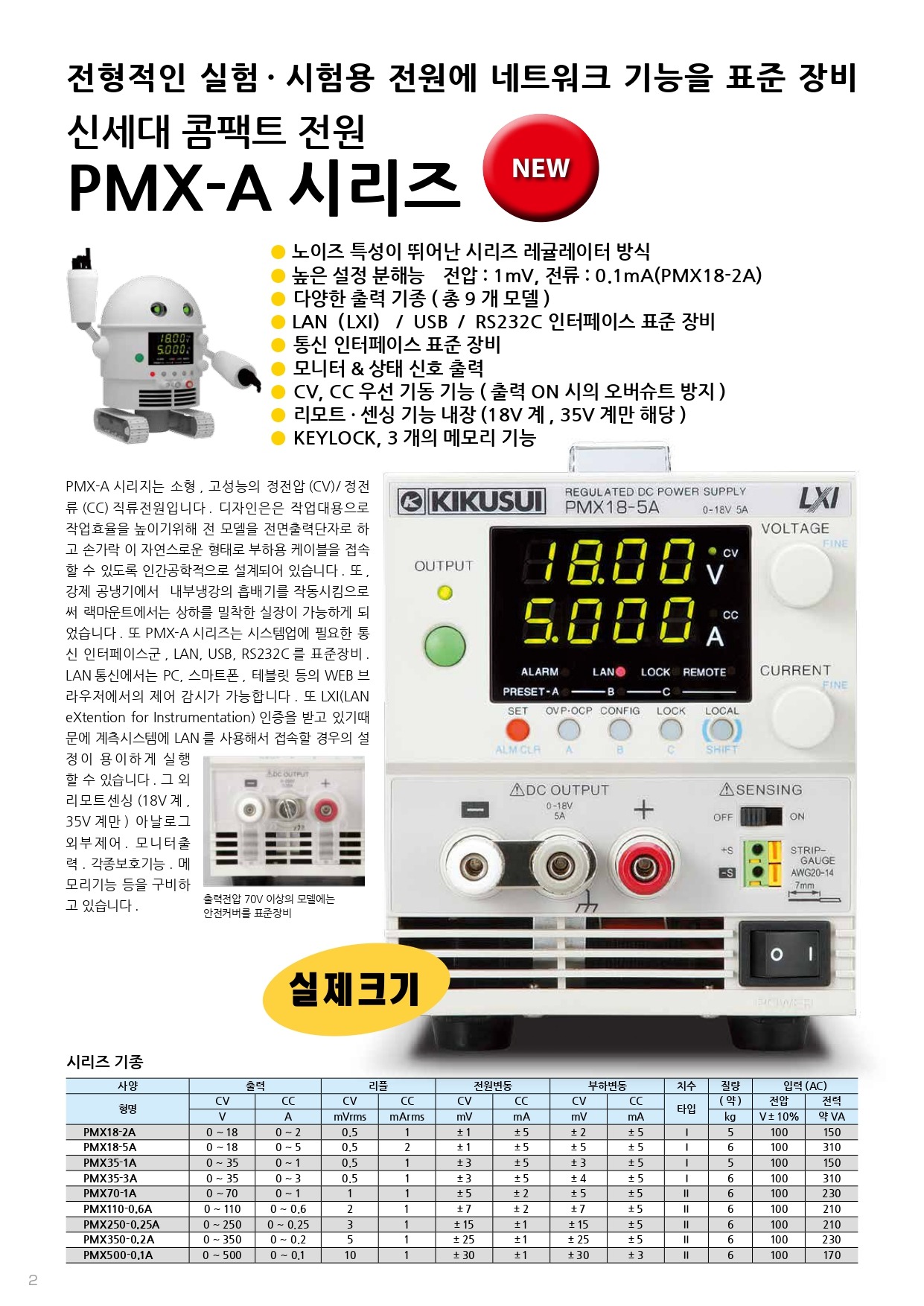 | PMX18-2A | 0 〜 18V/0 〜 2A LAN/USB/RS232C 인터페이스를 표준 장비(LAN은 LXI 대응) |
