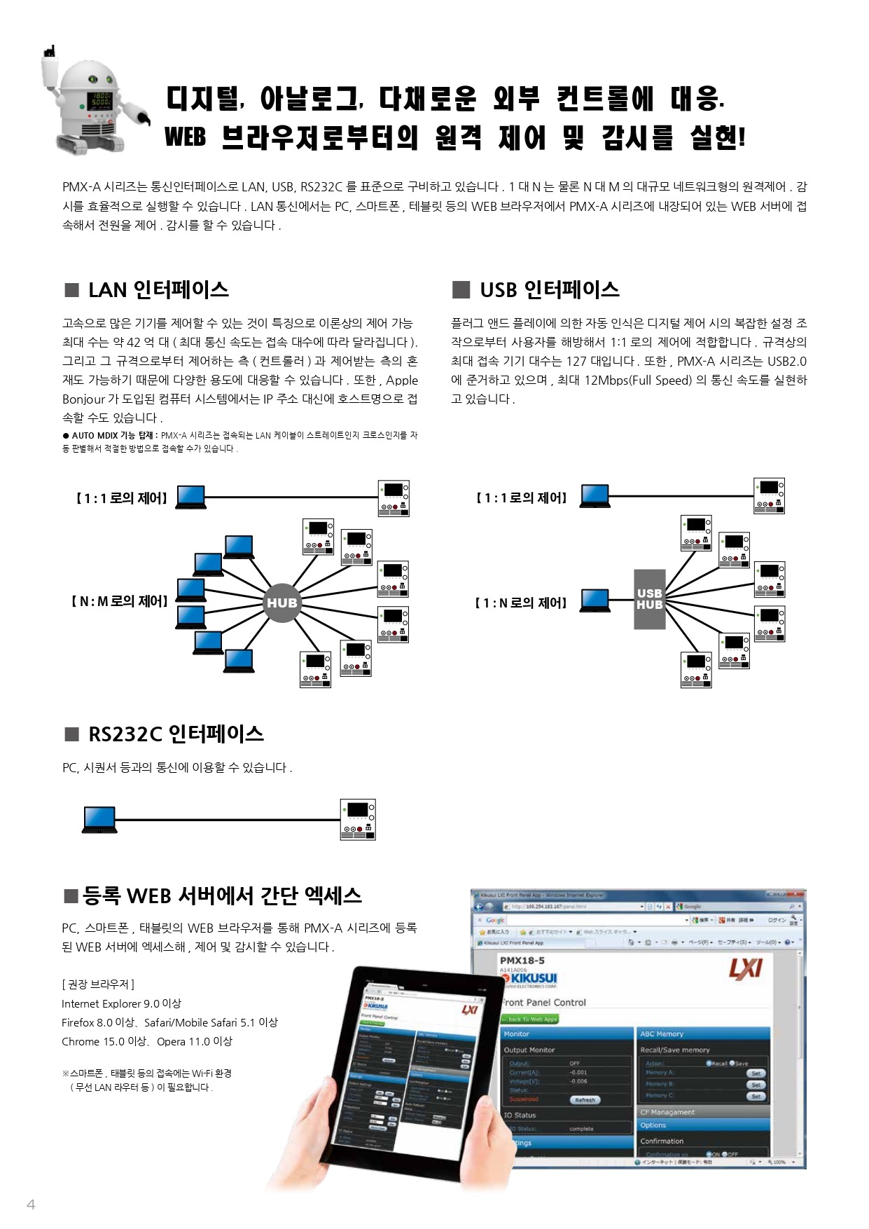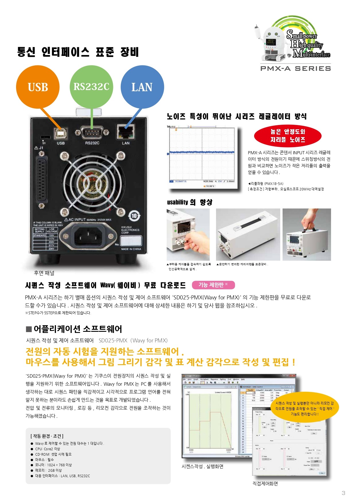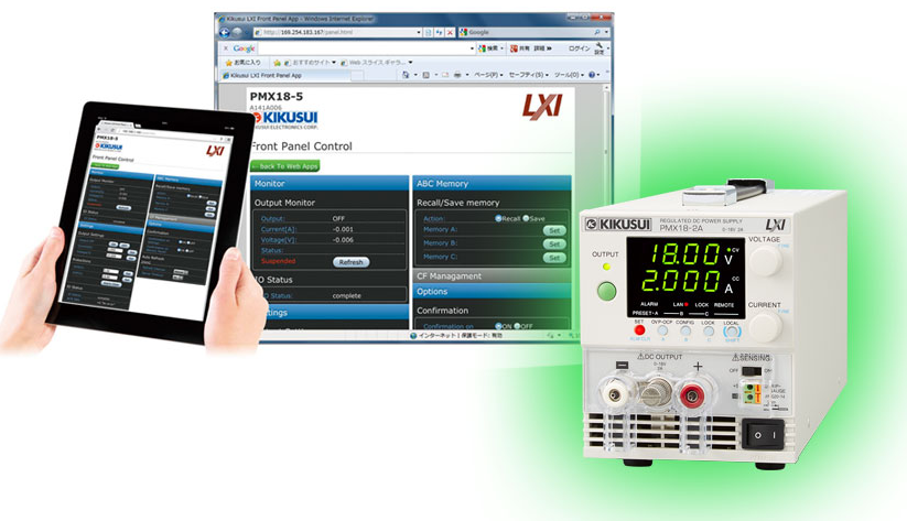 또 PMX-A시리즈는 시스템업에 필요한 통신 인터페이스군, LAN, USB, RS232C를 표준장비. LAN통신에서는 PC, 스마트폰, 테블릿 등의 WEB브라우저에서의 제어 감시가 가능합니다. 또 LXI(LAN eXtention for Instrumentation)인증을 받고 있기때문에 계측시스템에 LAN를 사용해서 접속할 경우의 설정이 용이하게 실행할 수 있습니다.