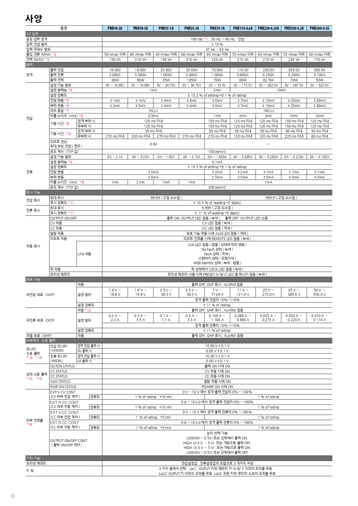 그 외 리모트센싱(18V계, 35V계만) 아날로그 외부제어. 모니터출력. 각종보호기능. 메모리기능 등을 구비하고 있습니다.
