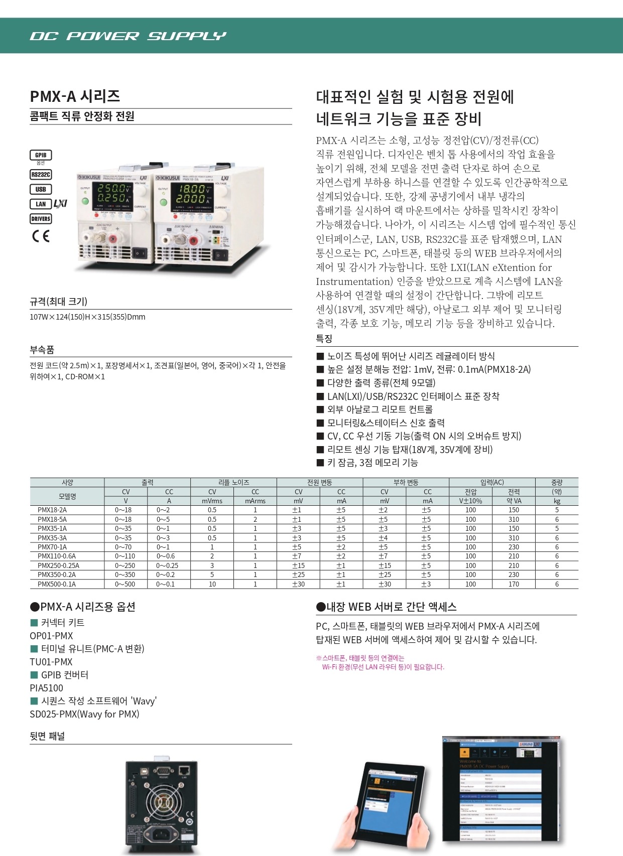 | PMX35-1A | 0 〜 35V/0 〜 1A LAN/USB/RS232C 인터페이스를 표준 장비(LAN은 LXI 대응) |