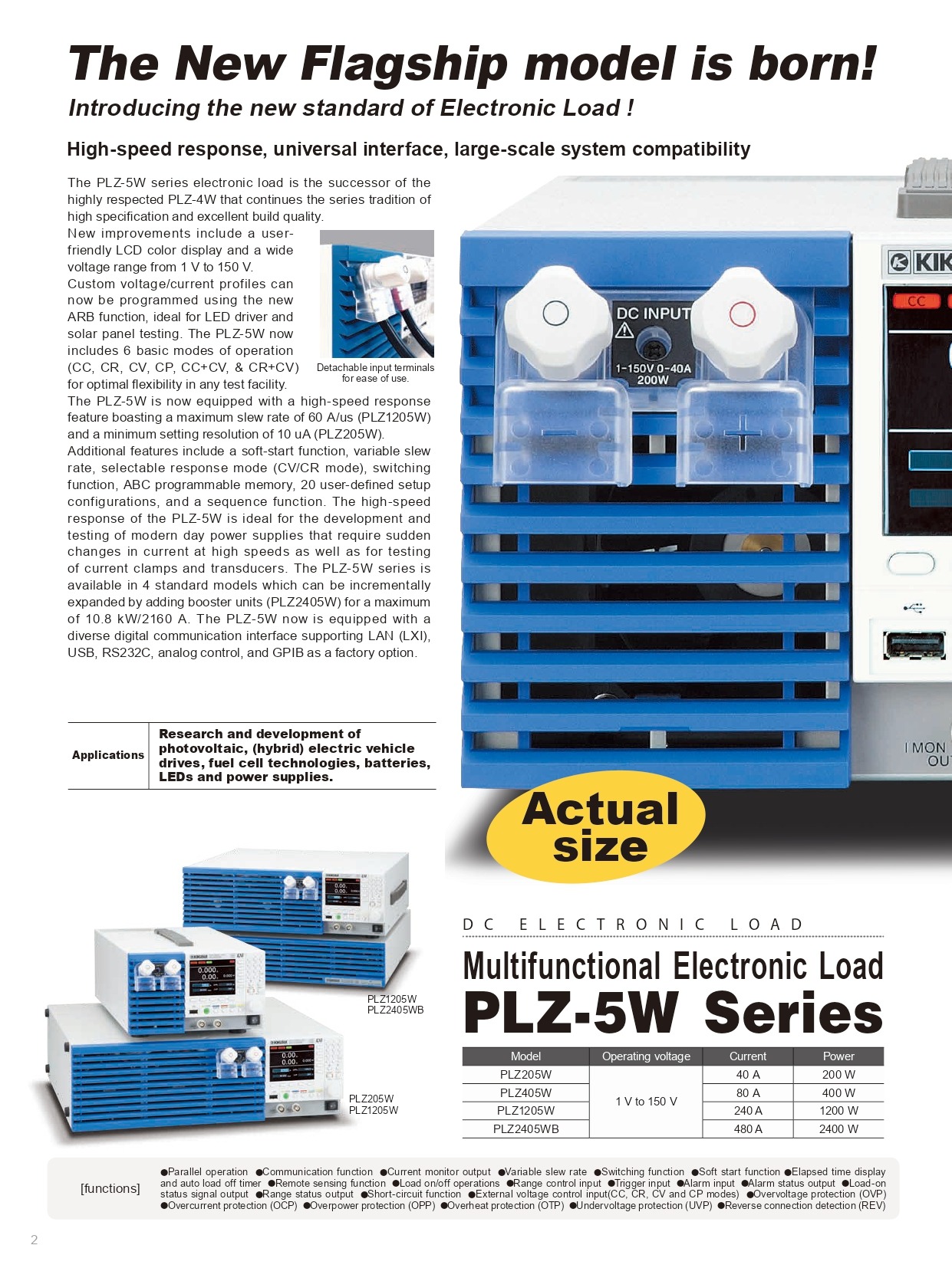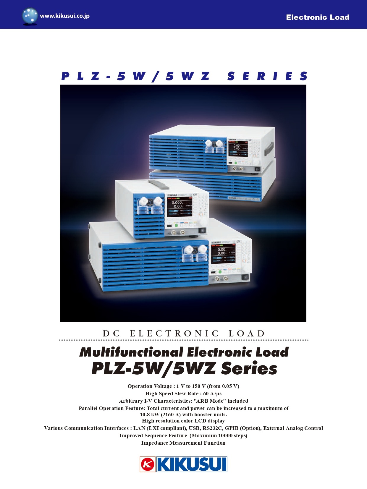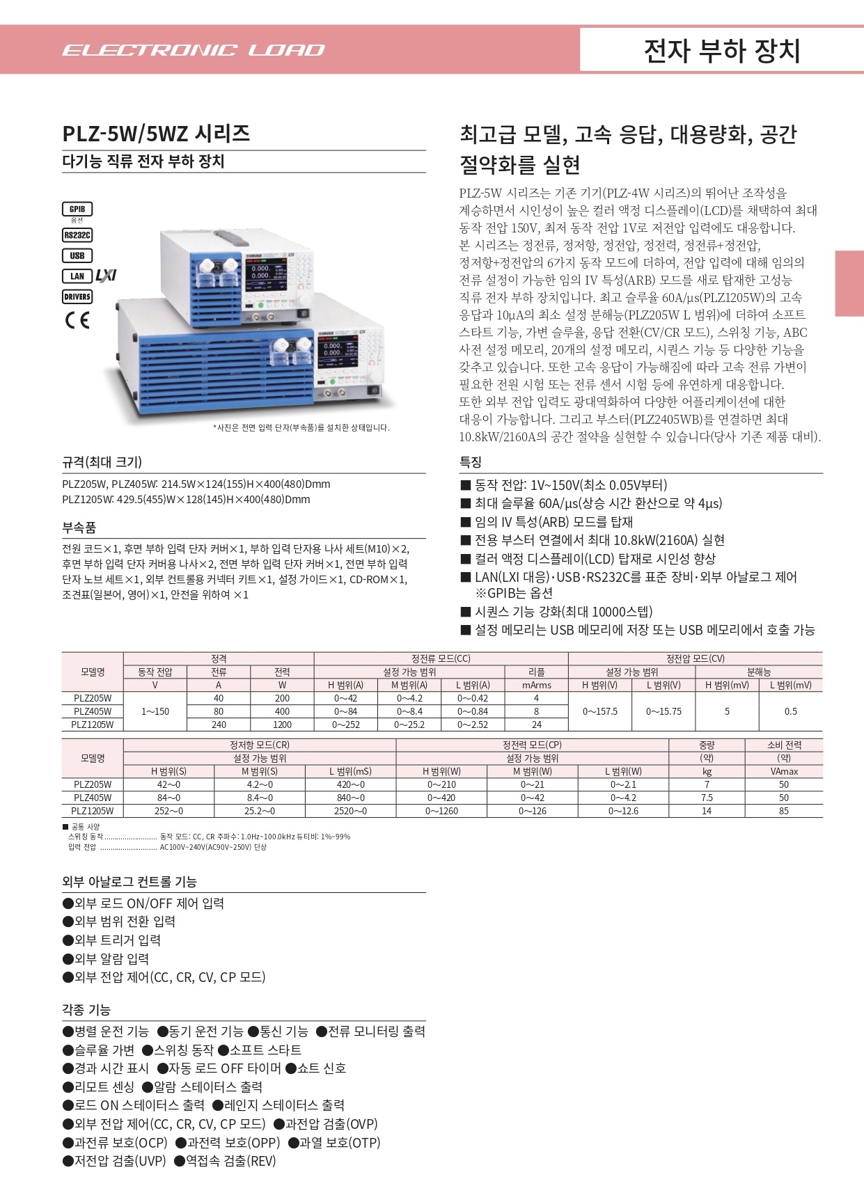 PLZ-5W 시리즈(이하 PLZ-5W)는 기존 제품(PLZ-4W 시리즈)의 뛰어난 조작성을 계승하면서도 시인성이 높은 컬러 액정 화면(LCD)을 채용. 최대 동작 전압 150V, 최저 동작 전압 1V로 저전압 입력에도 대응하고 있습니다. 본 시리즈는 정전류, 정저항, 정전압, 정전력, 정전류+정전압, 정저항+정전압과 같이 6개의 동작 모드 외에 전압 입력에 대한 임의의 전류 설정이 가능한 임의 IV 특성(ARB) 모드를 새롭게 탑재한 고성능 직류 전자 부하장치입니다.