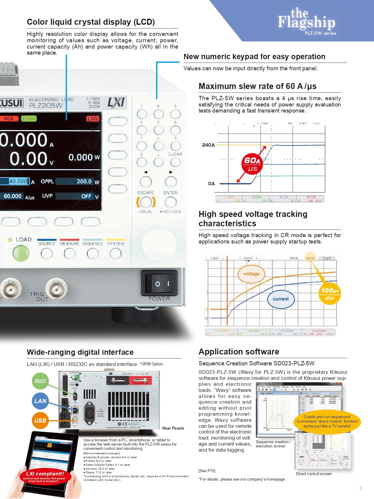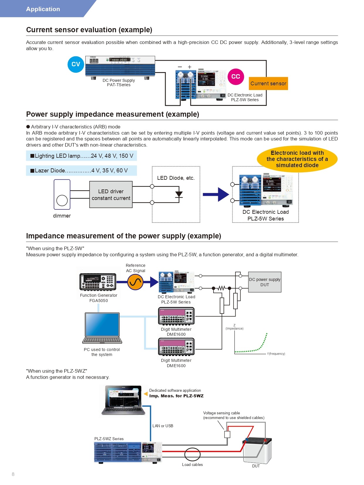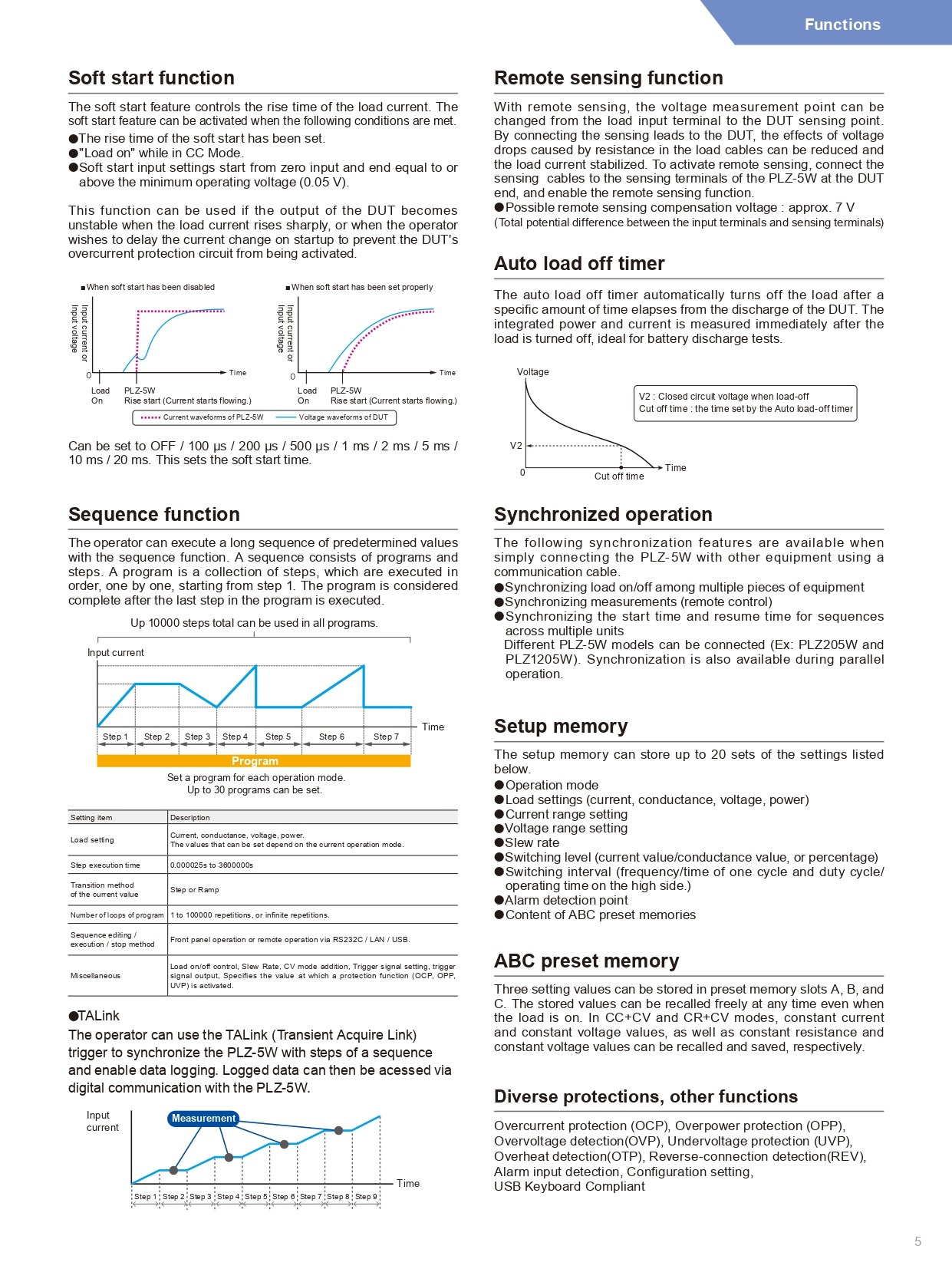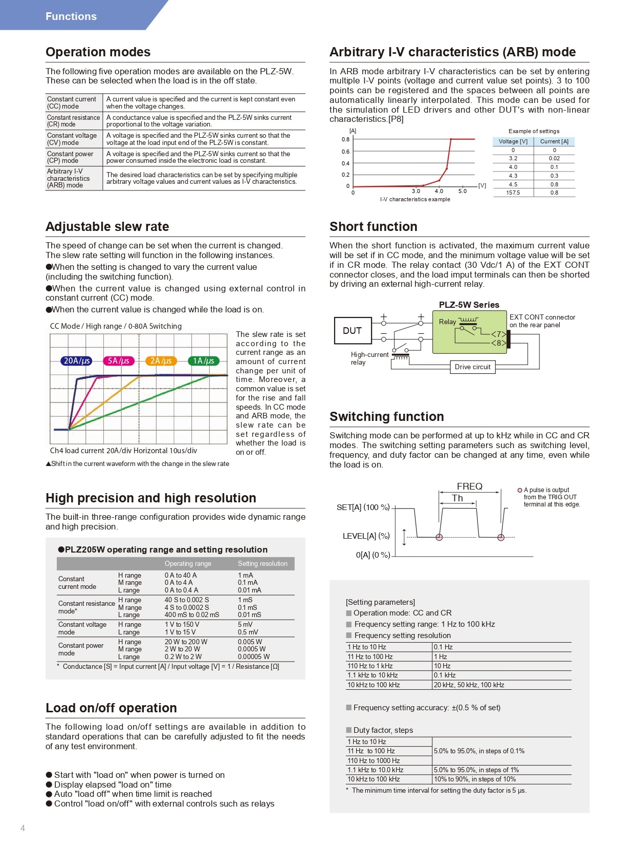 PLZ-5W 시리즈(이하 PLZ-5W)는 기존 제품(PLZ-4W 시리즈)의 뛰어난 조작성을 계승하면서도 시인성이 높은 컬러 액정 화면(LCD)을 채용. 최대 동작 전압 150V, 최저 동작 전압 1V로 저전압 입력에도 대응하고 있습니다. 본 시리즈는 정전류, 정저항, 정전압, 정전력, 정전류+정전압, 정저항+정전압과 같이 6개의 동작 모드 외에 전압 입력에 대한 임의의 전류 설정이 가능한 임의 IV 특성(ARB) 모드를 새롭게 탑재한 고성능 직류 전자 부하장치입니다.