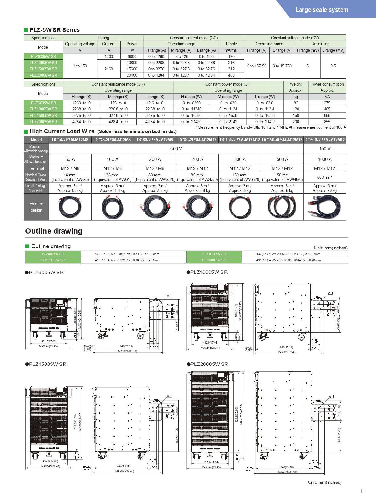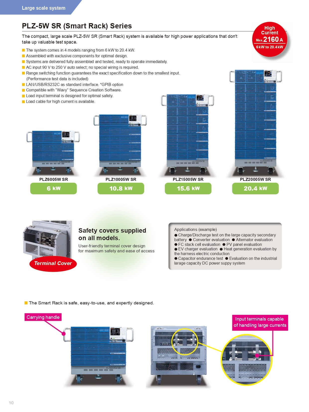 | PLZ10005W SR | PLZ1205W와 부스터를 전용 랙 부품으로 조립한 대용량 전자 부하장치입니다. 10.8kW, 1~150V, 2160A. 디지털 인터페이스(LAN/USB/RS-232C) 표준 탑재. 시퀀스 작성·제어 소프트웨어 'Wavy'로 제어 가능 |