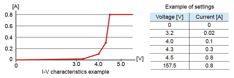 임의 IV 특성(ARB) 모드 임의 IV 특성(ARB) 모드에서는 IV 특성상의 임의의 점(전압값, 전류값 설정)을 복수 등록함으로써 임의 IV 특성을 설정할 수 있습니다. 임의의 점은 3개~100개까지 등록 가능합니다.