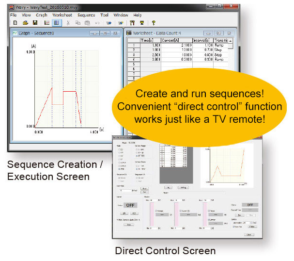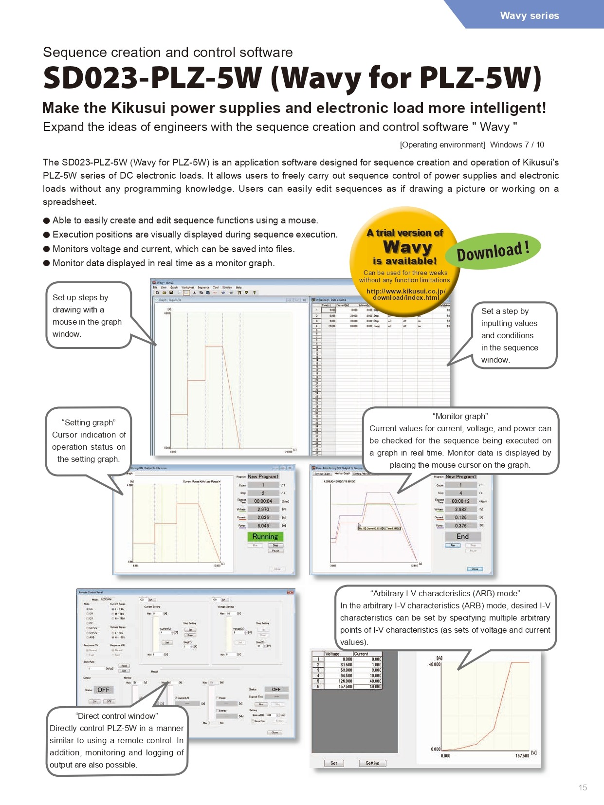 'Wavy for PLZ-5W(SD023-PLZ-5W)'는 기쿠스이제 전자 부하장치의 시퀀스 작성·실행을 지원하기 위한 소프트웨어입니다. Wavy for PLZ-5W는 컴퓨터를 사용하여 생각한 대로 시퀀스 패턴을 직감적이고 시각적으로, 프로그램 언어를 전혀 모르는 분도 쉽게 만들 수 있도록 개발되었습니다. 전압·전류 모니터링, 로깅 등 리모컨 감각으로 조작 가능하도록 되어 있습니다.