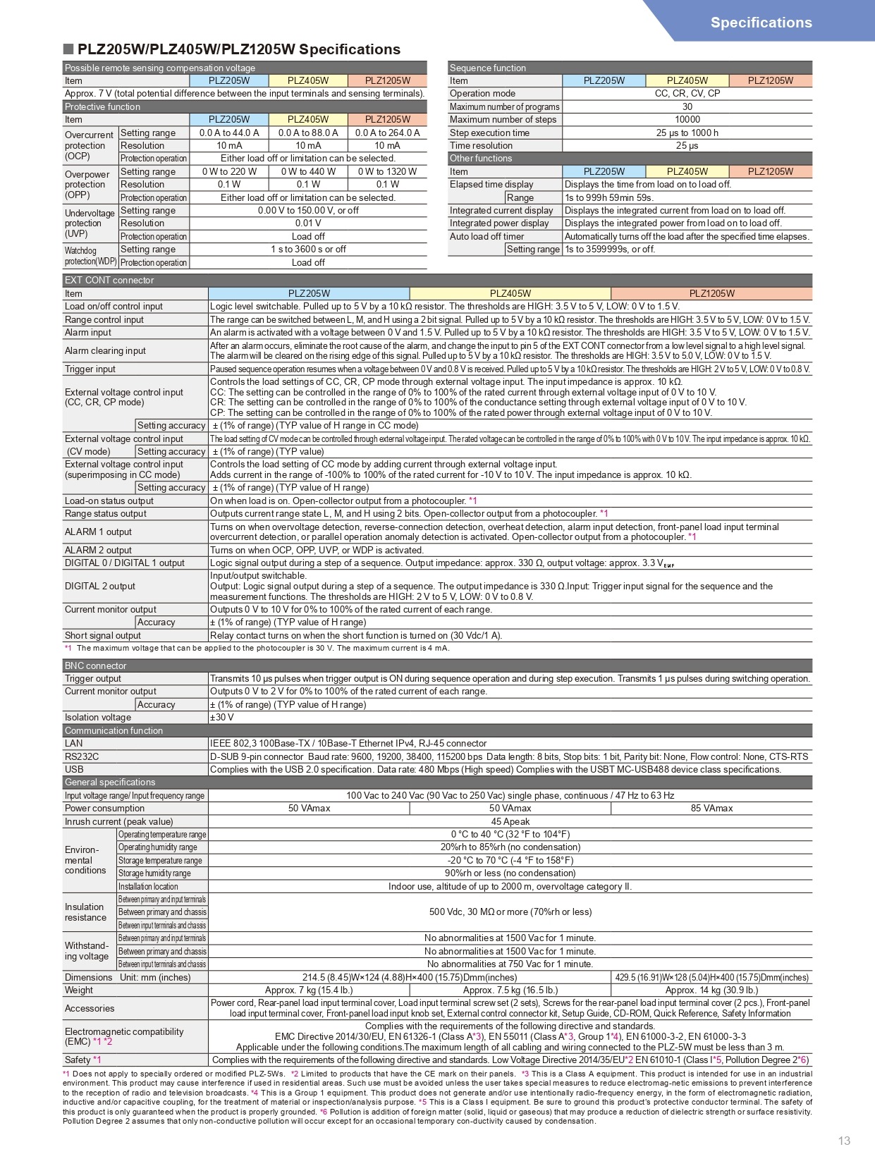 | PLZ1205W | 직류 전자 부하장치. 최대 1200W, 1~150V, 240A. 정전류·정저항·정전압·정전력·정전류+정전압·정저항+정전압의 각 모드 및 비직선의 부하 특성을 재현할 수 있는 '임의 IV 특성(ARB) 모드'를 탑재. 상승시간 환산으로 4μs의 고속 응답 |