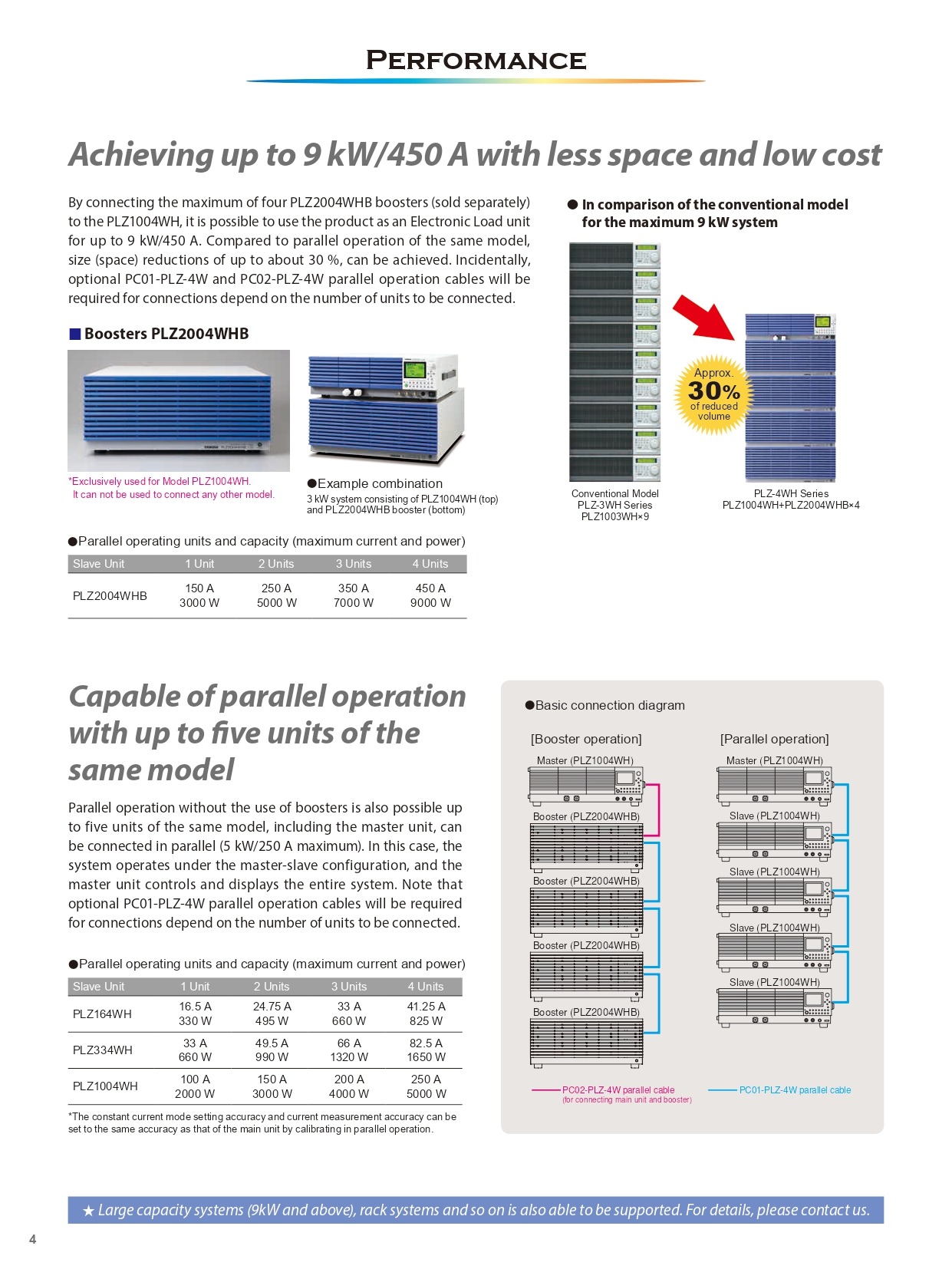 대용량화를 낮은 비용으로 실현하기 위해 PLZ1004WH에는 부스터로서 PLZ2004WHB*를 준비하고 있습니다. 1대의 PLZ1004WH를 마스터기로서 부스터를 최대 4대까지 병렬 접속할 수 있습니다.(최대9kw, 450A)
