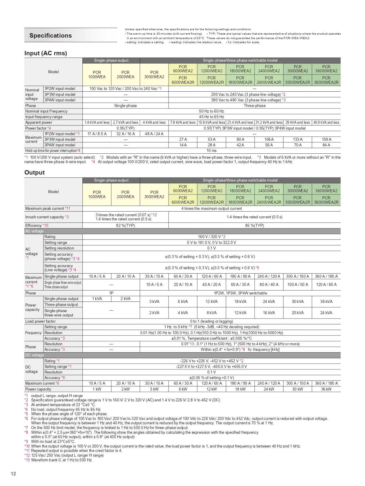 | PCR12000WEA2 | 단상 12 kVA / 단상 3선 8 kVA / 3상 12 kVA, AC0 ~ 320 Vrms, 1 Hz ~ 5 kHz, DC0 ~ ±452V, PWM 유형 |