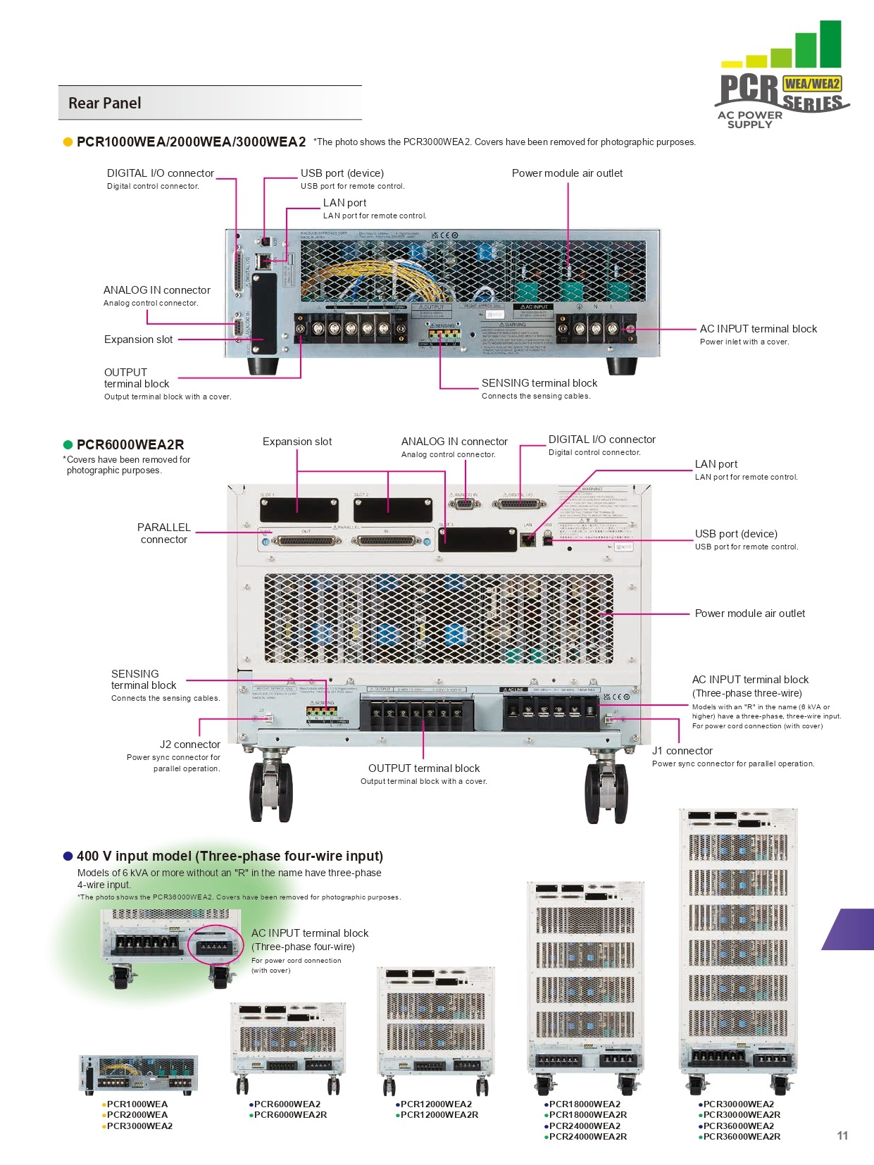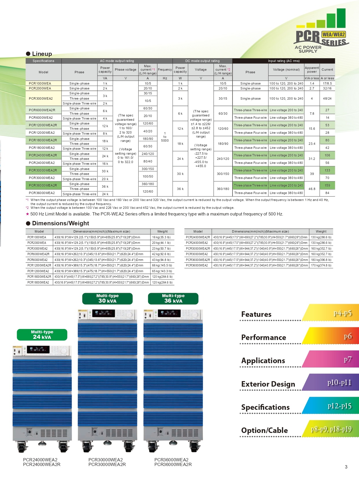 | PCR3000WEA2 | 단상 3 kVA / 단상 3선 2 kVA / 3상 3 kVA, AC0 ~ 320 Vrms, 1 Hz ~ 5 kHz, DC0 ~ ±452V, PWM 유형 |