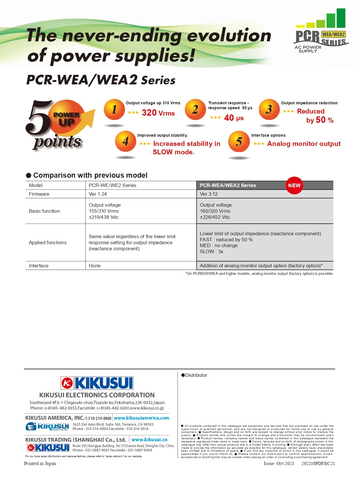 | PCR2000WEA | 단상 2 kVA, AC0 ~ 320 Vrms, 1 Hz ~ 5 kHz, DC0 ~ ±452V, PWM 유형 |