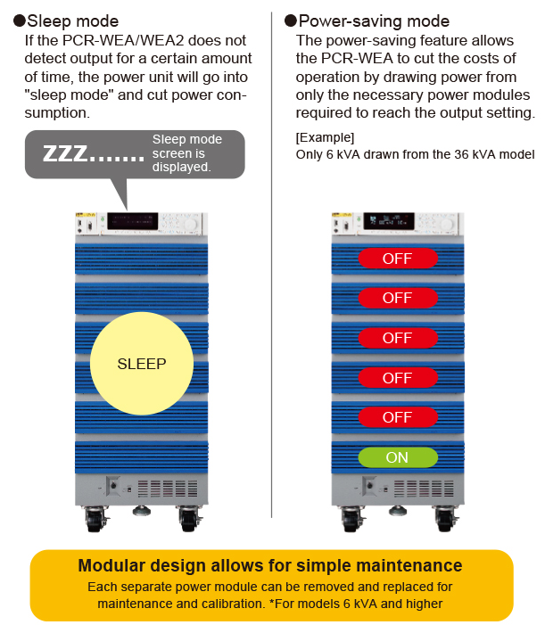 PCR-WEA/WEA2 시리즈는 초소형 고전력 밀도, 고성능 PWM 인버터 방식의 대용량 교류 및 직류 안정화 전원입니다. 최대 전력 1kVA,2kVA, 3kVA, 6kVA, 12kVA, 18kVA, 24kVA, 30kVA, 36kVA의 전체 15모델입니다. 6U에서 6kVA의 파워를 자랑하는 고전력 밀도 사양, 케이스 하나에서 36kVA 모델까지 있습니다. 3kVA 이상은 멀티 타입에서 단상/단상 3선/3상 출력의 전환이 가능합니다. (PCR-WEA2/WEA2R) 그리고 회생 기능 *1 이 탑재된 모델 라인업도 있습니다. (PCR-WEA2R) 또한, 병렬 운전 *2 케이블에 따라 최대 144kVA까지 확장이 가능합니다.