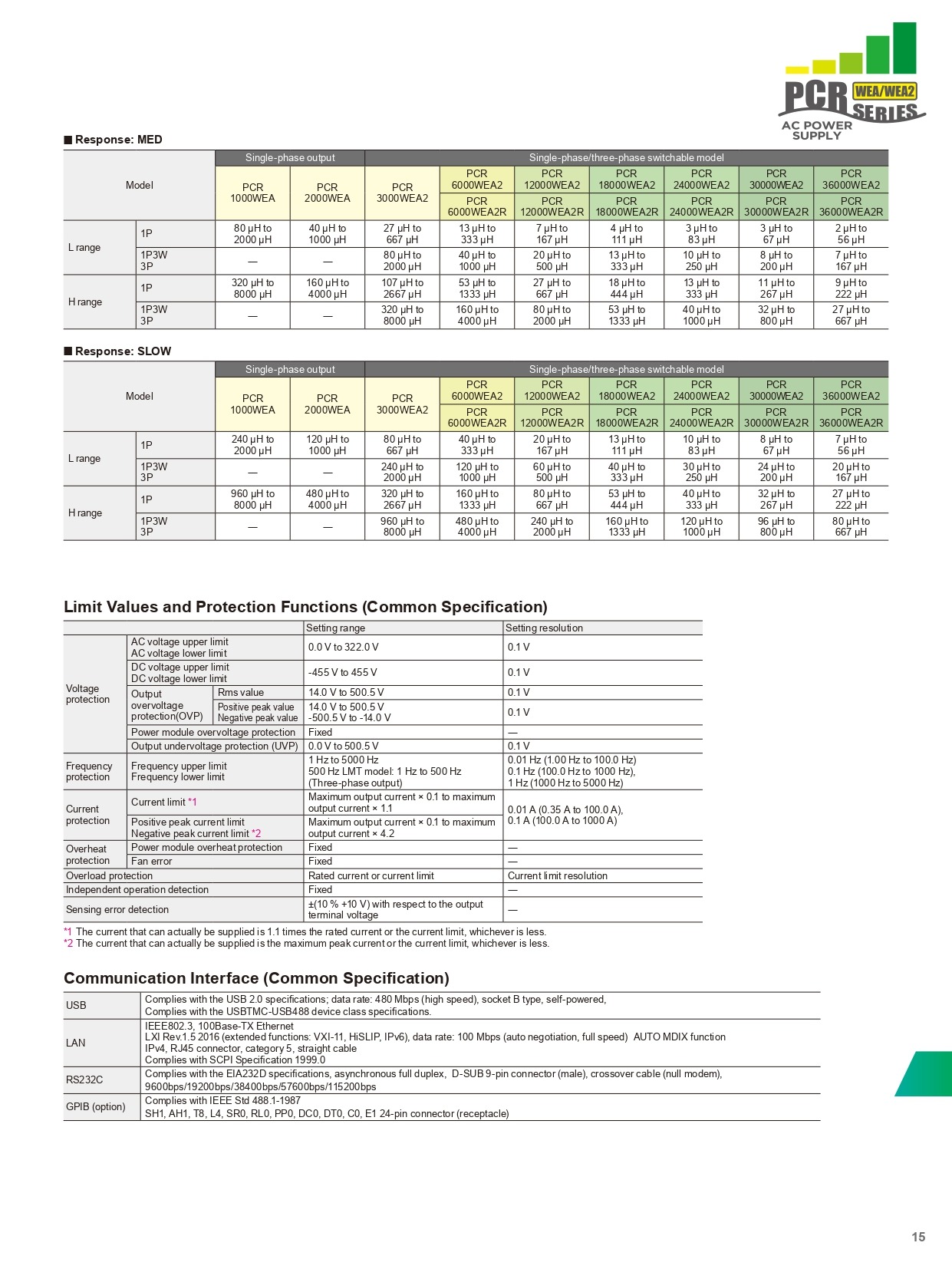| PCR18000WEA2 | 단상 18 kVA / 단상 3선 12 kVA / 3상 18 kVA, AC0 ~ 320 Vrms, 1 Hz ~ 5 kHz, DC0 ~ ±452V, PWM 유형 |