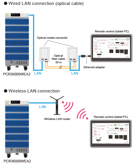 PCR-WEA / WEA2 표준은 LAN, USB, RS232C와 같은 데이터 인터페이스를 갖추고 있습니다. (GPIB는 선택 사항입니다.) 특히 LAN은 LXI를 지원하며 컴퓨터, 스마트 폰 및 태블릿과 같은 웹 브라우저에서 모니터링 할 수 있습니다.예를 들어 다른 건물에있는 PCR-WEA / WEA2의 원격 제어 관리도 손쉽게 있습니다.전파 암실 / 실드 룸에 사용하는 교류 안정화 전원은 LAN (LXI) 장거리 원격 제어에 대응하는 것도 중요한 요소입니다.