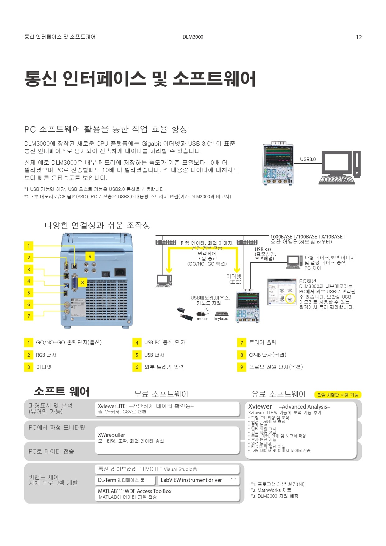 DLM3000의 완전히 새로워진 CPU 플랫폼은 기가비트 이더넷 및 USB3.0(파일 전송)을 표준 통신 인터페이스로 장착하여 이전보다 신속하게 데이터를 처리합니다. 또한, DLM3000은 내부 저장 장치에 SSD를 채택하여 저장 속도를 10배 이상 빠르게 구현하였으며, PC 전송 속도 역시 10배 이상 빨라졌습니다.