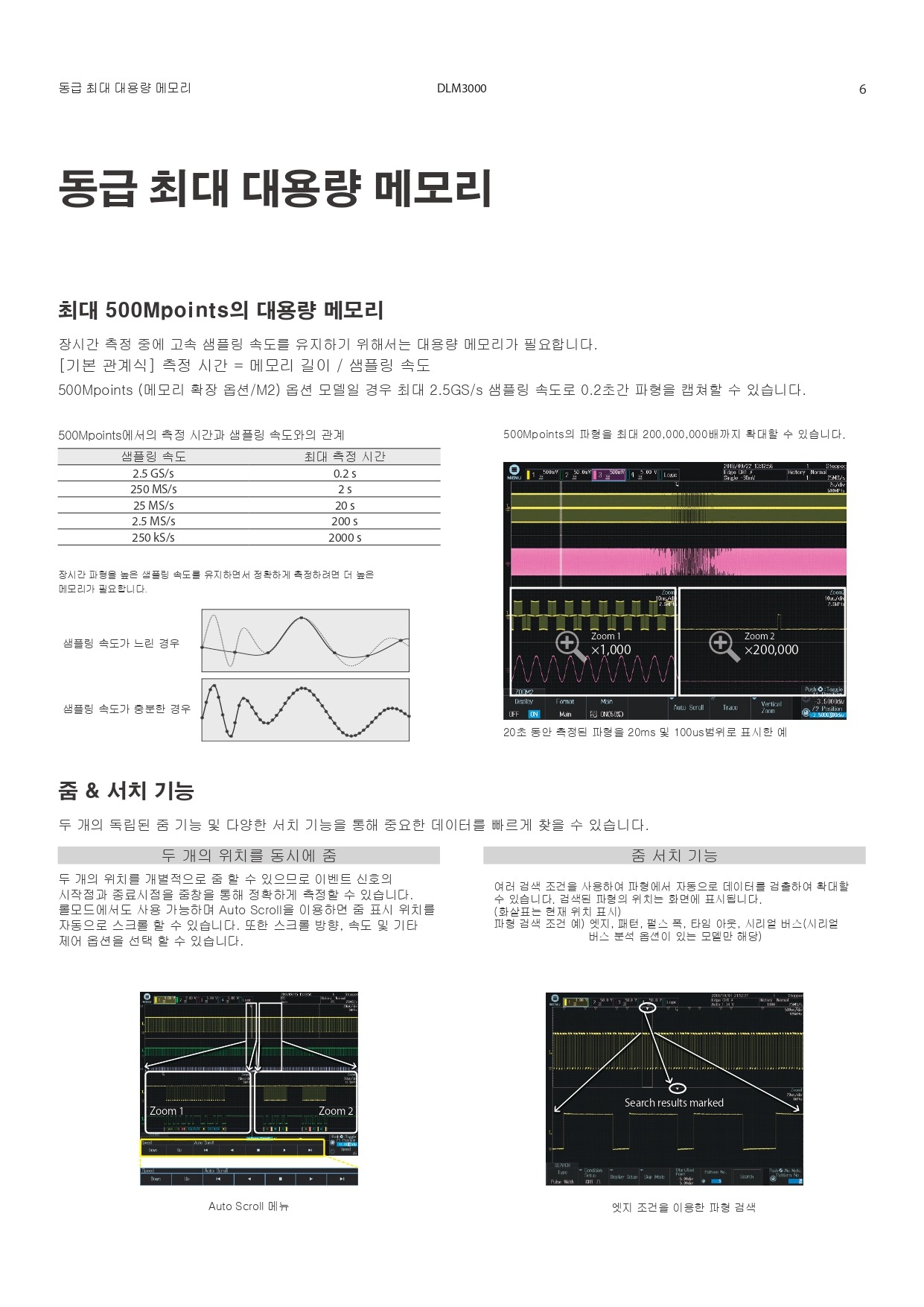 원인과 결과에 대한 상관관계를 측정하기 위해 12.5Mpoints(반복 수집) 또는 125Mpoints(단일 인터리브)의 긴 메모리는 표준으로 탑재됩니다. 최대 50M / 500Mpoints 의 옵션을 사용할 수 있습니다.