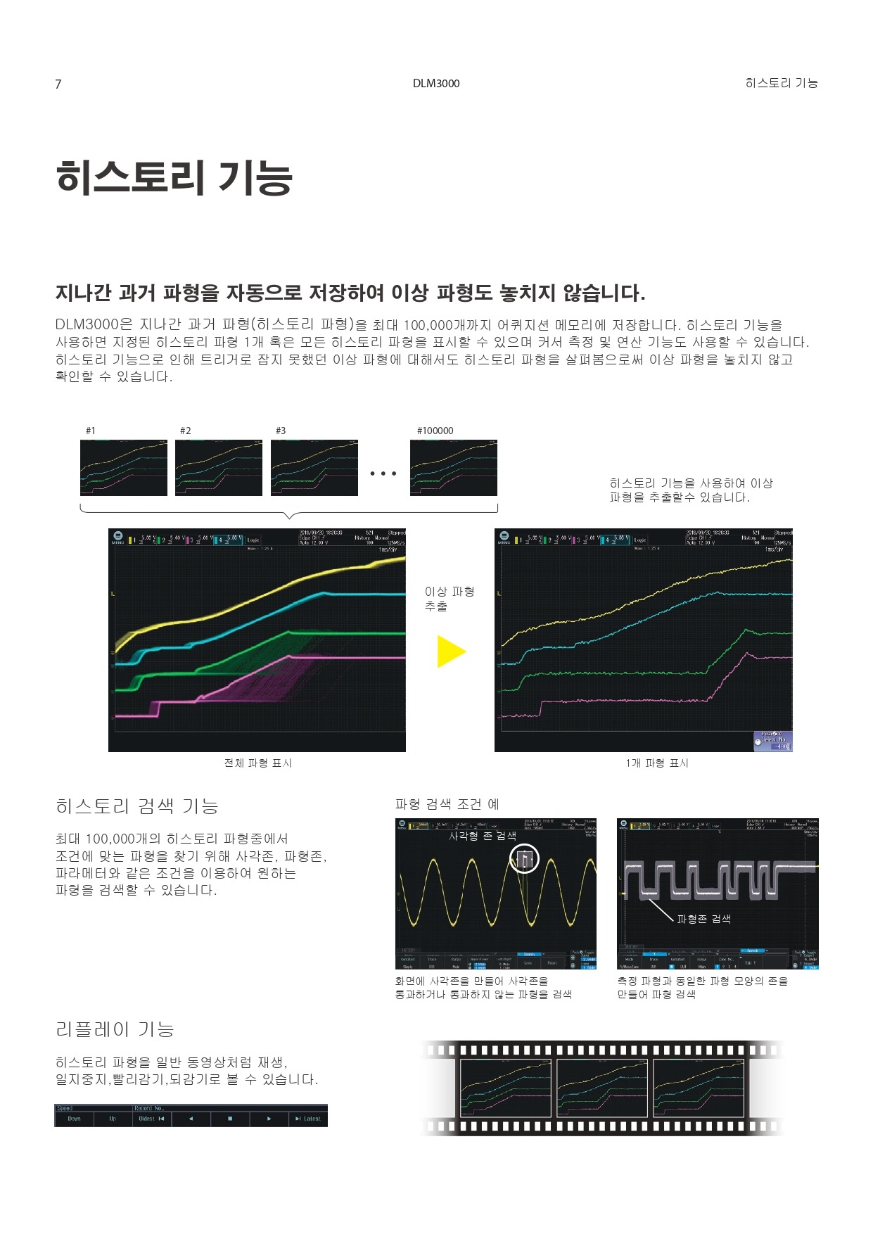 이 때 필요한 광범위한 데이터를 제공하기 위해 요꼬가와 오실로스코프는 대형 내부 저장 매체를 활용하여 이전 캡쳐 이벤트의 데이터를 저장합니다. 실제 파형 데이터가 저장되기 때문에 이러한 이벤트는 히스토리 기능을 사용하여 탐색, 시각화 측정 및 검색에 사용할 수 있습니다.