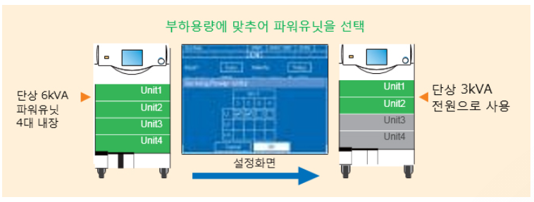 DP시리즈의 본체는 파워부를 1.5kVA 단위로 구성되어 있습니다. 부하 용량에 맞추어 파워부를 ON/OFF할 수 있어 소비전력을 낮춘 효률적인 작동을 할 수 있습니다.