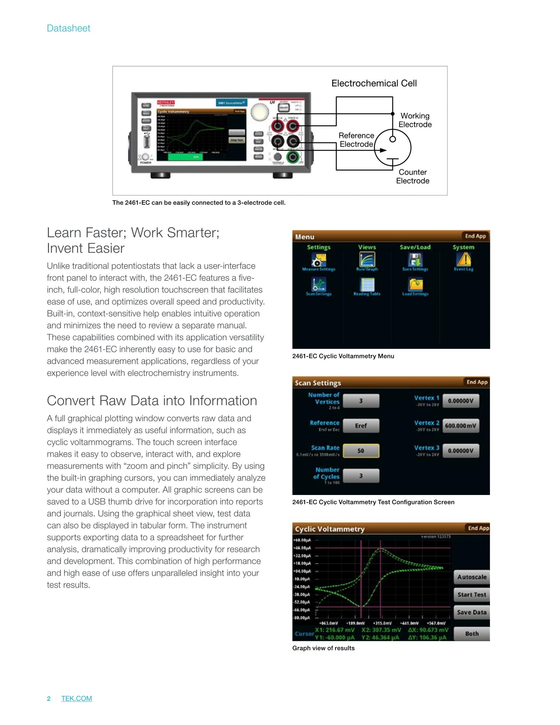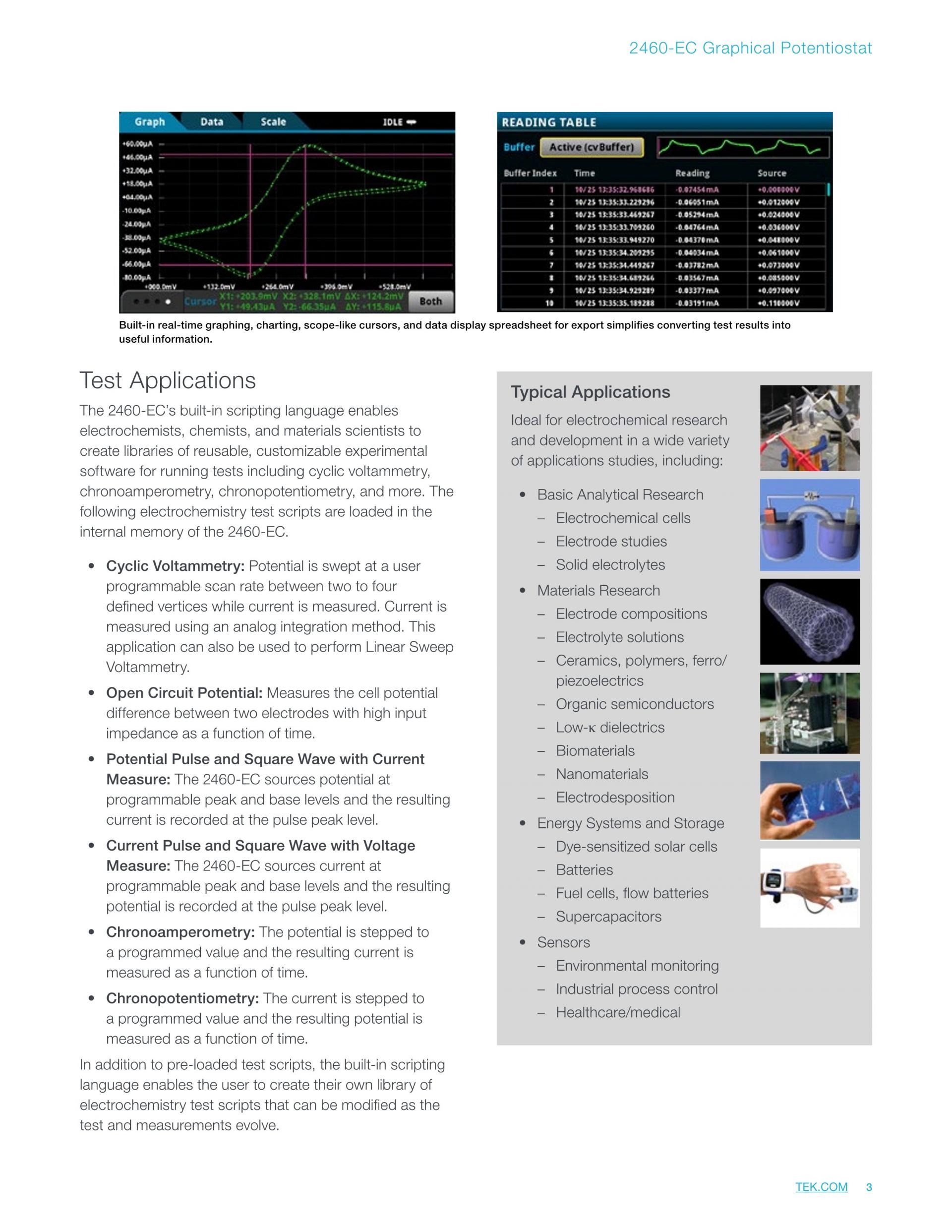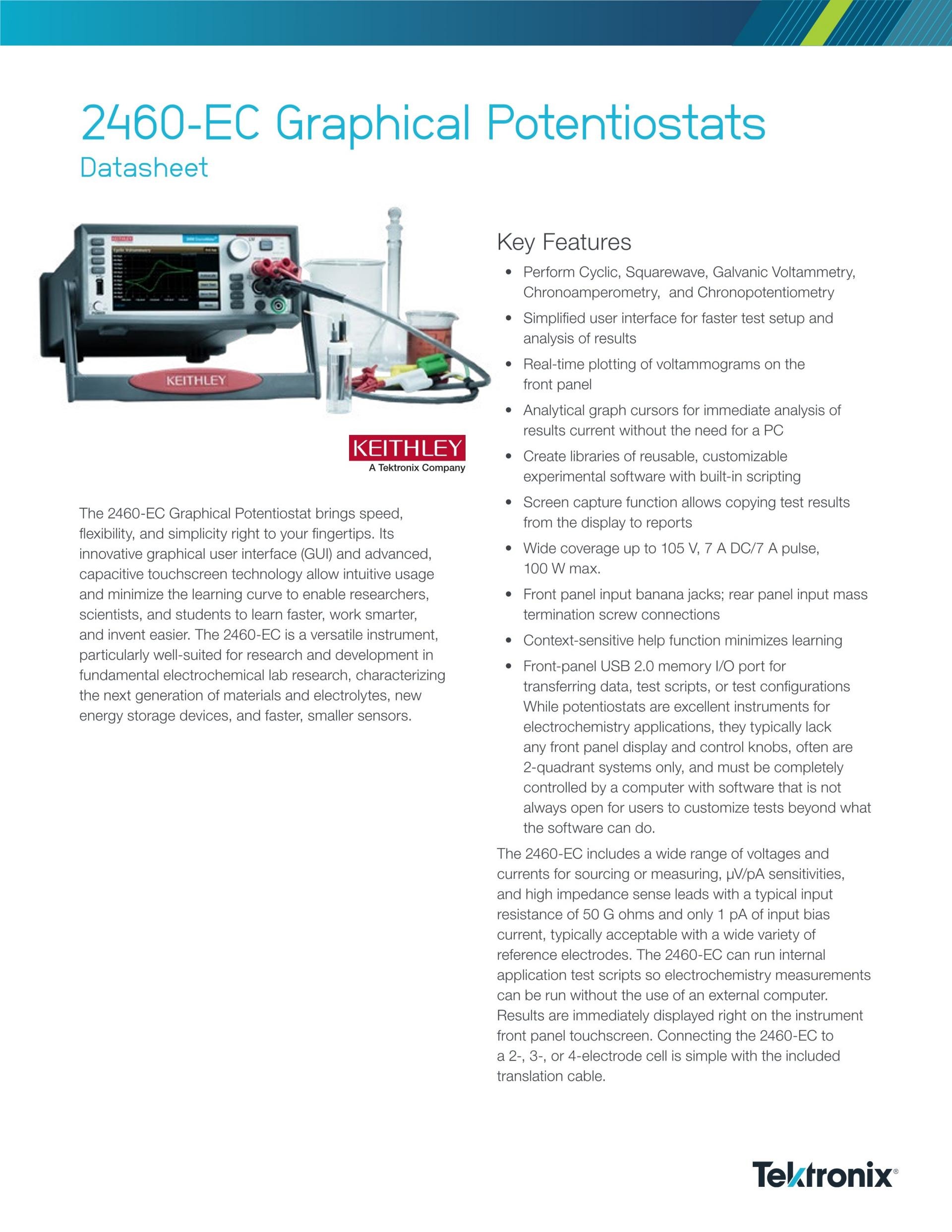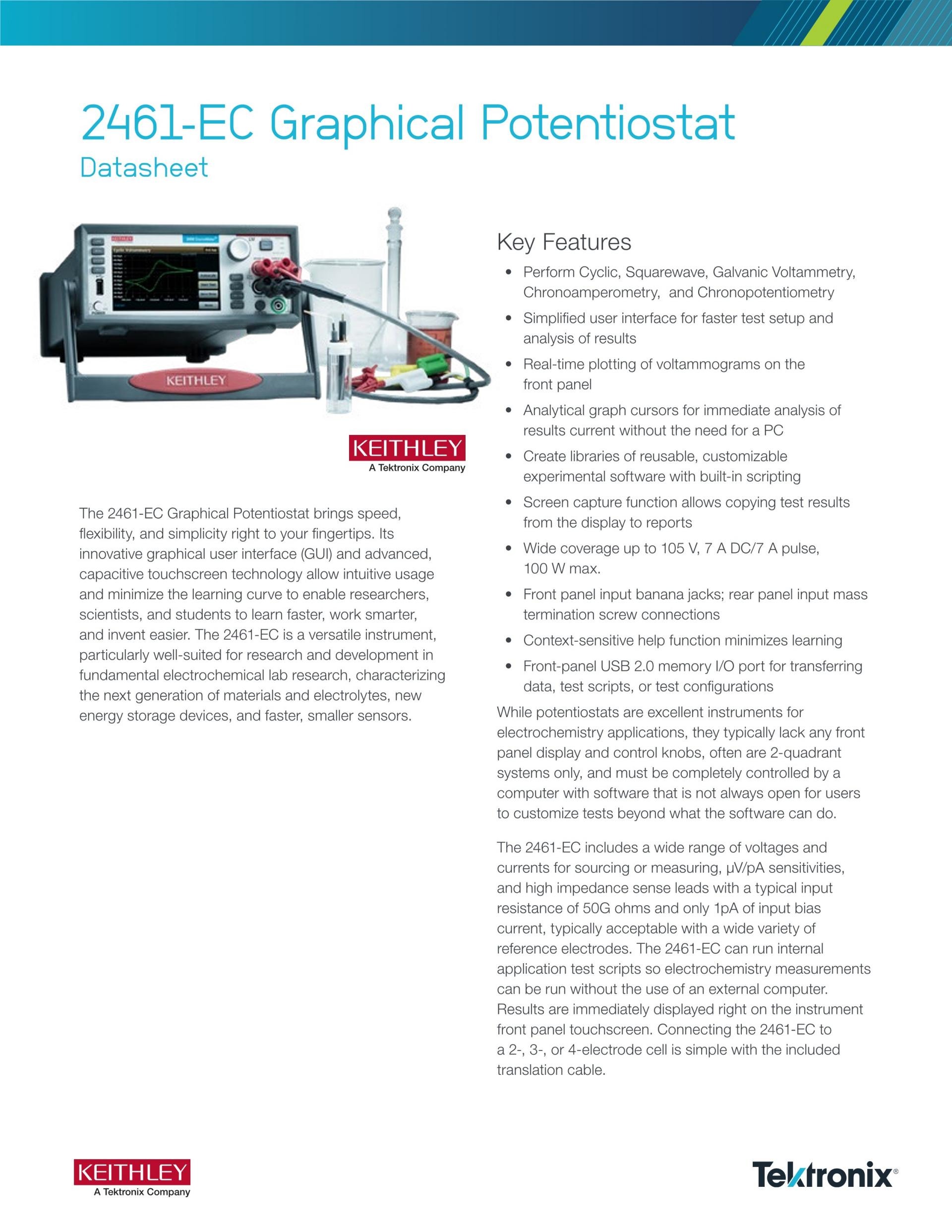 유연성이 뛰어나며 가격이 저렴한 2450-EC, 2460-EC 및 2461-EC 전위 가변기는 기본적인 전기 화학 실험실 연구의 연구/개발, 차세대 소재/전해질 특성화, 새로운 에너지 스토리지 장치, 그리고 속도는 더 빠르고 크기는 더 작은 센서 등에 사용하기에 적합합니다.