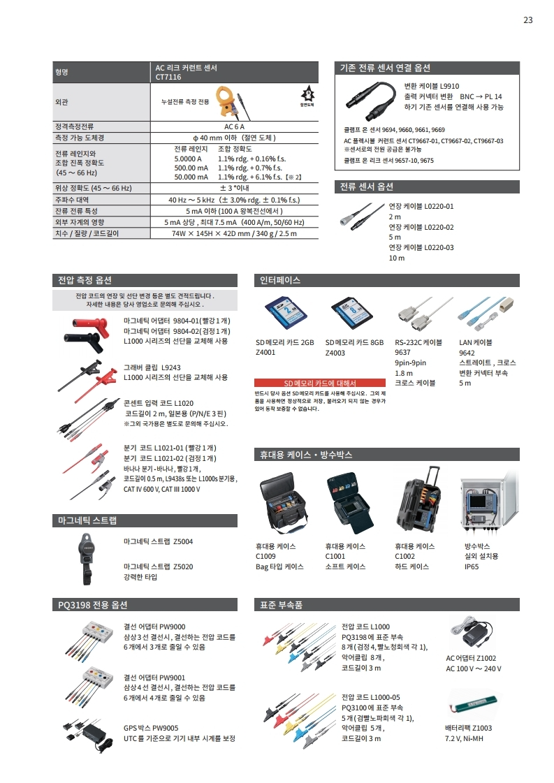 세트 내용물 : AC 커런트 센서 CT7136 (600A) × 4, PQ3100 본체, SD 메모리 카드 2GB Z4001, 휴대용 케이스 C1009 각 1