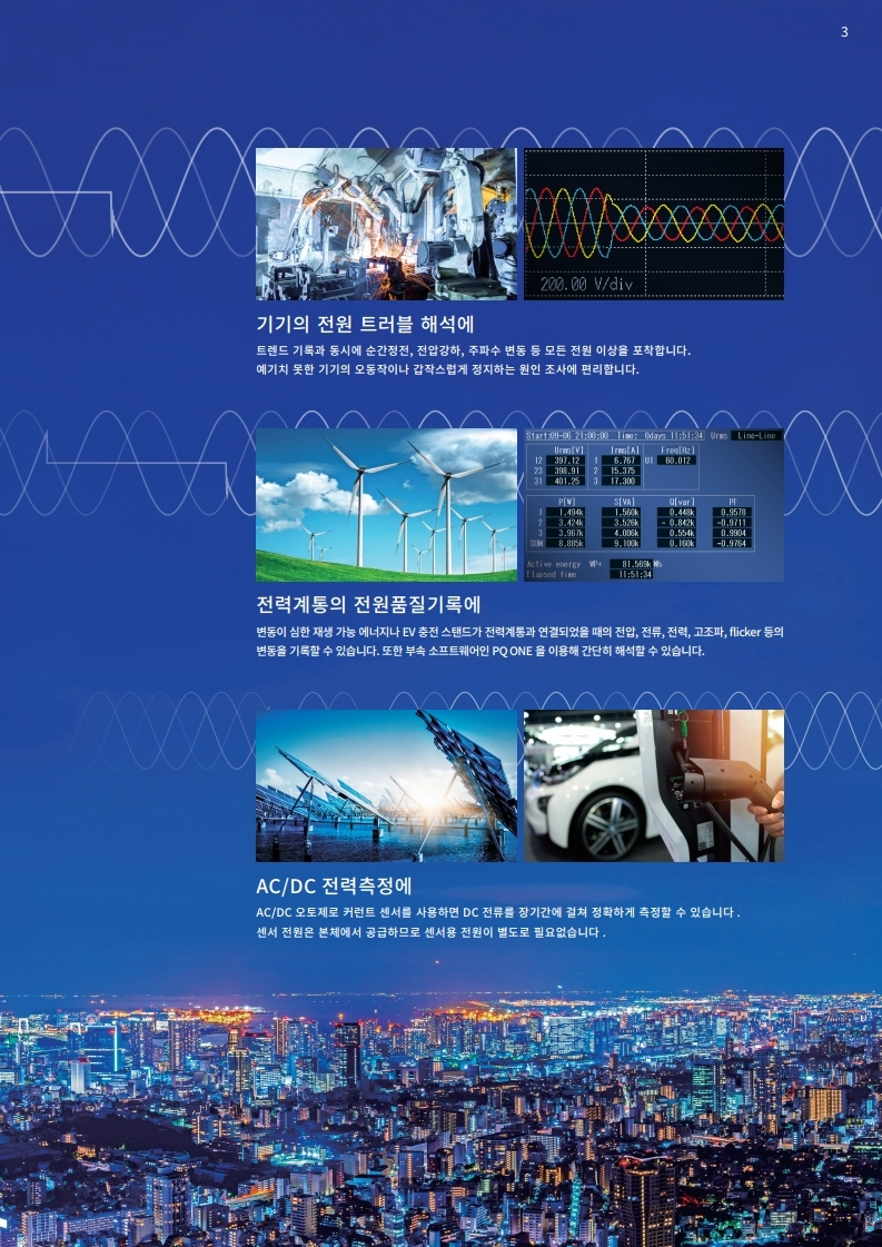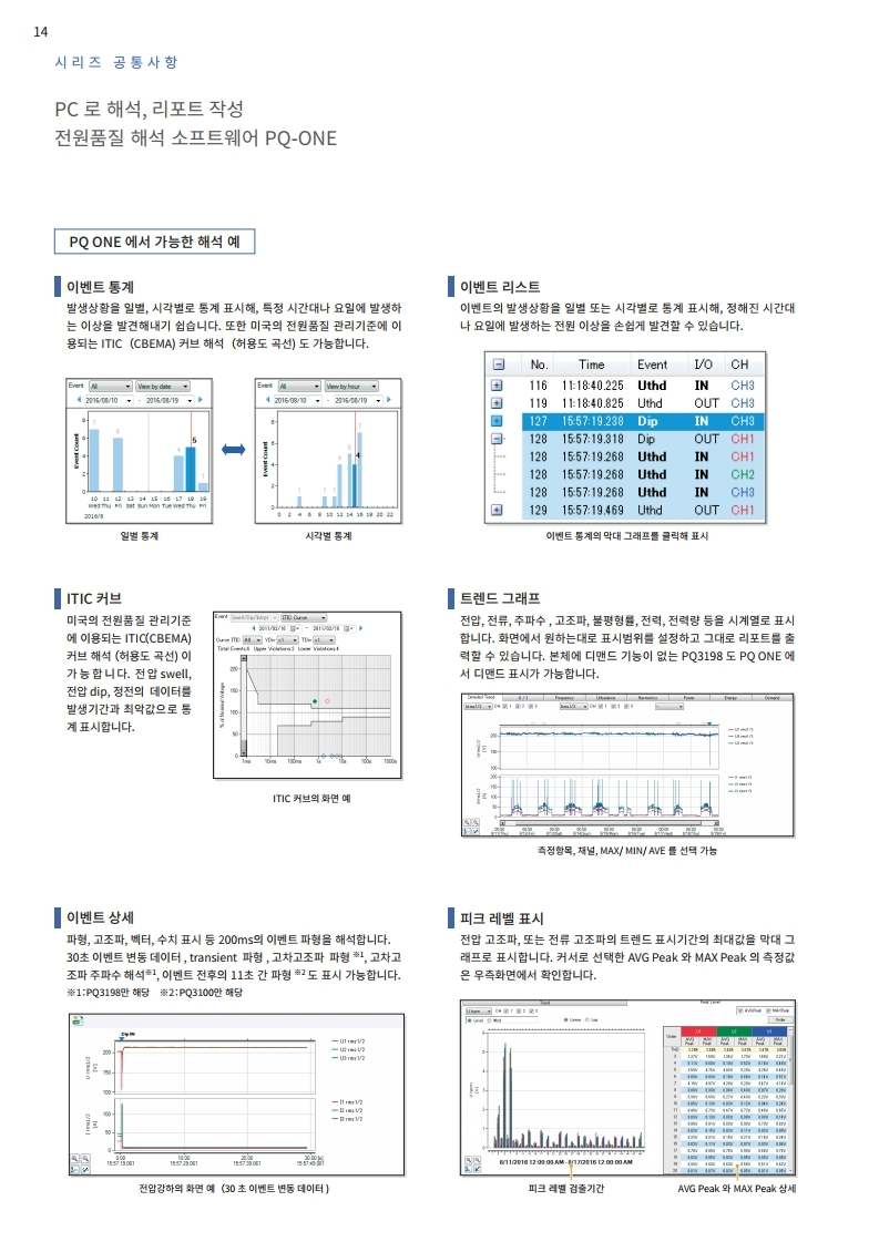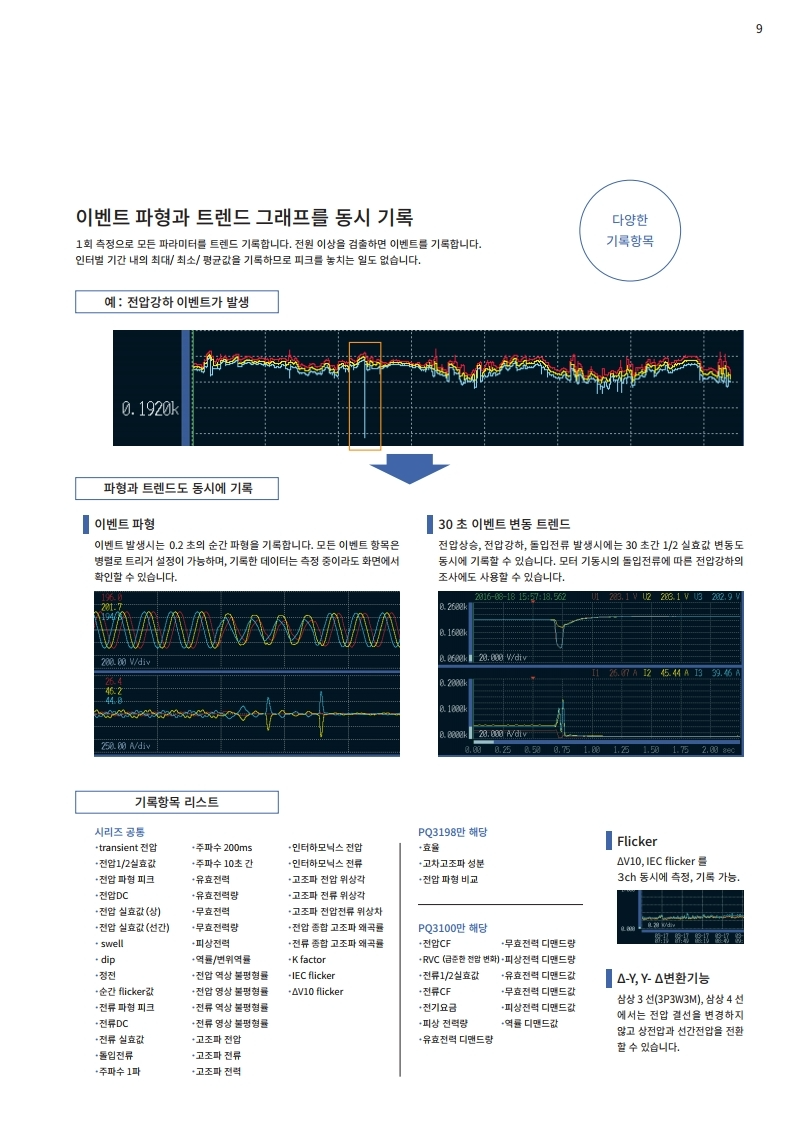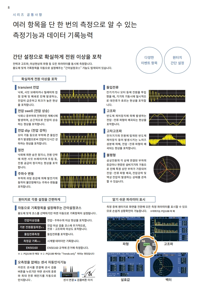 전압, 전류, 전력, 고조파, 플리커 등 모두를 동시에 시계열로 측정. 트랜드 기록과 동시에 순시 정전, 전압 강하, 주파수 변동 등 모든 전원 이상을 포착합니다