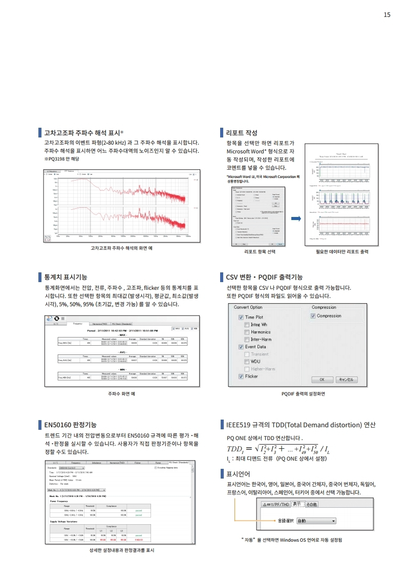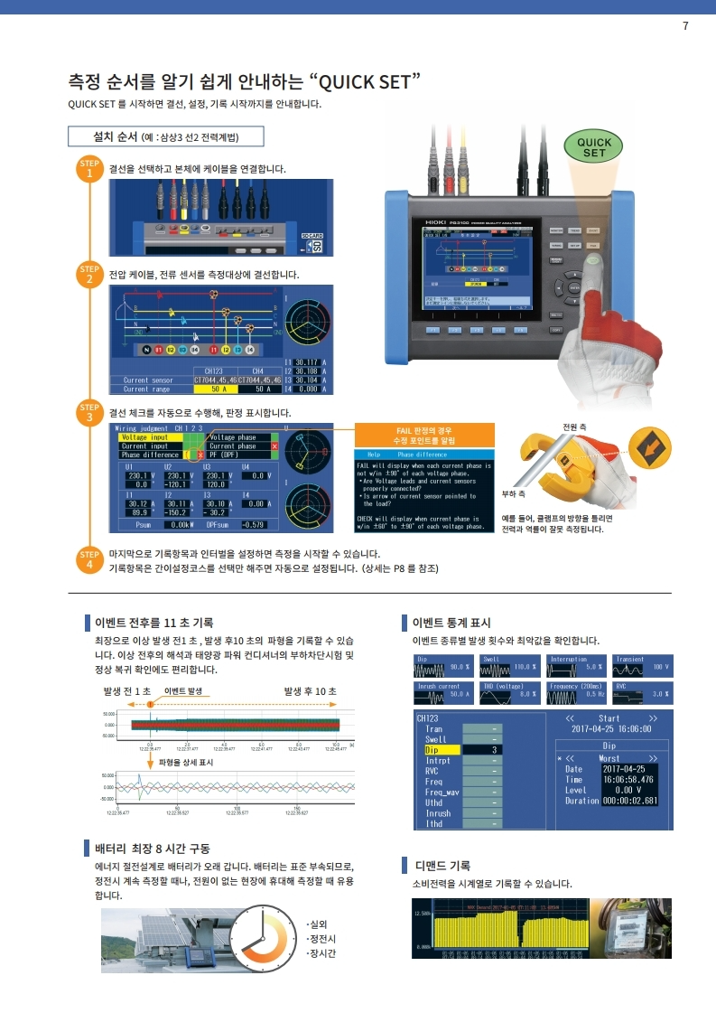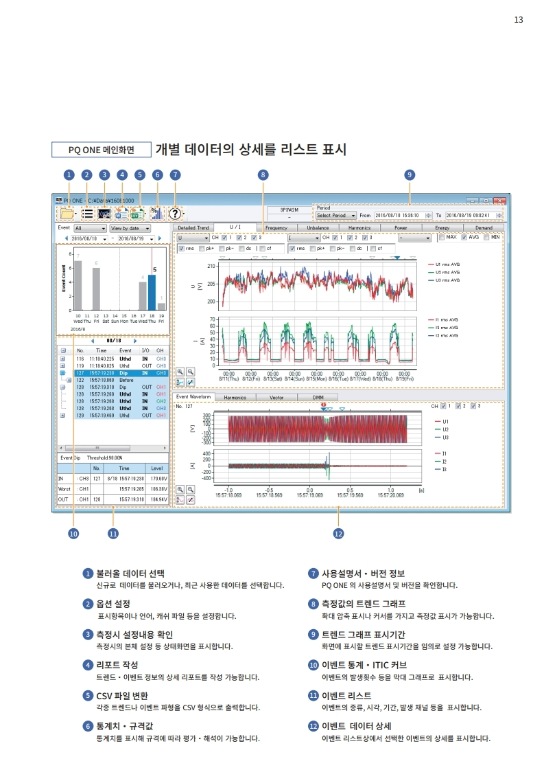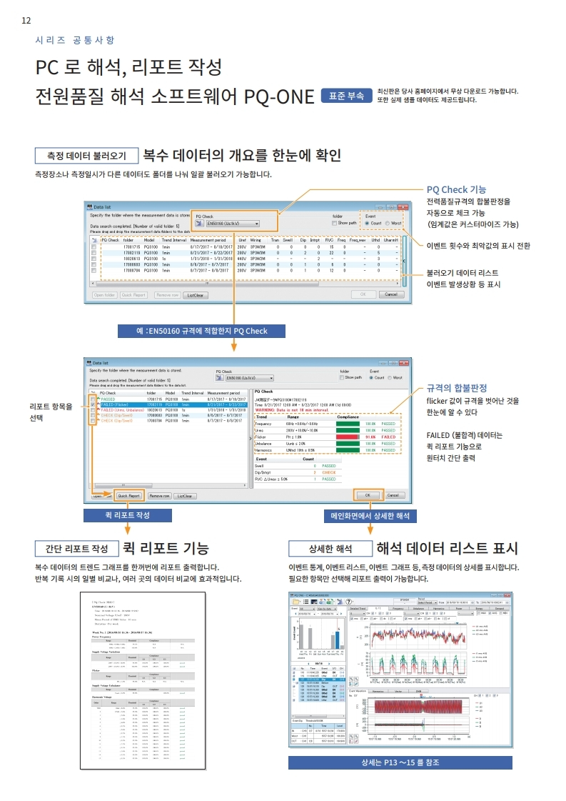 전압, 전류, 전력, 고조파, 플리커 등 모두를 동시에 시계열로 측정. 트랜드 기록과 동시에 순시 정전, 전압 강하, 주파수 변동 등 모든 전원 이상을 포착합니다