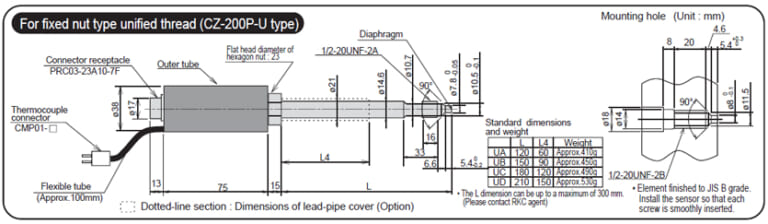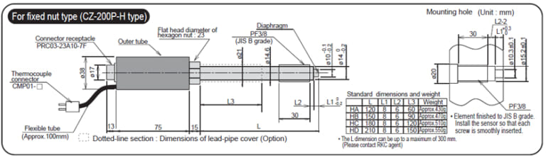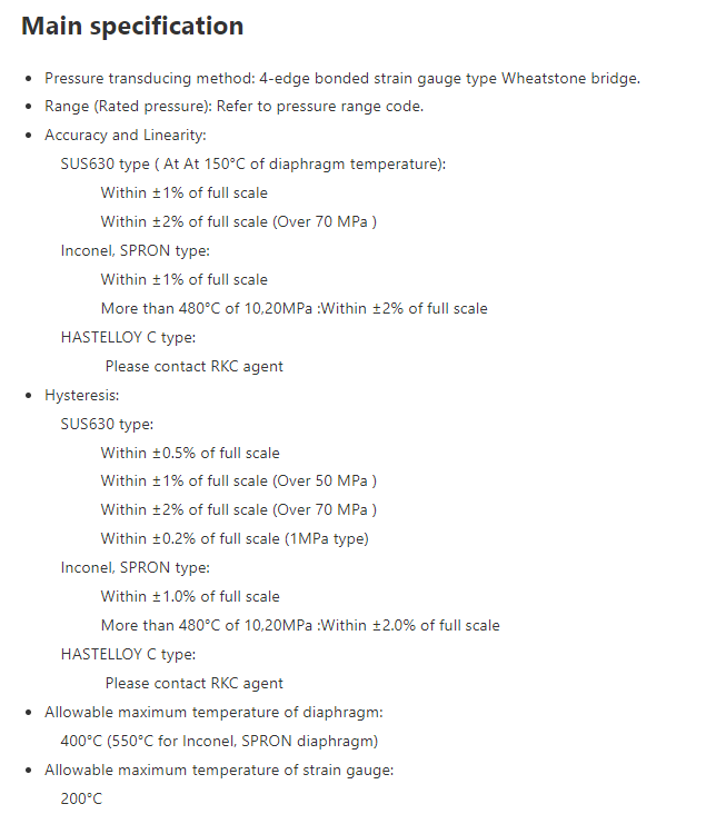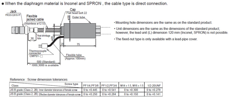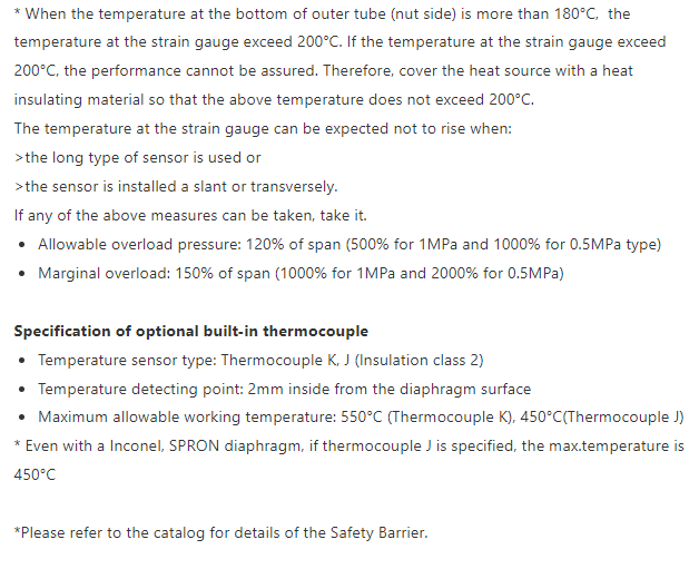 ![]() | Triple construction of the stem and the optional stem cover reduces influence by external heat and indication errors when the sensor is tightened. When used with an indicator or a converter with a built-in linearizer, the sensor enables highly accurate pressure measurement of 0.5% FS. (Linearizer is optional) |
