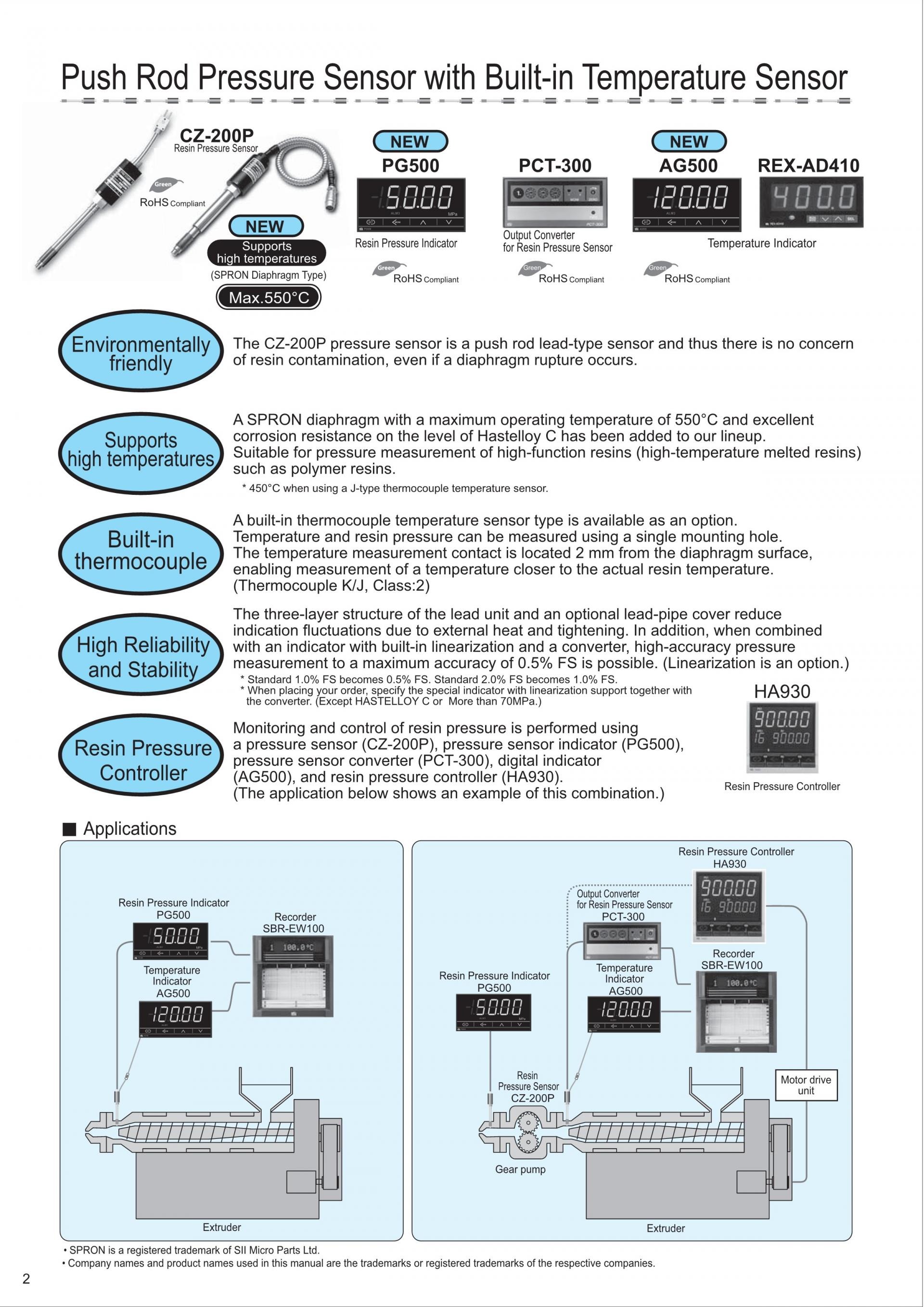 ![]() | The Inconel, SPRON diaphragm type enables operation at high temperature (max. 550°C*) . This enables pressure measurement of high performance plastic materials (high-melt plastics). The SPRON diaphragm type is Attains the same corrosion resistance as Hastelloy C. *When the temperature sensor is type J, the maximum temperature is 450°C. |