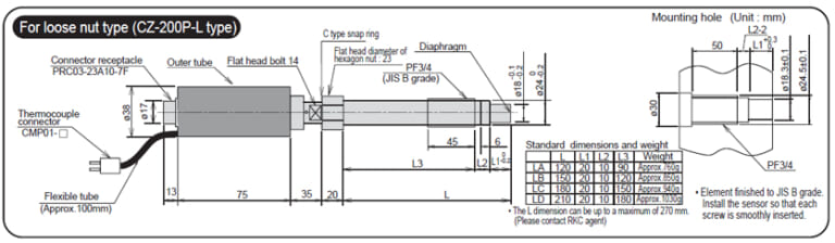 ![]() | Available with an optional built-in thermocouple Temperature and resin pressure can be measured in a single mounting hole. (Thermocouple: type K, J class 2) |