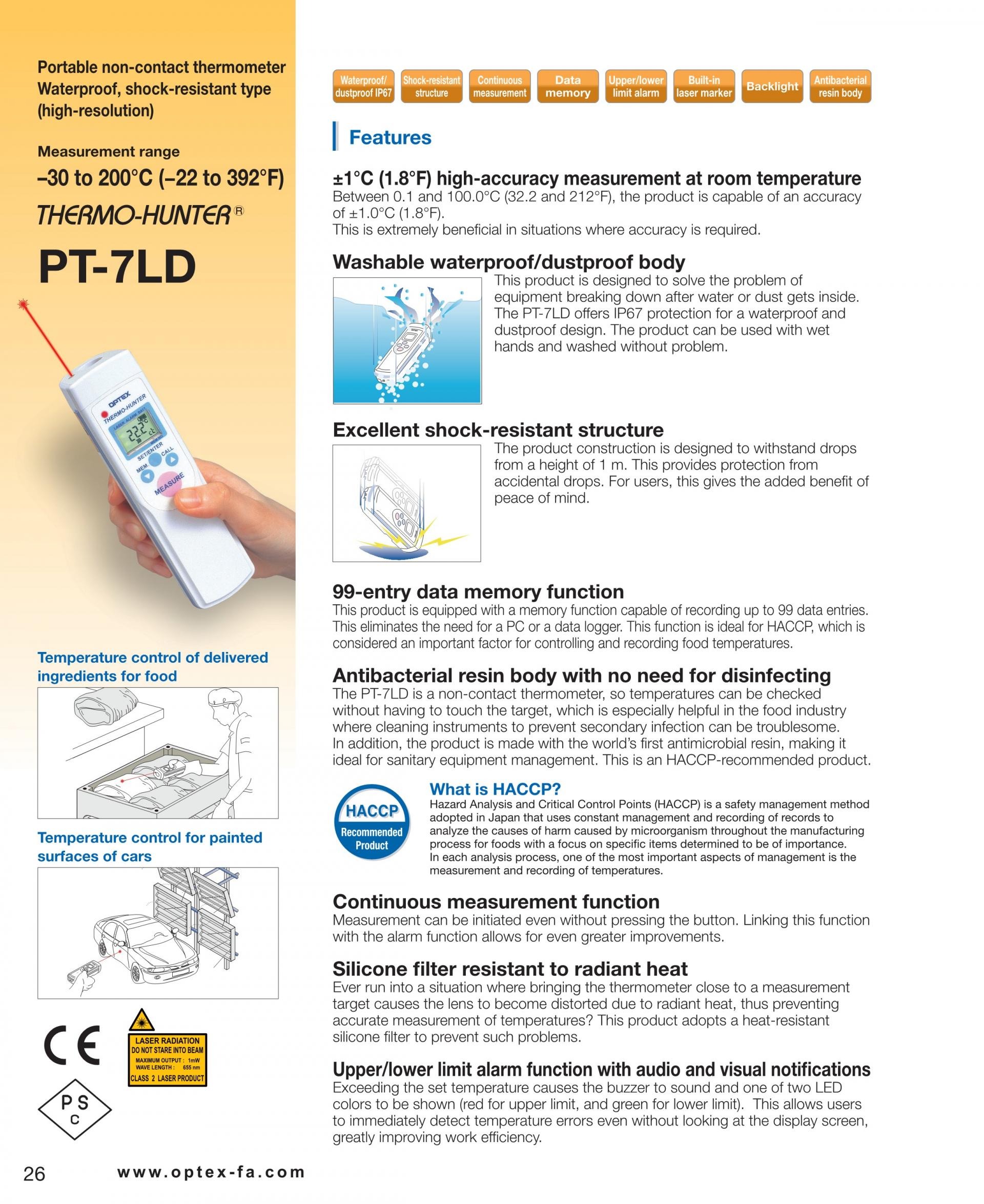 The PT-7LD is a non-contact thermometer, so temperatures can be checked without having to touch the target, which is especially helpful in the food industry where cleaning instruments to prevent secondary infection can be troublesome. In addition, the product is made with the world’s first antimicrobial resin, making it ideal for sanitary equipment management. This is an HACCP-recommended product. |
