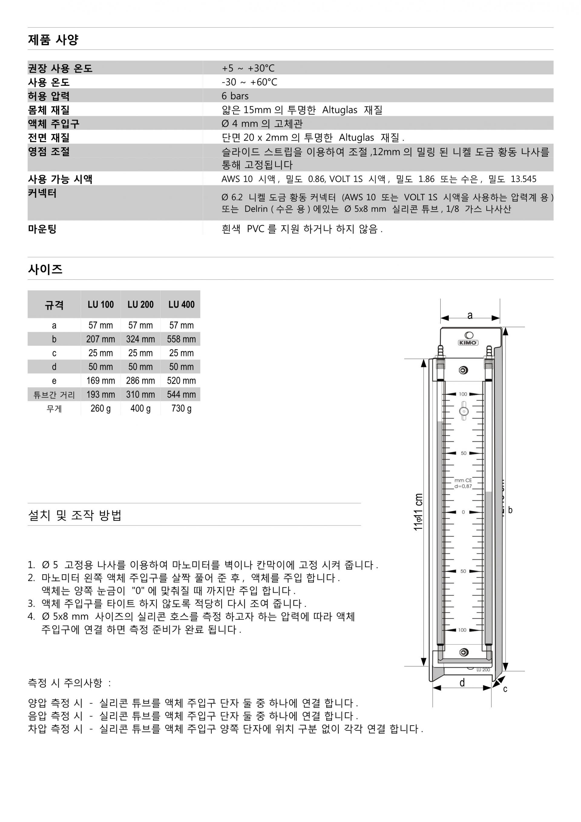 키모 KIMO LU 액주형 마노미터 시리즈 (U자형) LU 100 / LU 200 / LU 400