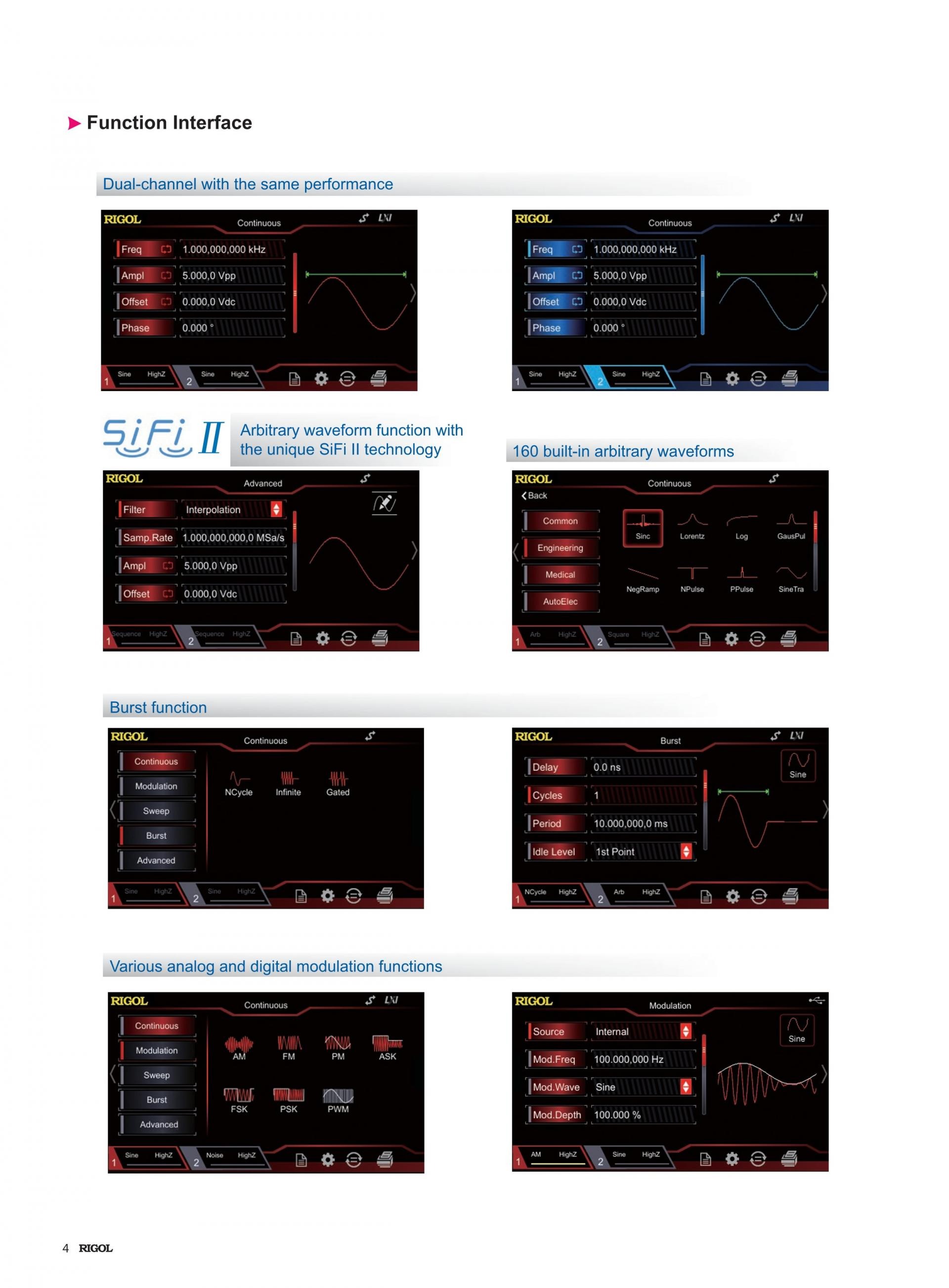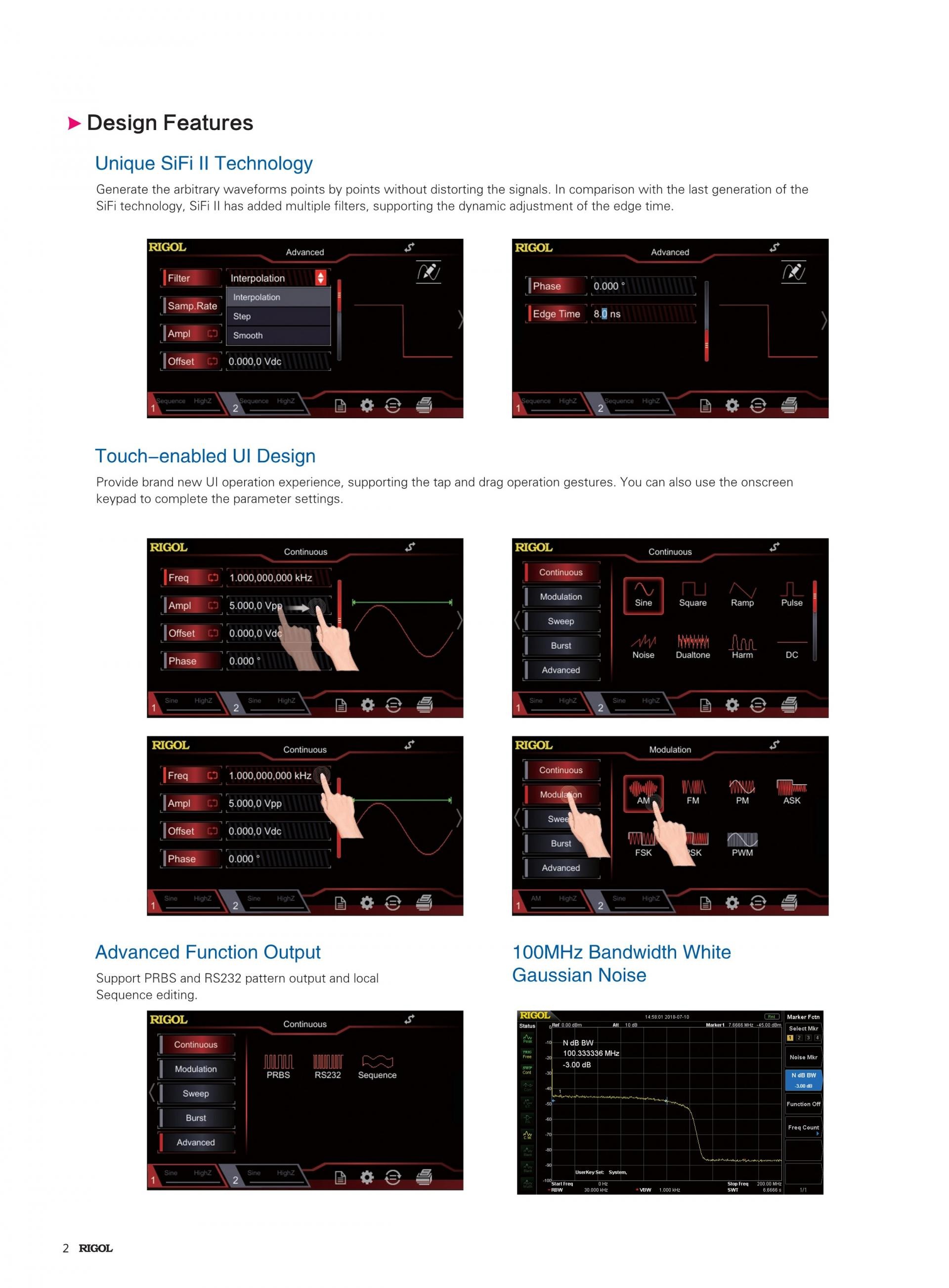 DG2000 시리즈 임의 파형 · 함수 발생기는 RIGOL가 개발 한 SIFI 기술을 탑재하고 있습니다. 포인트마다 임의의 파형을 생성하고 왜곡 없이 신호를 출력할 수 있습니다. 샘플링 속도는 기존 DDS 신호 발생기와 비교하여 정확하게 조정 가능하고, 200ps의 낮은 출력 신호 지터를 실현하고 있습니다.
