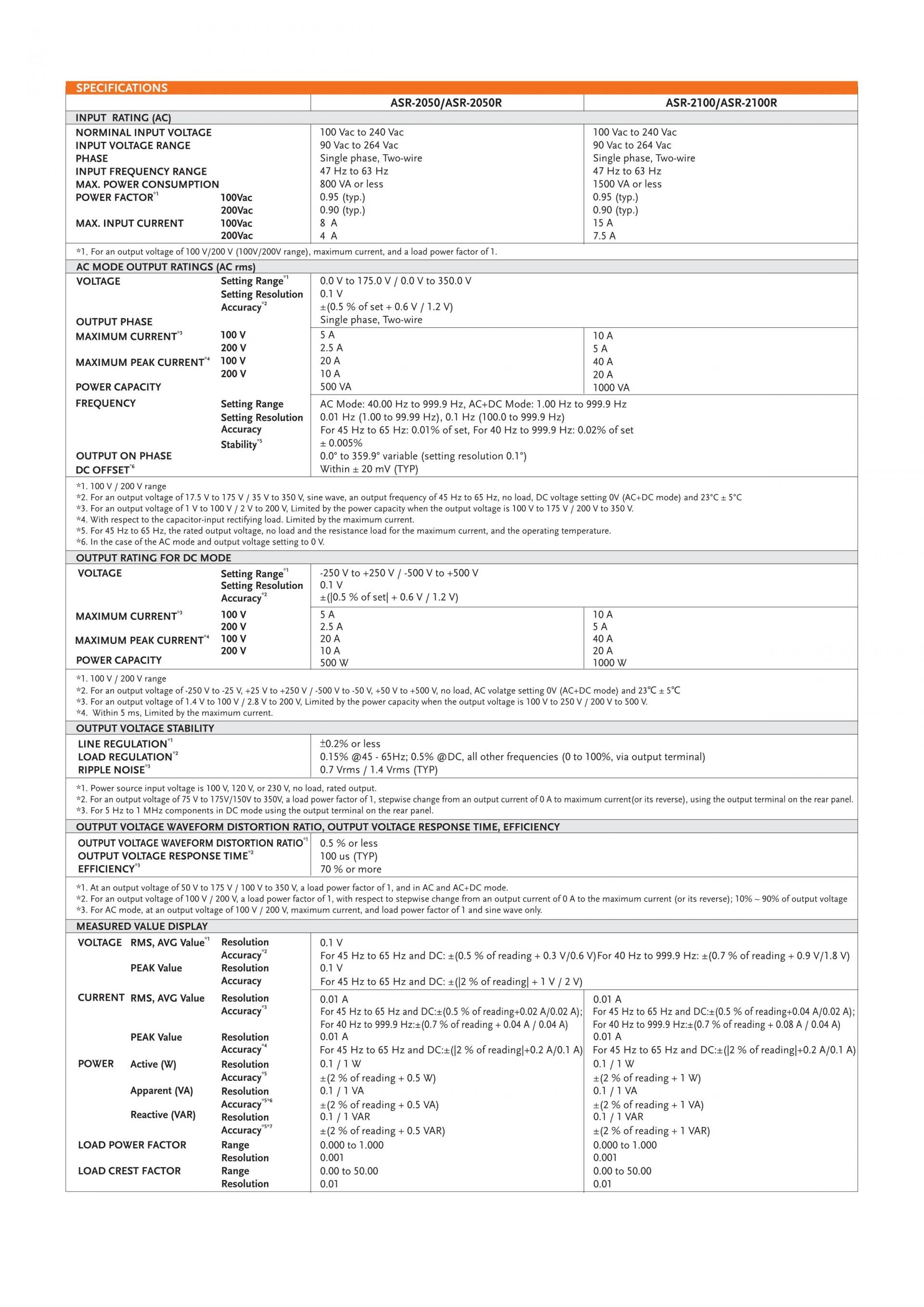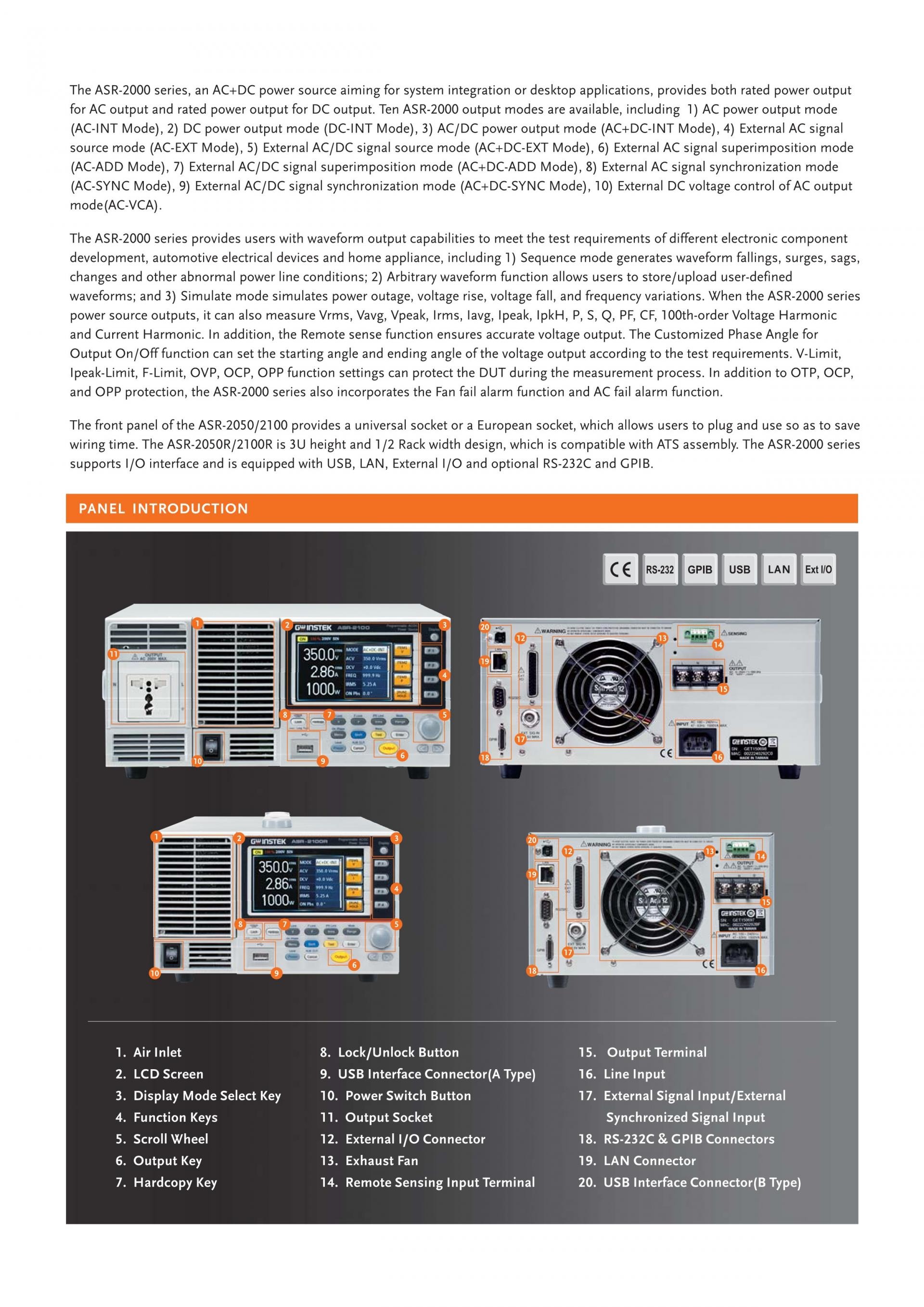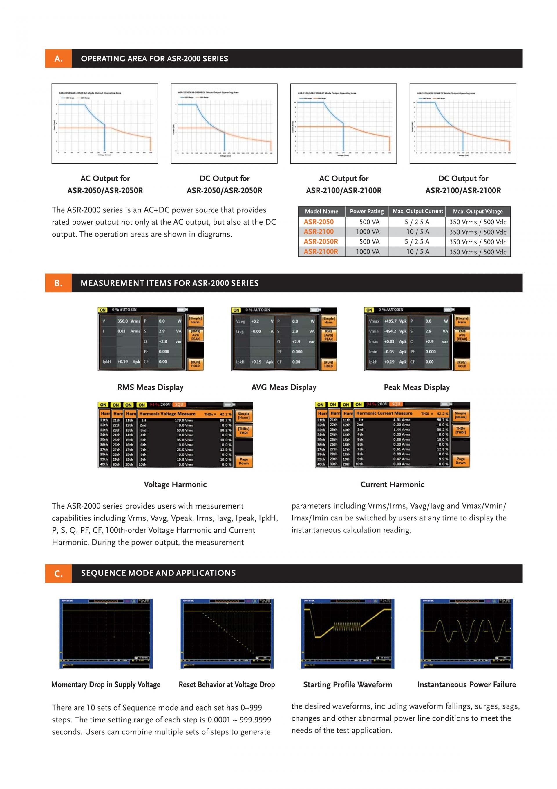 The ASR-2000 series, an AC+DC power source aiming for system integration or desktop applications, provides both rated power output for AC output and rated power output for DC output. Ten ASR-2000 output modes are available, including