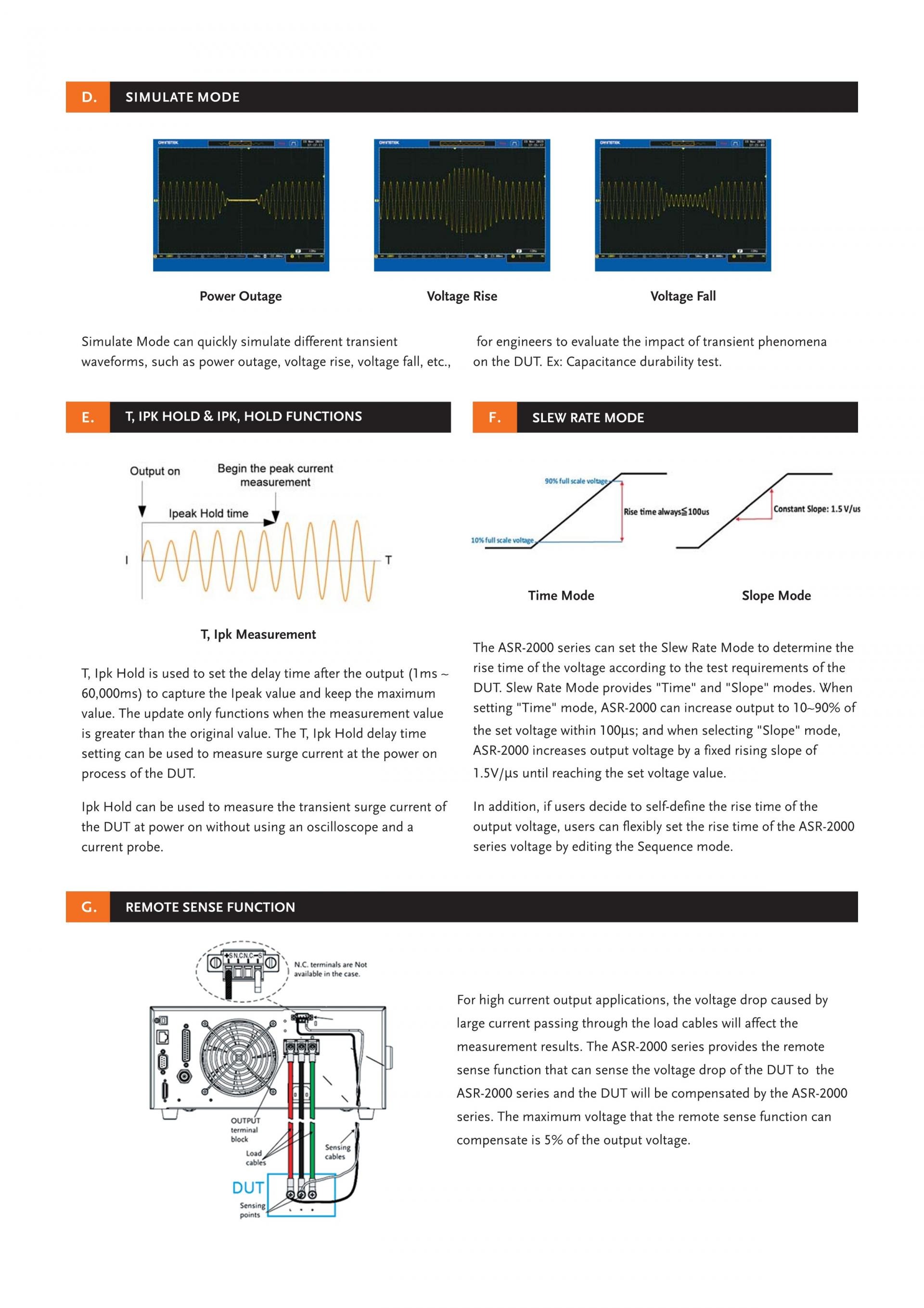 The ASR-2000 series provides users with waveform output capabilities to meet the test requirements of different electronic component development, automotive electrical devices and home appliance, including 1) Sequence mode generates waveform fallings, surges, sags, changes and other abnormal power line conditions; 2) Arbitrary waveform function allows users to store/upload user-defined waveforms; 3) Simulate mode simulates power outage, voltage rise, voltage fall, and frequency variations. When the ASR-2000 series power source outputs, it can also measure Vrms, Vavg, Vpeak, Irms, Iavg, Ipeak, IpkH, P, S, Q, PF, CF, 100th-order Voltage Harmonic and Current Harmonic. In addition, the Remote sense function ensures accurate voltage output. The Customized Phase Angle for Output On/Off function can set the starting angle and ending angle of the voltage output according to the test requirements. V-Limit, Ipeak-Limit, F-Limit, OVP, OCP, OPP function settings can protect the DUT during the measurement process. In addition to OTP, OCP, and OPP protection, the ASR-2000 series also incorporates the Fan fail alarm function and AC fail alarm function.