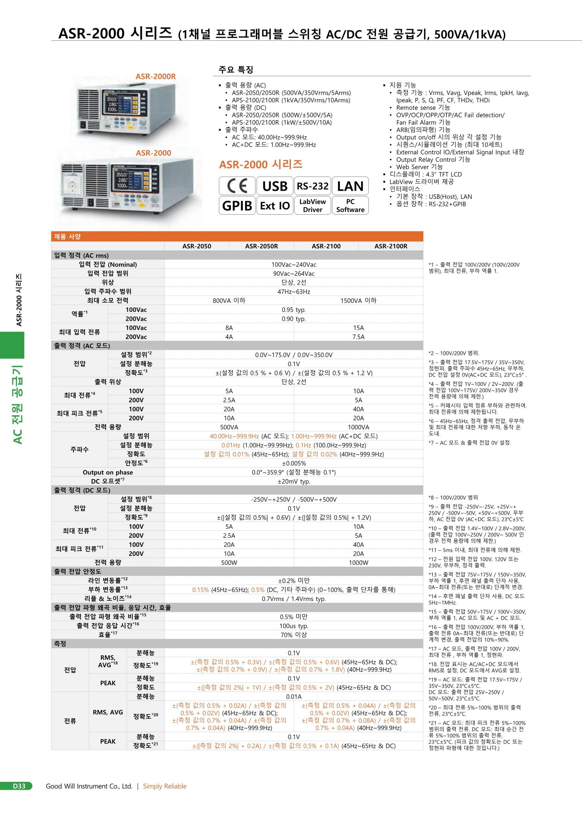 GW INSTEK 굿윌인스텍 ASR-2000 AC/DC 전원 공급 장치 시리즈