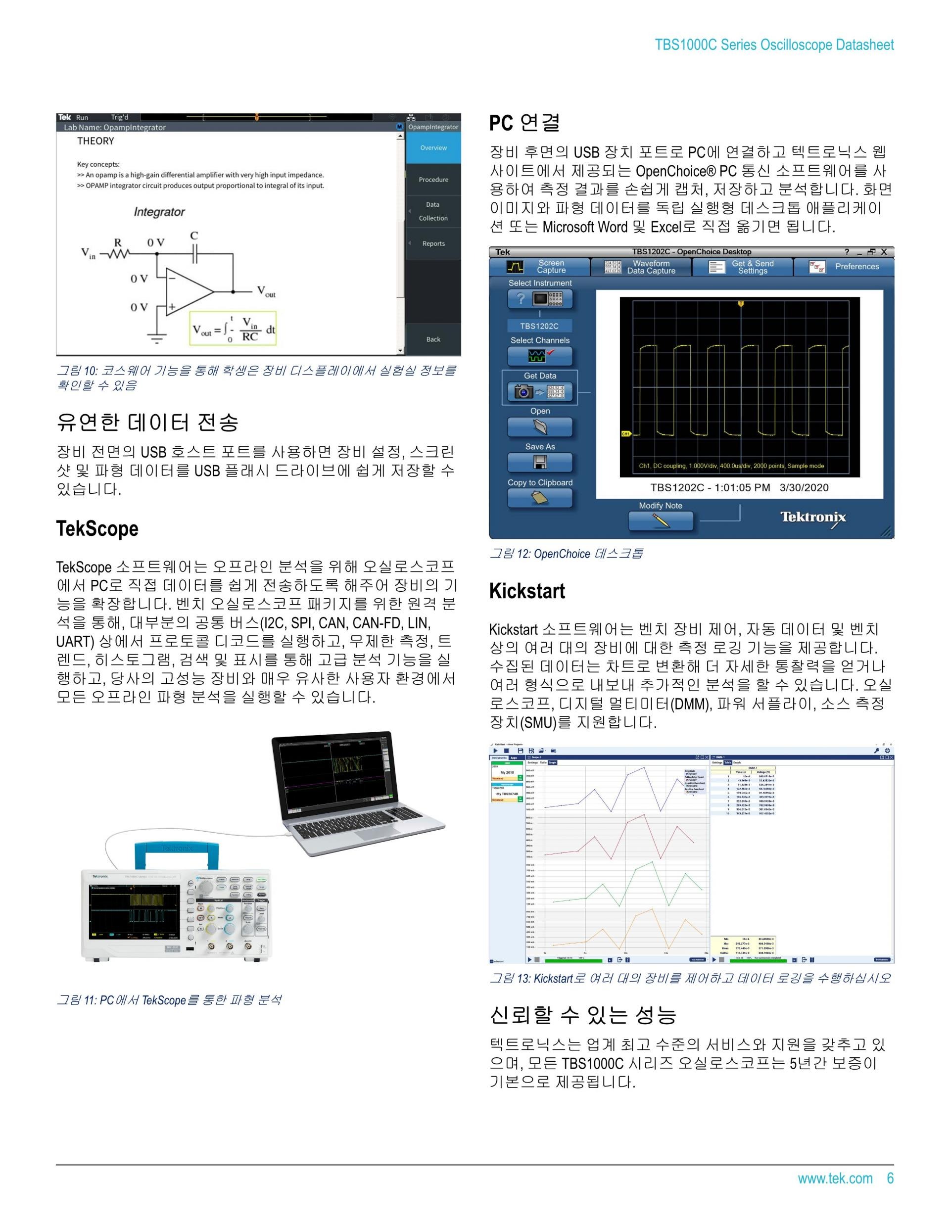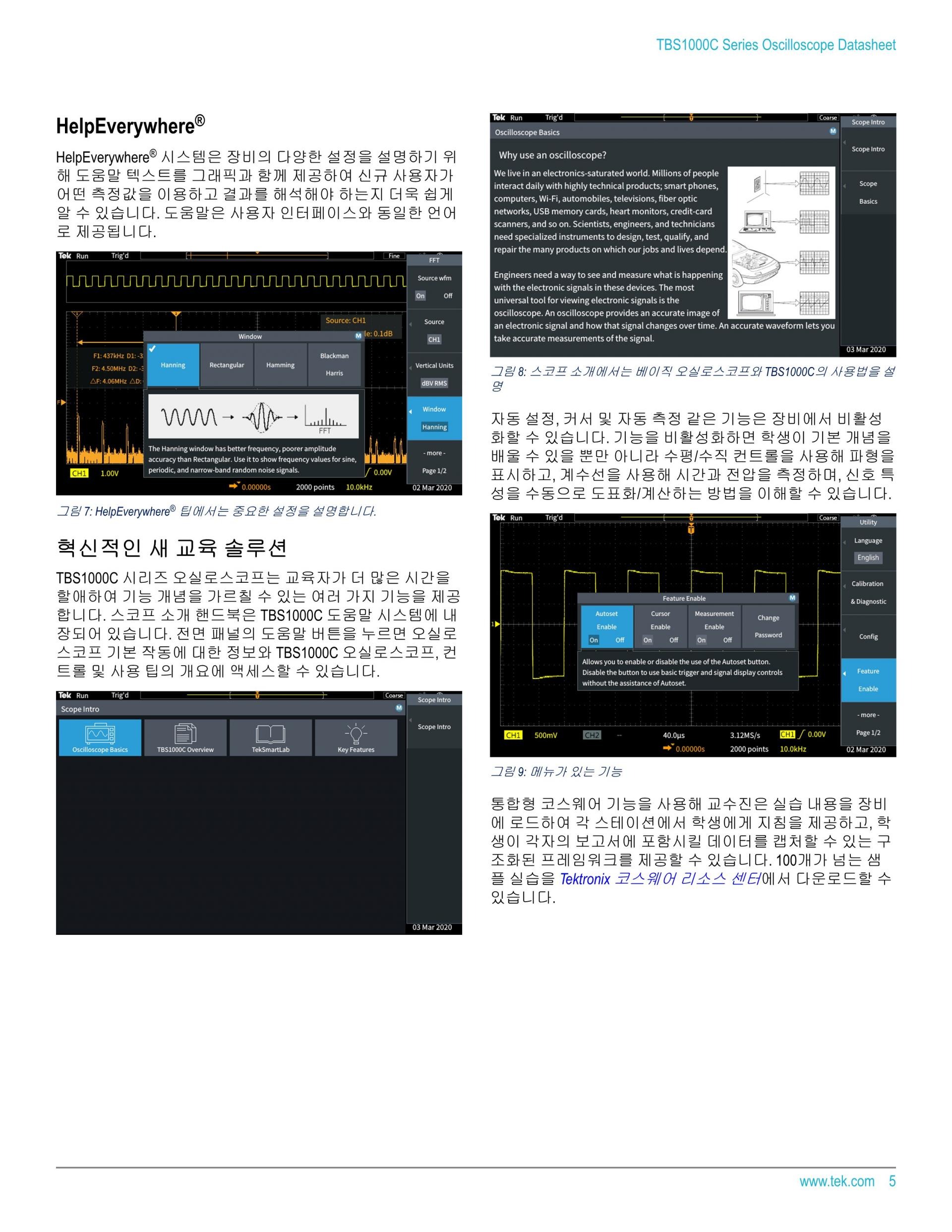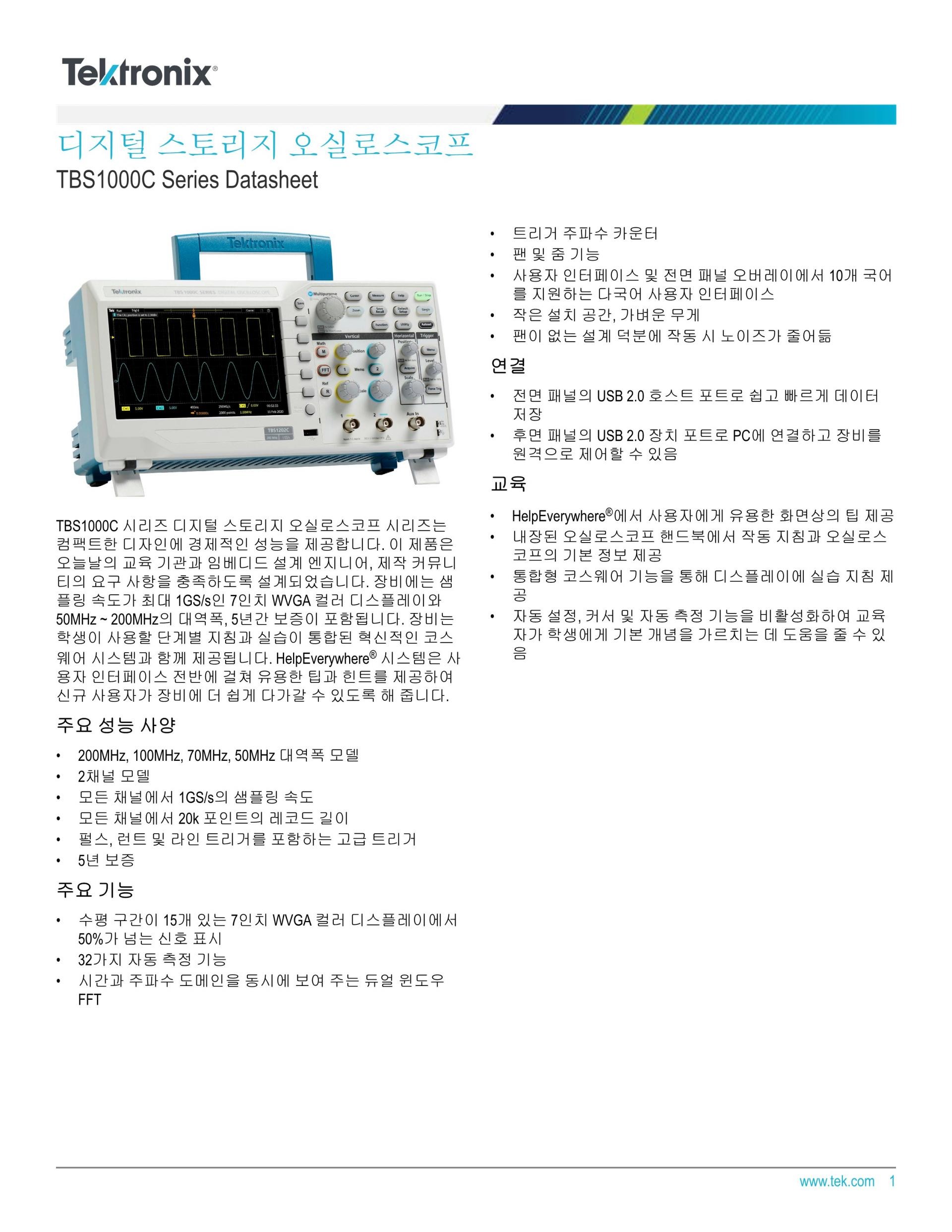소형 디자인에 경제적인 성능을 제공하는 TBS1000C 디지털 스토리지 오실로스코프는 오늘날의 교육 기관, 임베디드 설계자 및 제조업체 커뮤니티에서 요구하는 기능, 다기능성 및 내구성을 제공합니다. TBS1000C는 최대 1GS/s의 샘플링 속도, 50MHz~200MHz의 대역폭 및 5년 보증을 제공하며 7인치 WVGA 컬러 디스플레이가 포함됩니다. 그리고 혁신적인 코스웨어 시스템으로 실험실 실습과 학생들을 위한 단계별 지침을 통합합니다. HelpEverywhere® 시스템은 사용자 인터페이스 전반에 걸쳐 유용한 팁과 힌트를 제공하여 새로운 사용자도 장비에 더 쉽게 접근할 수 있습니다.