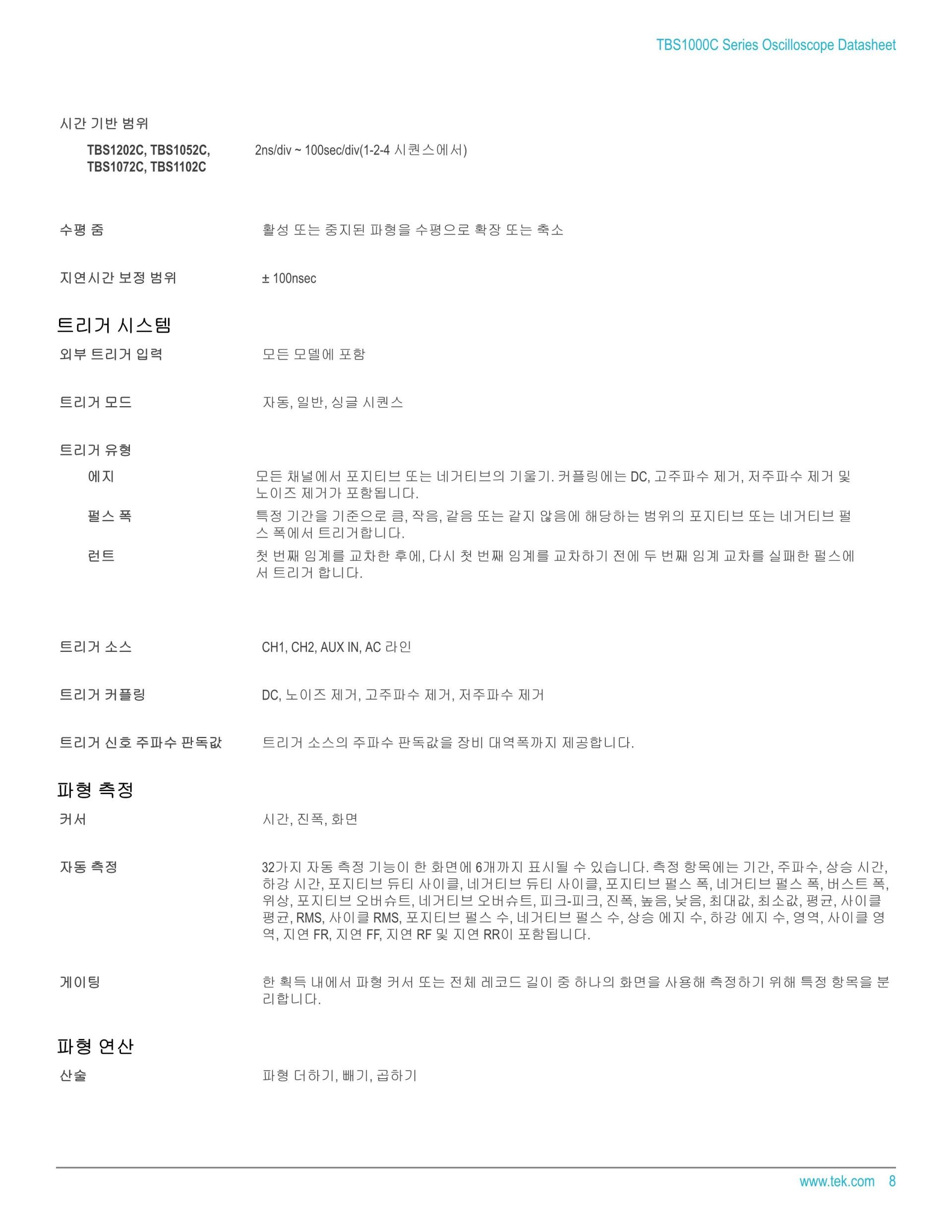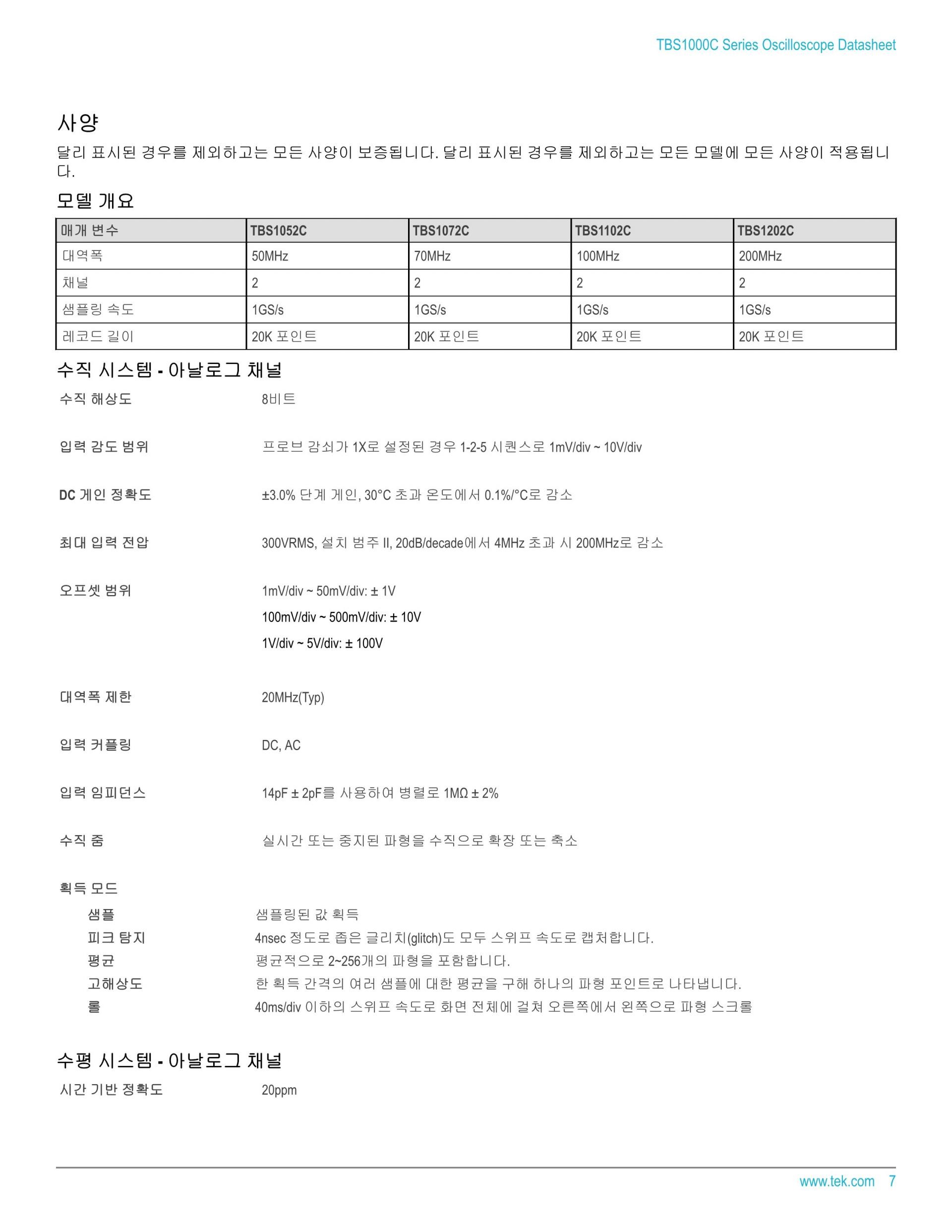TBS1000C는 최대 1GS/s의 샘플링 속도, 50MHz~200MHz의 대역폭 및 5년 보증을 제공하며 7인치 WVGA 컬러 디스플레이가 포함됩니다.
