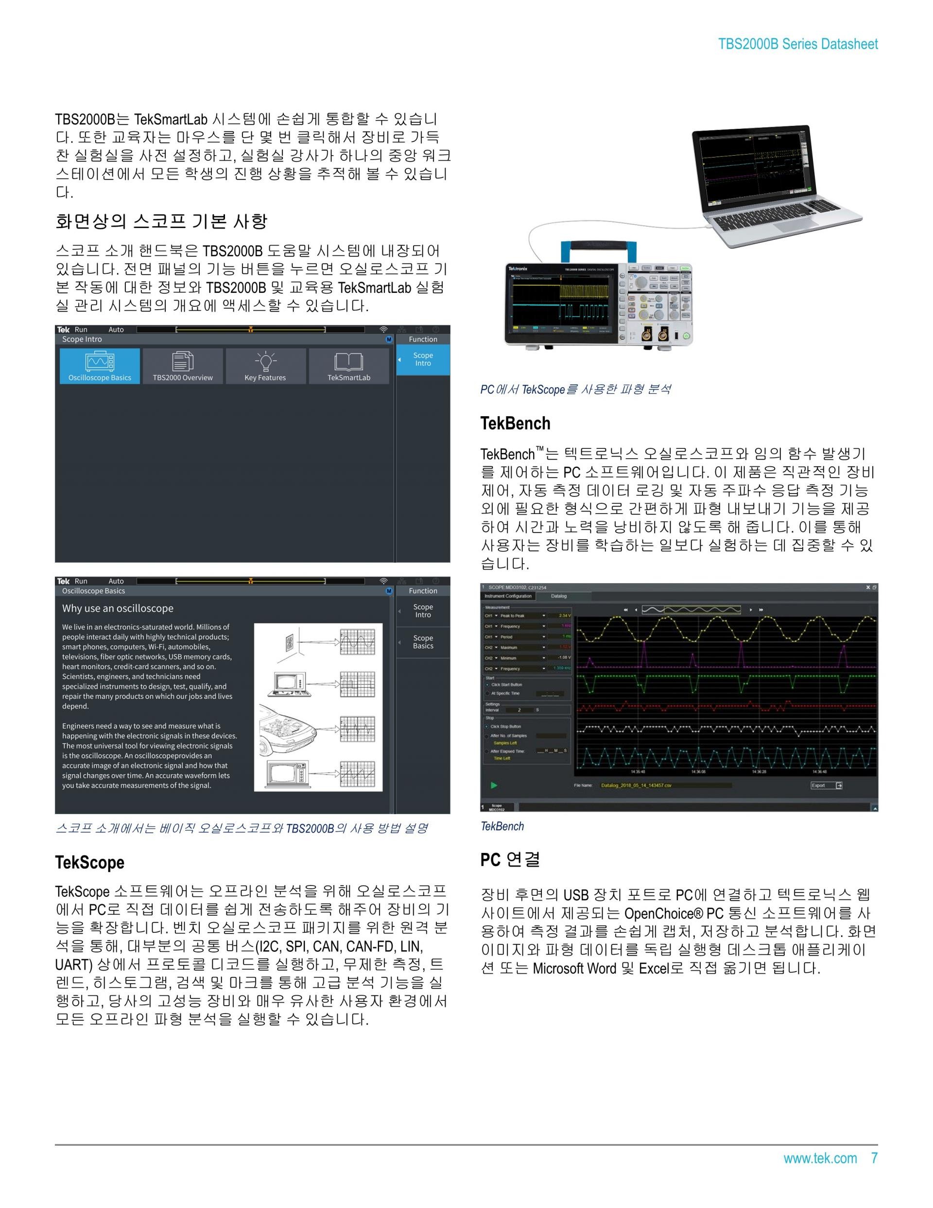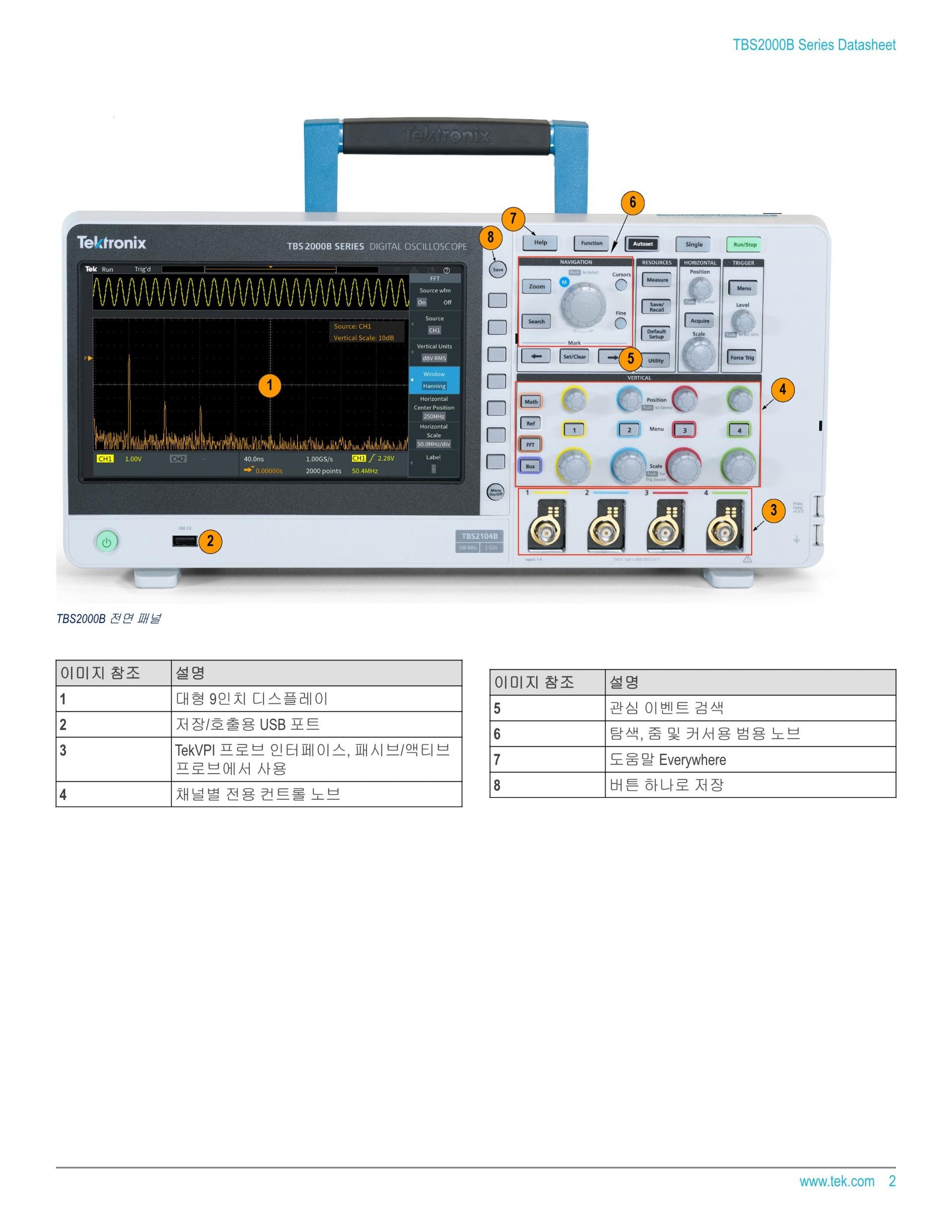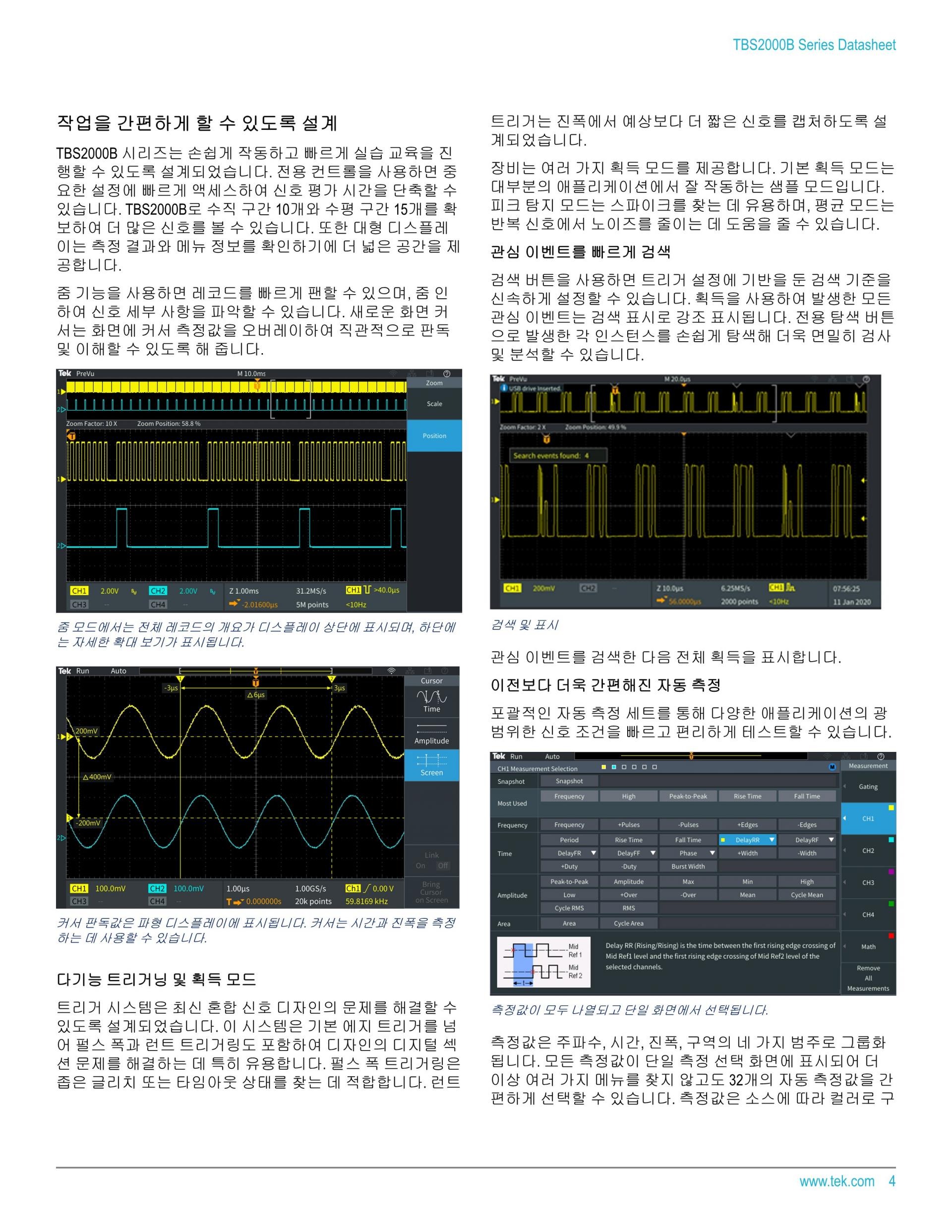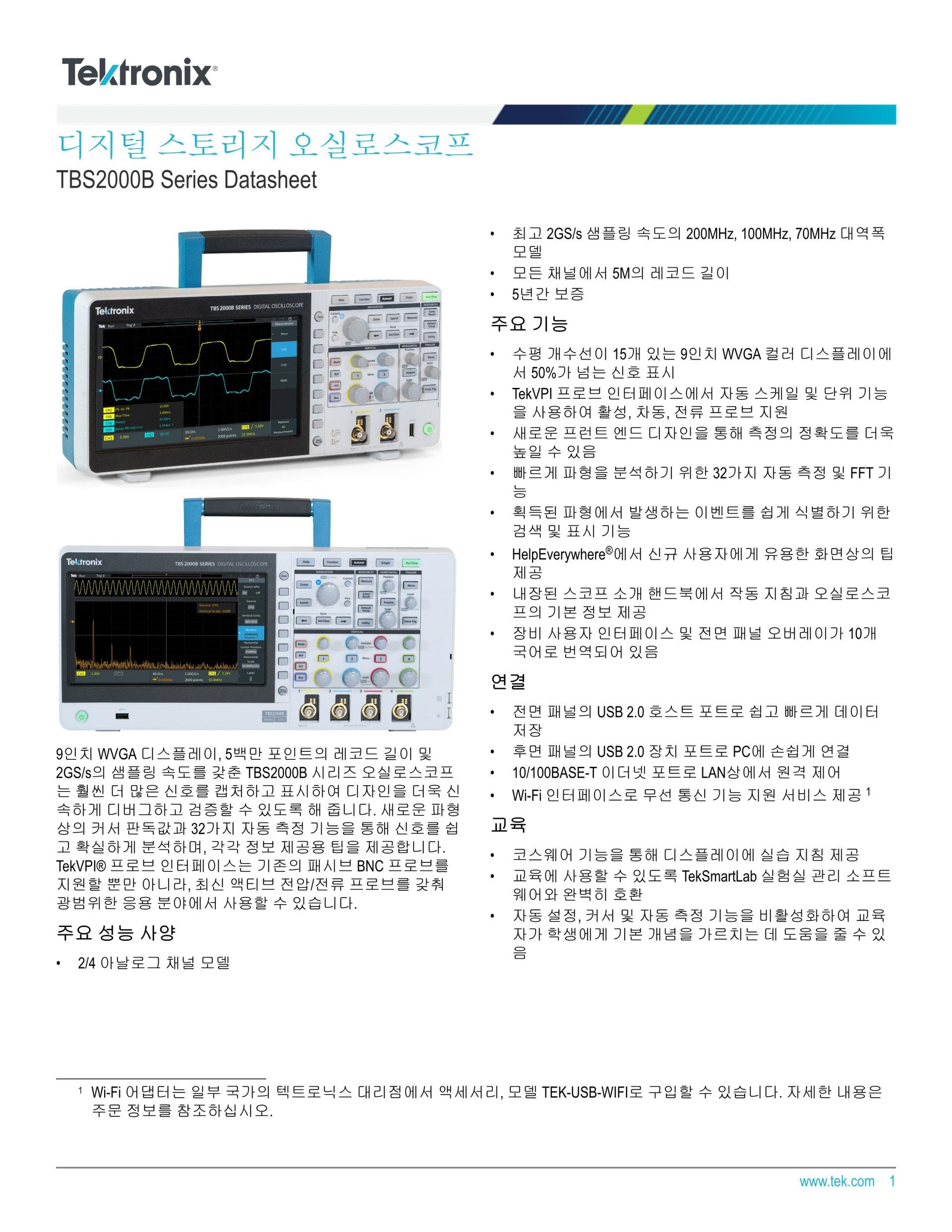 새로운 TBS2000B 디지털 스토리지 오실로스코프는 오실로스코프의 가장 중요한 기능인 신호 관찰 및 측정 작업을 보다 탁월하게 수행합니다. 더 커진 9인치 디스플레이와 15개의 수평 구간으로 화면별로 보다 오랜 시간을 할애할 수 있고 5M의 레코드 길이로 장시간 캡처할 수 있어 더 많은 내용을 확인할 수 있습니다. 또한 편리한 커서와 강력한 32개의 자동 측정으로 더 많은 것을 측정할 수 있으며, Wi-fi 연결 기능과 100-BaseT 이더넷 포트를 통해 더 많은 내용을 공유할 수 있습니다. 이 경제적인 스코프 제품은 내게 꼭 필요한 성능을 제공합니다.