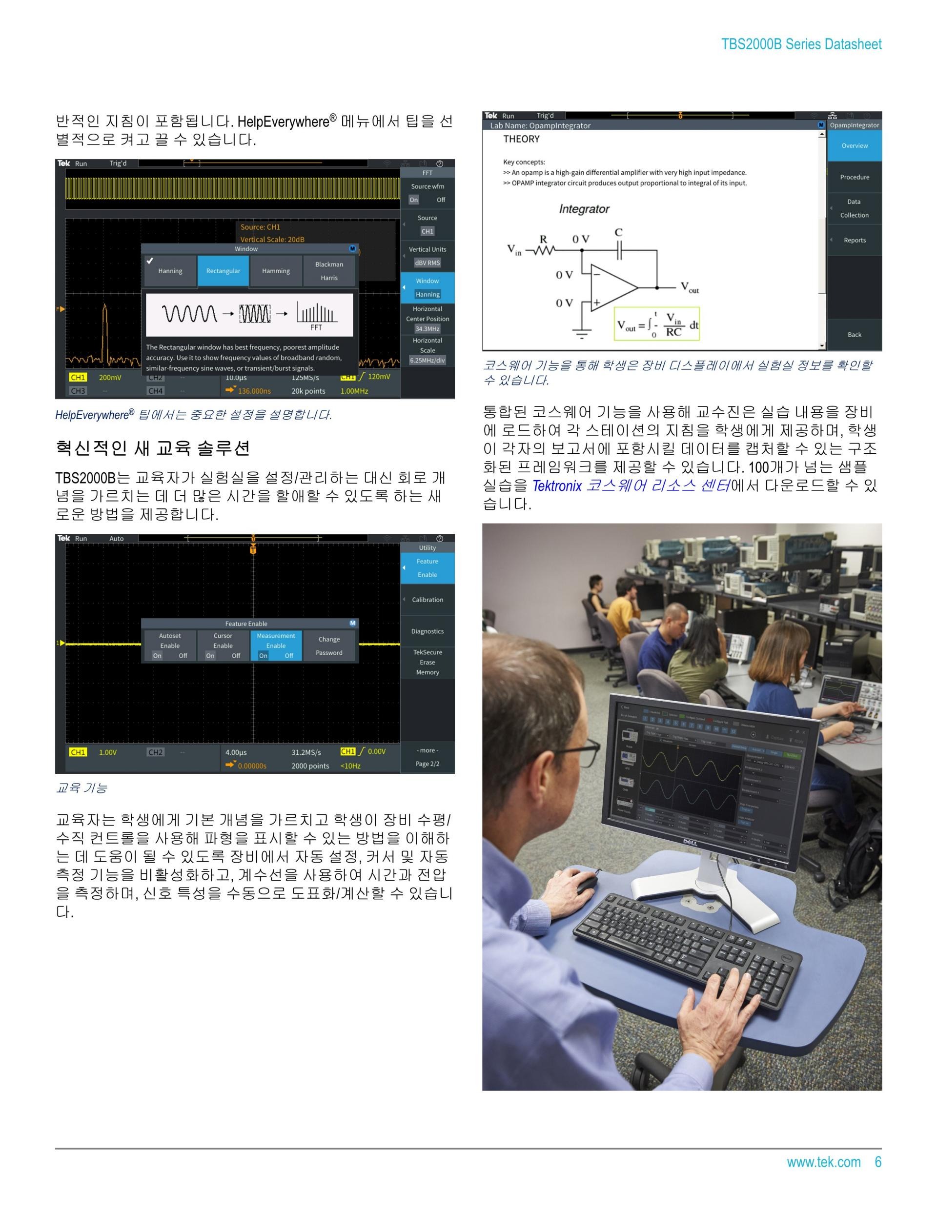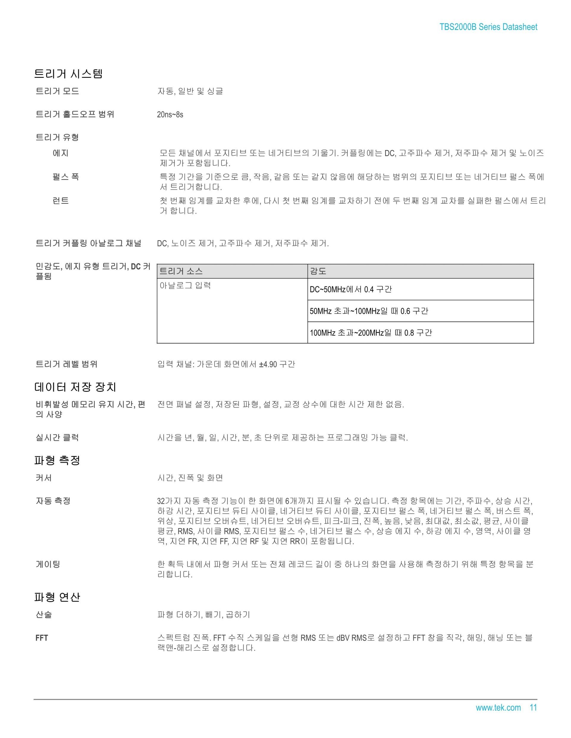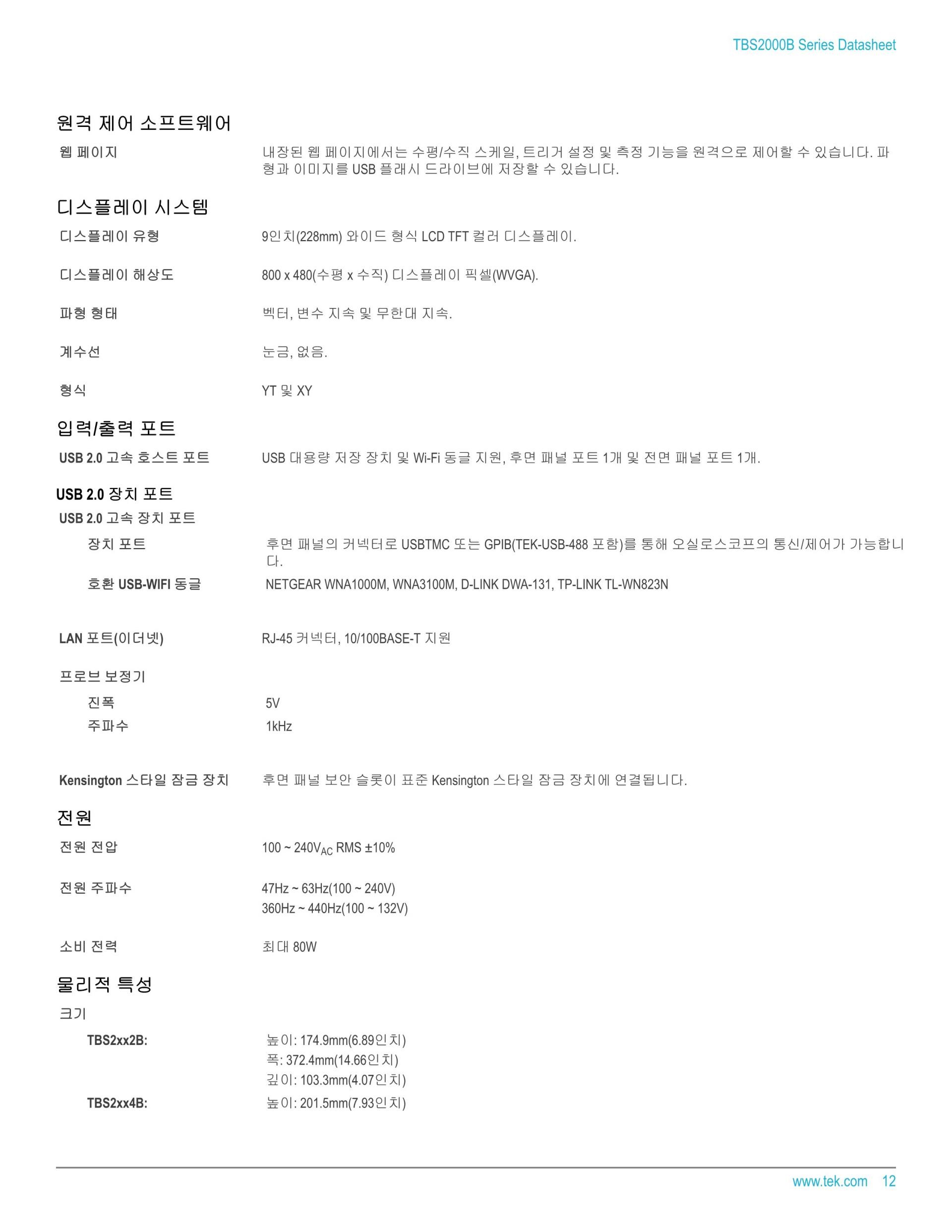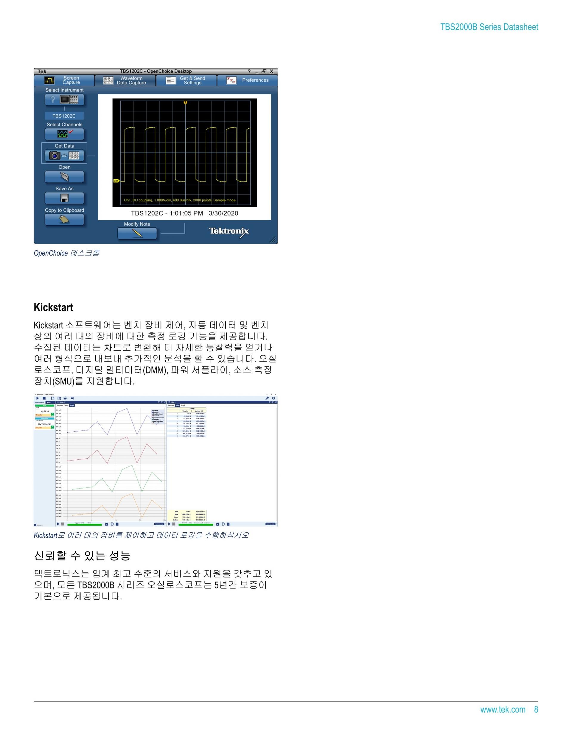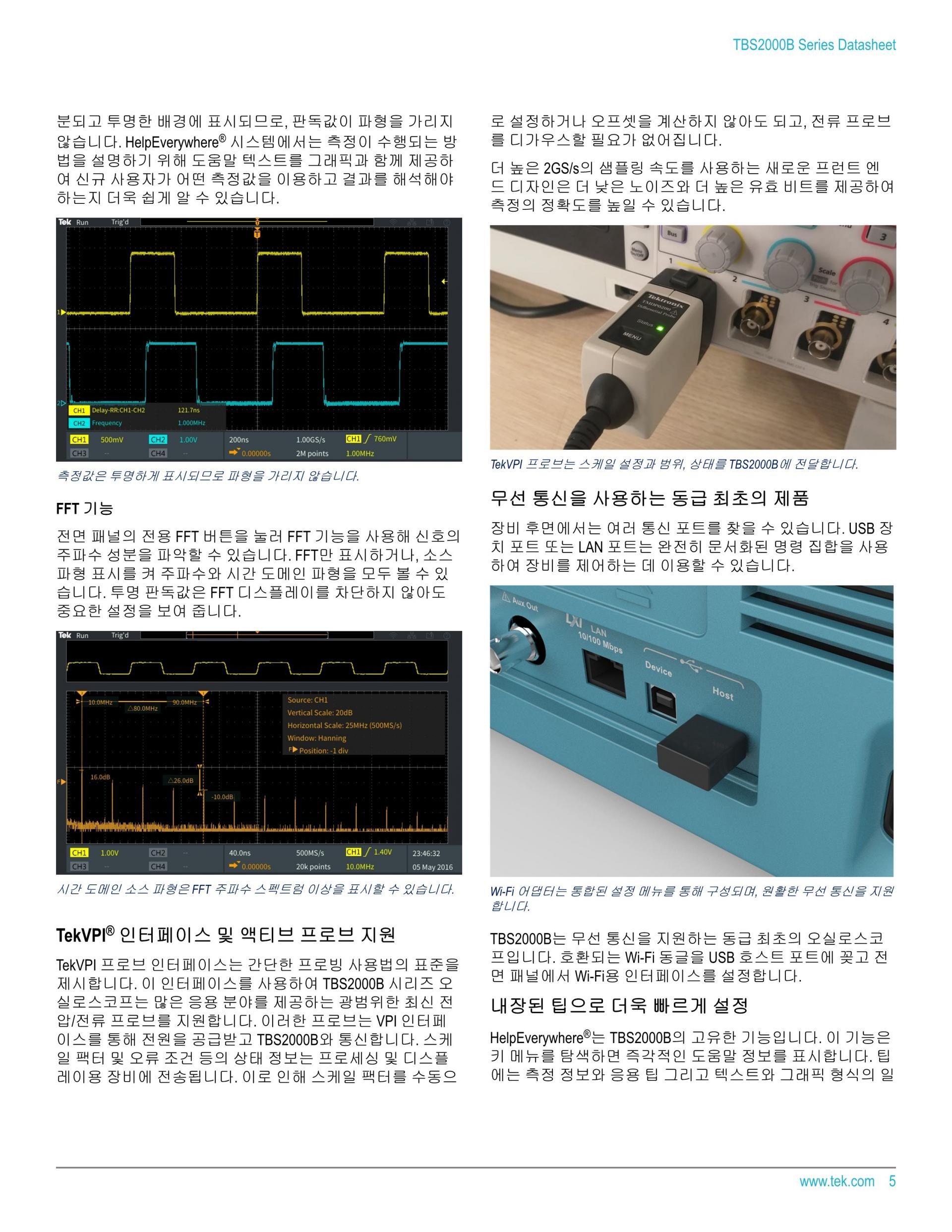 새로운 TBS2000B 디지털 스토리지 오실로스코프는 오실로스코프의 가장 중요한 기능인 신호 관찰 및 측정 작업을 보다 탁월하게 수행합니다. 더 커진 9인치 디스플레이와 15개의 수평 구간으로 화면별로 보다 오랜 시간을 할애할 수 있고 5M의 레코드 길이로 장시간 캡처할 수 있어 더 많은 내용을 확인할 수 있습니다. 또한 편리한 커서와 강력한 32개의 자동 측정으로 더 많은 것을 측정할 수 있으며, Wi-fi 연결 기능과 100-BaseT 이더넷 포트를 통해 더 많은 내용을 공유할 수 있습니다. 이 경제적인 스코프 제품은 내게 꼭 필요한 성능을 제공합니다.