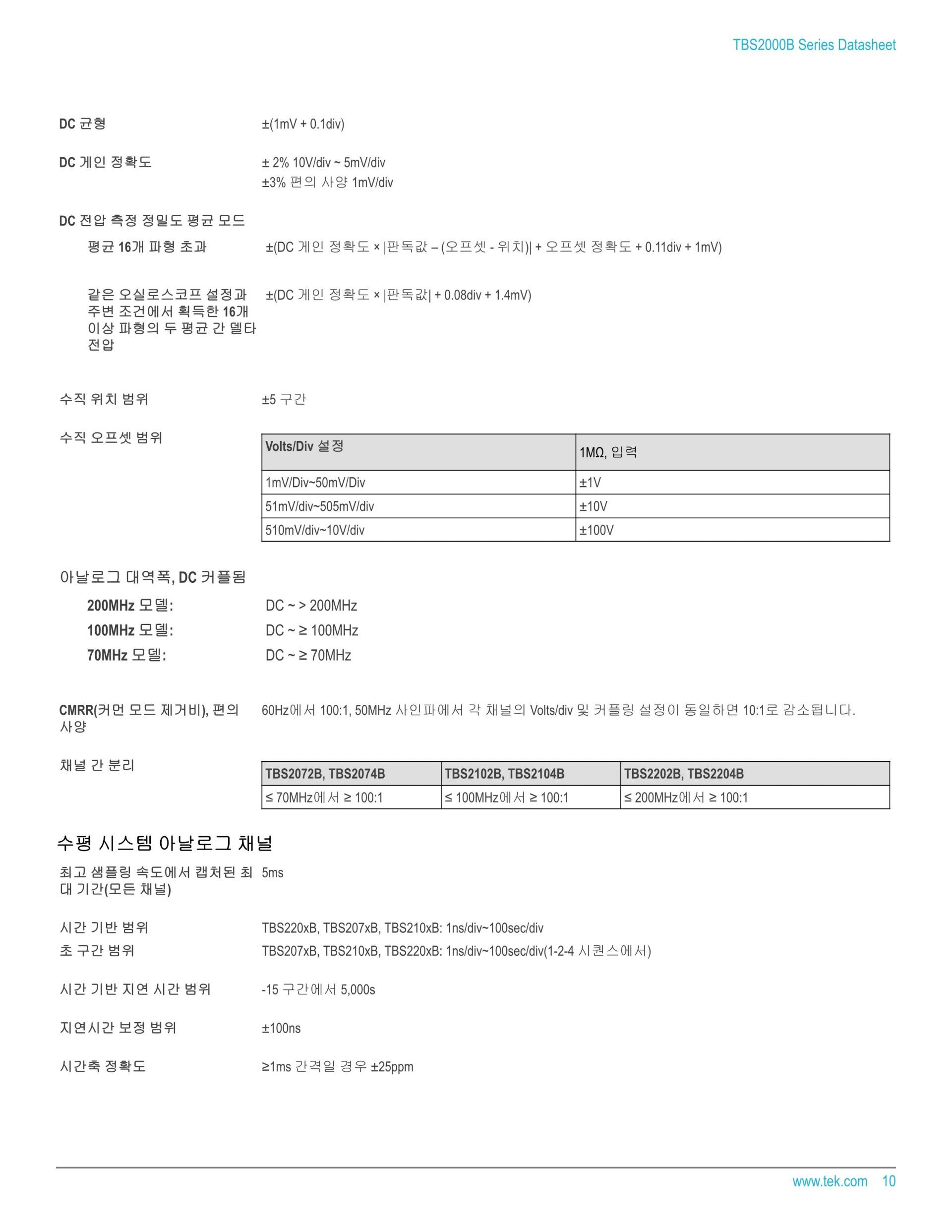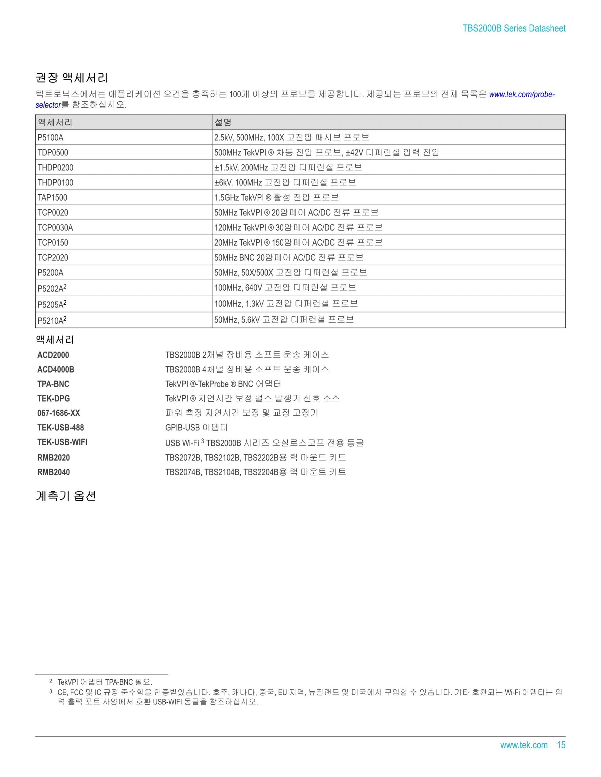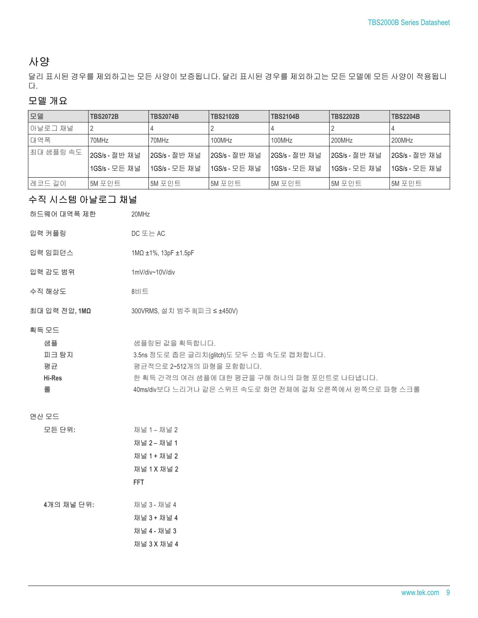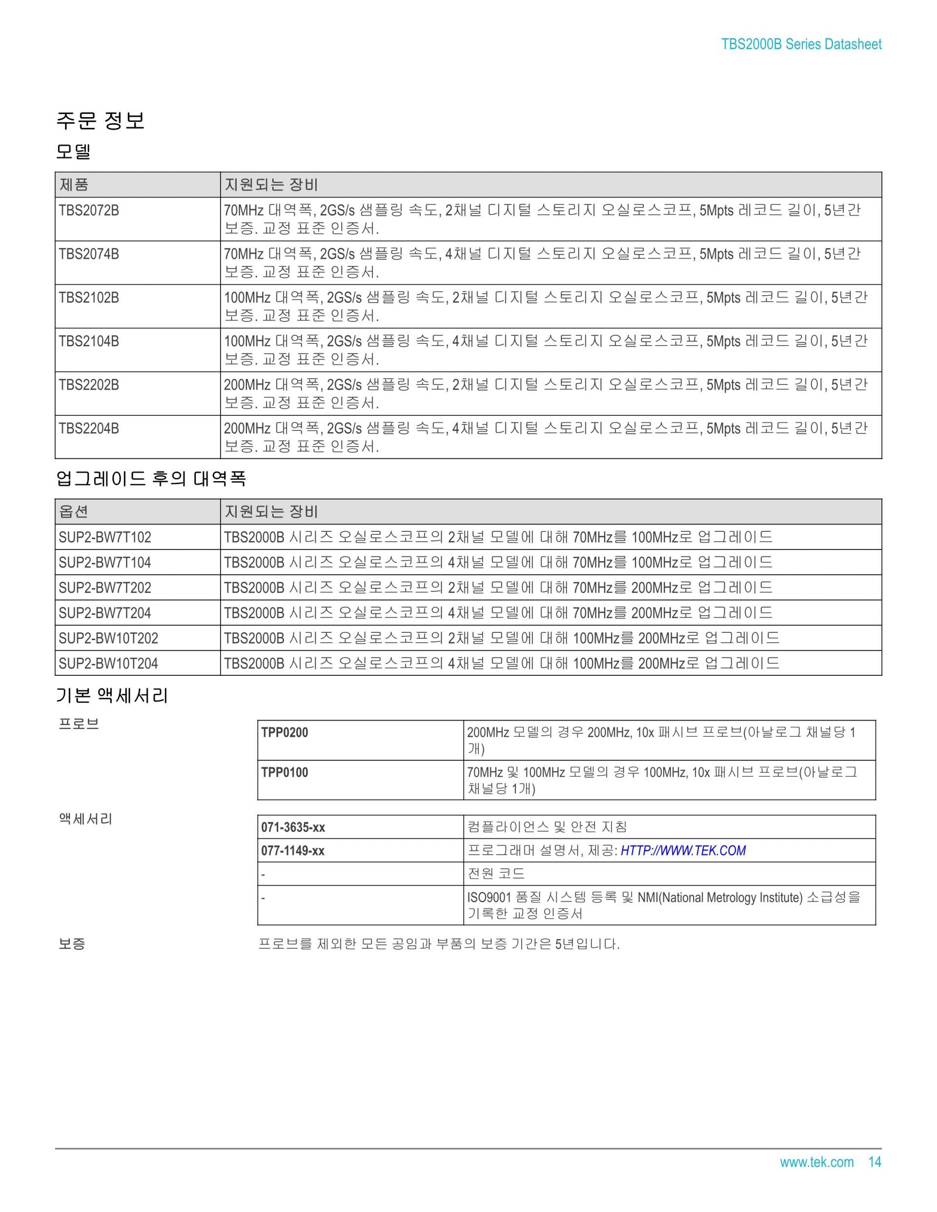새로운 TBS2000B 디지털 스토리지 오실로스코프는 오실로스코프의 가장 중요한 기능인 신호 관찰 및 측정 작업을 보다 탁월하게 수행합니다. 더 커진 9인치 디스플레이와 15개의 수평 구간으로 화면별로 보다 오랜 시간을 할애할 수 있고 5M의 레코드 길이로 장시간 캡처할 수 있어 더 많은 내용을 확인할 수 있습니다. 또한 편리한 커서와 강력한 32개의 자동 측정으로 더 많은 것을 측정할 수 있으며, Wi-fi 연결 기능과 100-BaseT 이더넷 포트를 통해 더 많은 내용을 공유할 수 있습니다. 이 경제적인 스코프 제품은 내게 꼭 필요한 성능을 제공합니다.