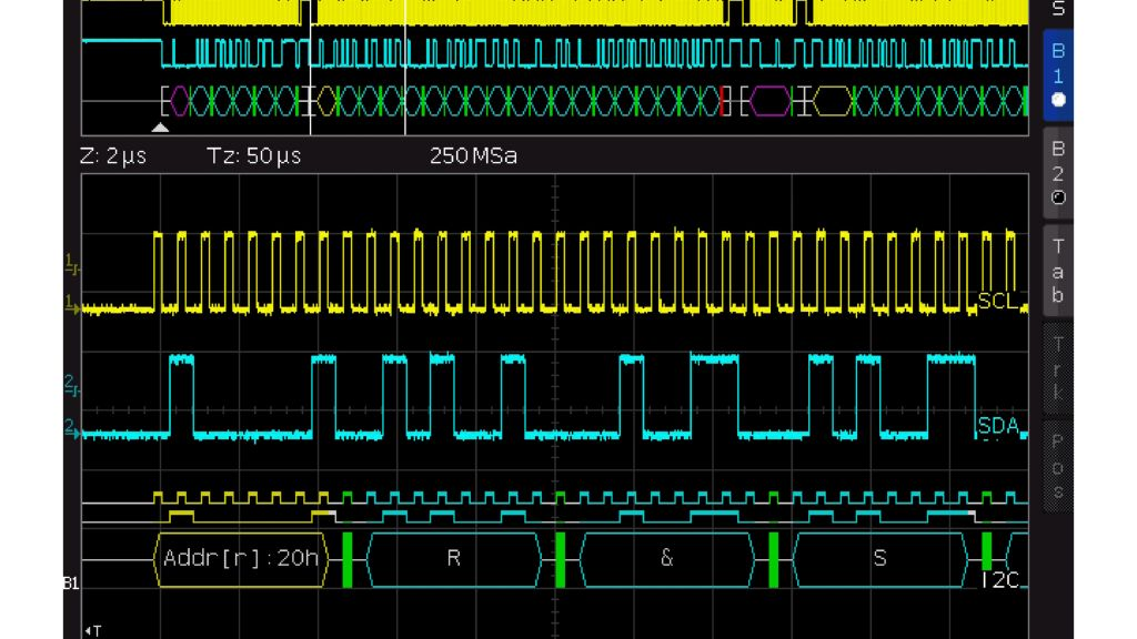 I²C, SPI, CAN/LIN과 같은 프로토콜은 일반적으로 집적 회로 간 제어 메시지 전송을 위해 사용됩니다. R&S®RTC1000은 시리얼 인터페이스의 프로토콜별 트리거 및 디코딩용으로 다양한 옵션을 제공합니다. 해당되는 이벤트와 데이터를 선택적으로 획득하고 분석할 수 있습니다. 하드웨어 기반으로 구현되어 긴 획득 시간에도 끊김없는 작동과 높은 업데이트 속도가 가능합니다. 이러한 점은 특히 다양한 패킷 시리얼 버스 신호를 포착할 때 도움이 됩니다. | ![]() 하드웨어 기반 트리거링 및 디코딩 - I²C, 2-wire, 3-wire SPI 버스의 트리거링과 디코딩을 지원합니다. 몇 초 내 디코딩 설정 가능 |