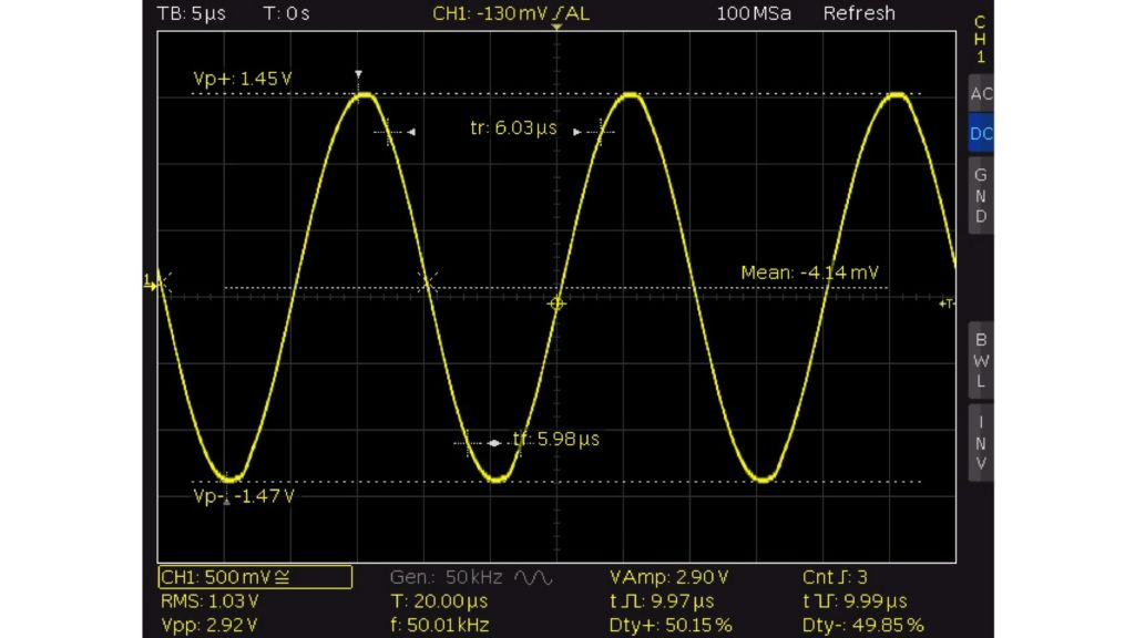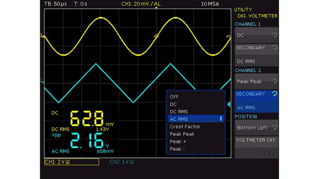 R&S®RTC1000에는 각 채널에 3자릿수 디지털 전압계(DVM)와 6자릿수 주파수 계수기가 탑재되어 있어 동시 측정이 가능합니다. DC, AC + DC (RMS) 및 AC (RMS) 측정 기능이 기본 제공됩니다. | 오실로스코프를 이용한 전압계 계측 |
