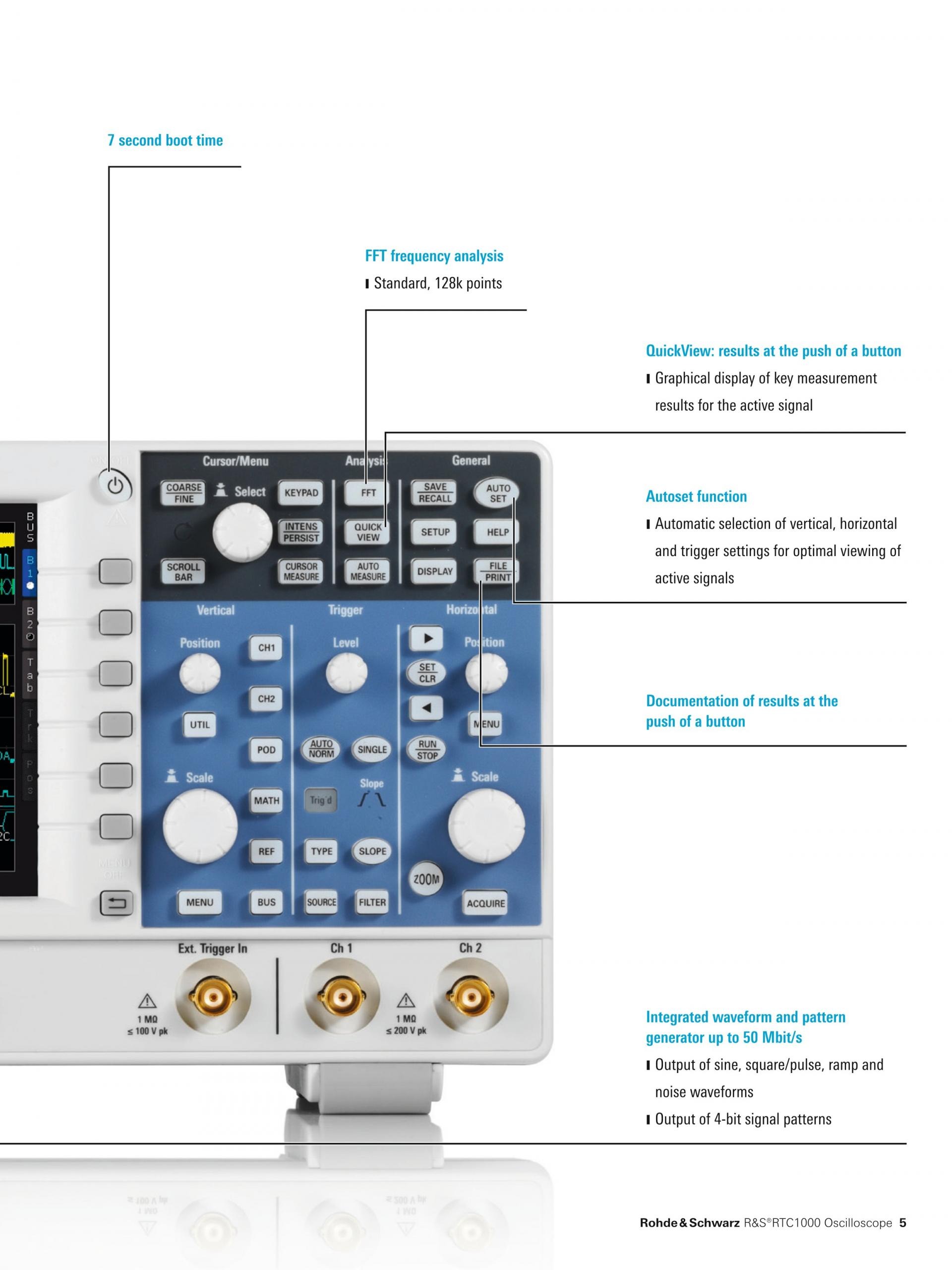 R&S®RTC1000 오실로스코프는 최대 2 Gsample/s의 샘플링 레이트 및 최대 2 Msample의 메모리 용량으로 동급 최고의 성능을 제공합니다. 초당 10,000번 이상의 파형 업데이트 속도는 신호 오류를 안정적으로 포착합니다. QuickMeas, 마스크 테스트, FFT, 연산, 커서, 자동 측정(통계 기능 포함)과 같이 빠른 결과를 보여주는 다양한 기능들이 포함되어 있습니다. | R&S®RTC1000은 최고 수준의 하드웨어 기반 신호 Acquisition으로 정밀한 측정 결과를 제공합니다 |