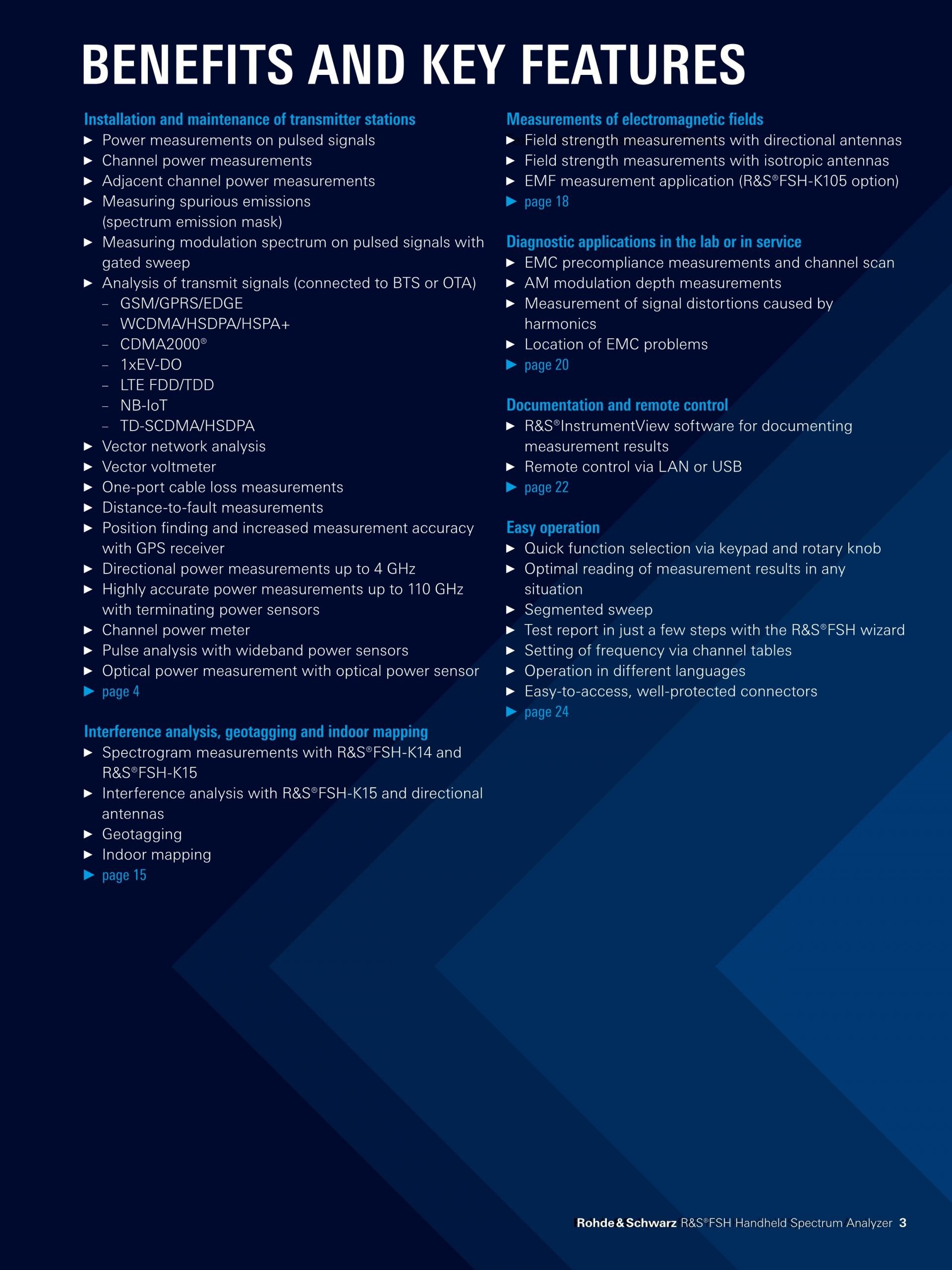 다목적 분석기 R&S®FSH Handheld Spectrum Analyzer에는 실내 및 실외 측정에 필수적인 모든 기능이 탑재되어 있습니다: