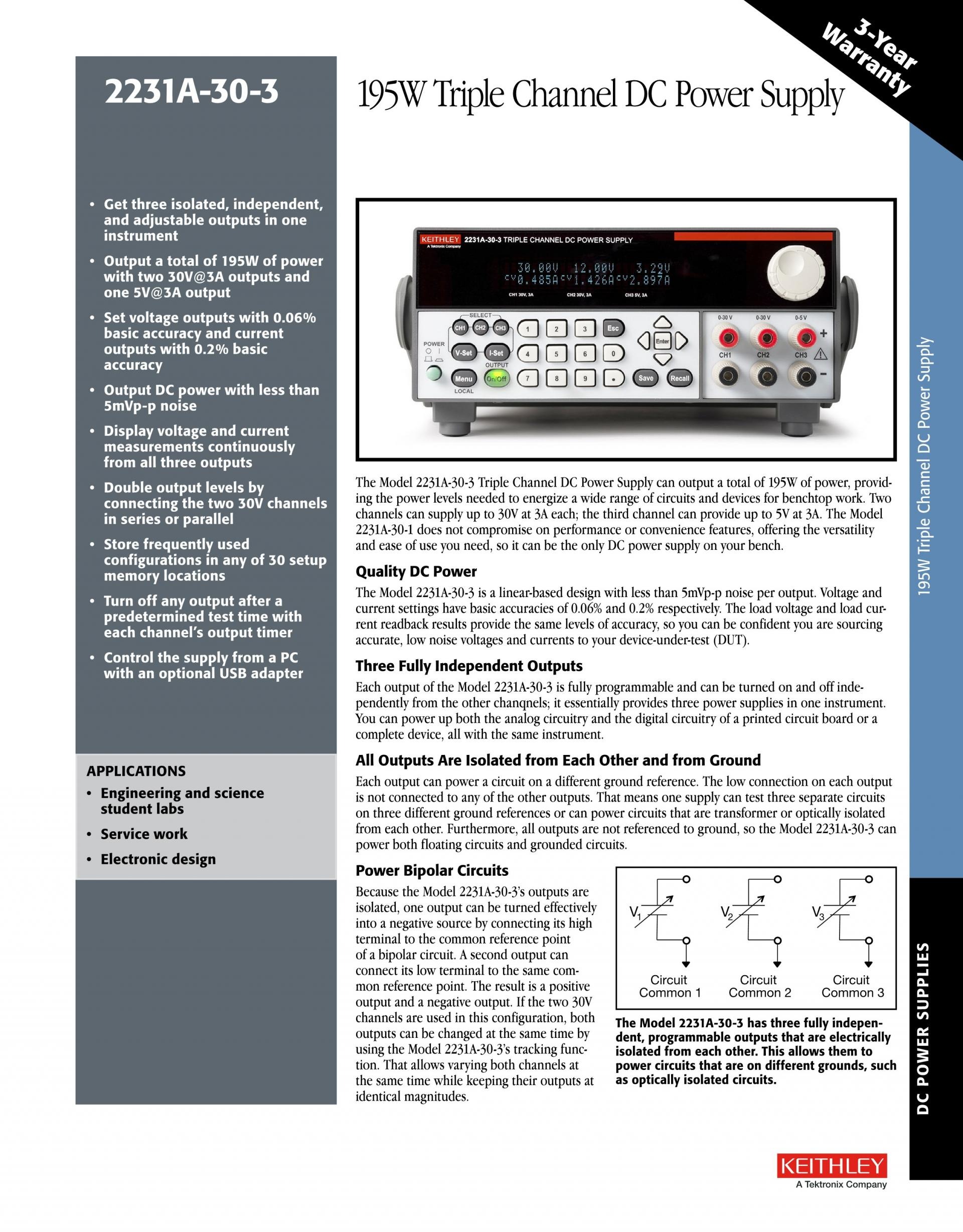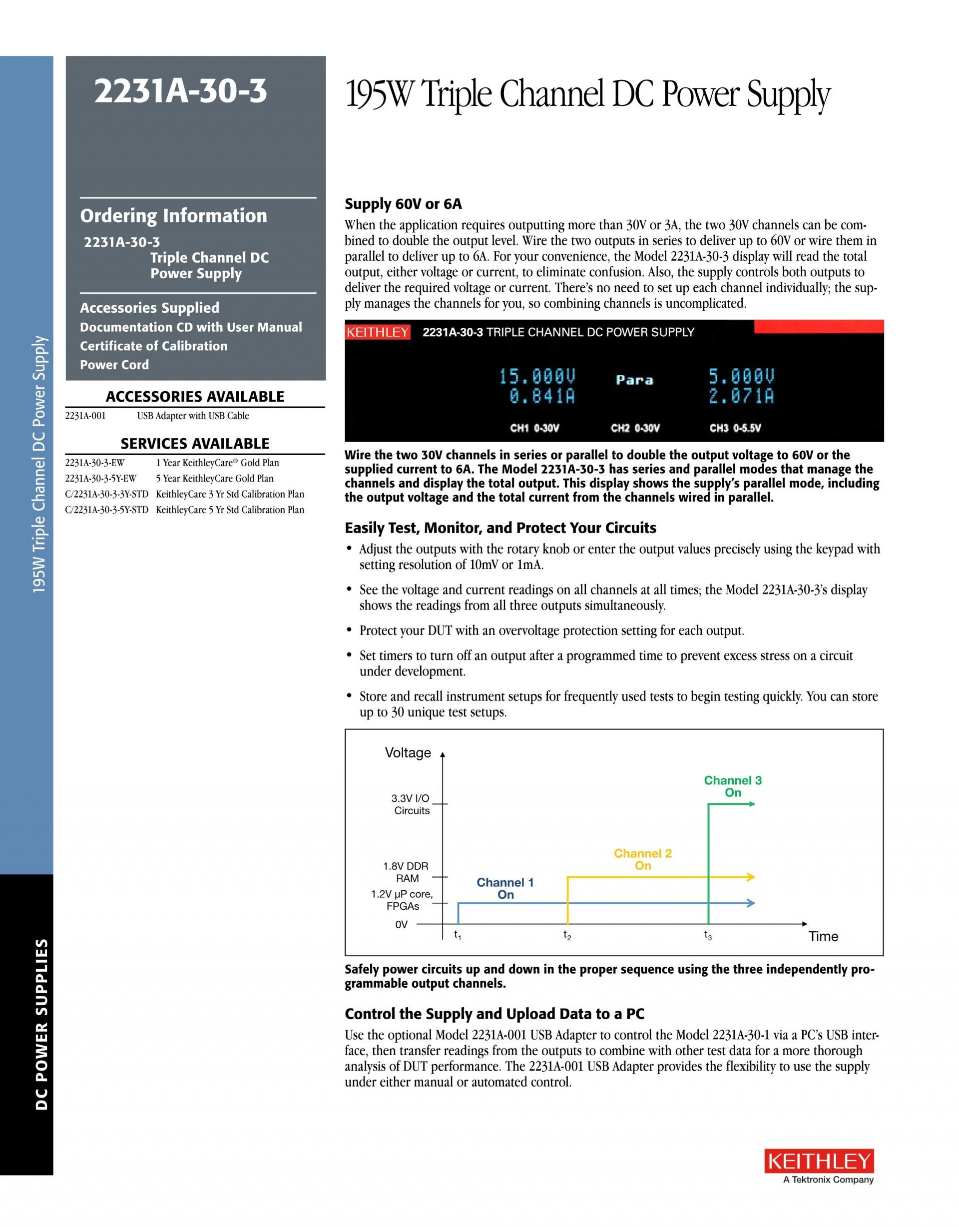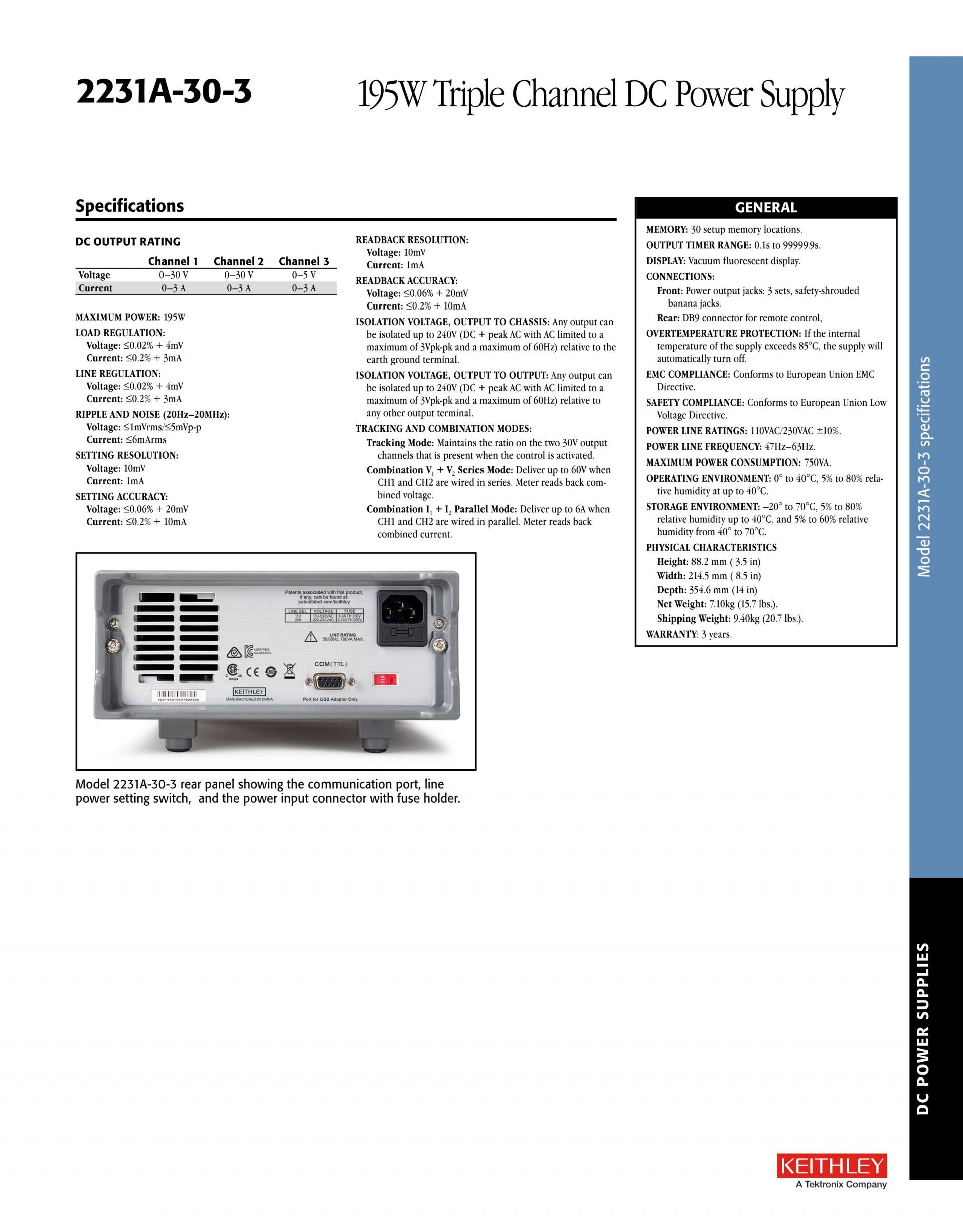 모델 2231A-30-3의 2개 채널은 각각 3A에서 최대 30V의 전압을 제공할 수 있으며, 세 번째 채널은 3A에서 최대 5V 전압을 제공할 수 있습니다.
