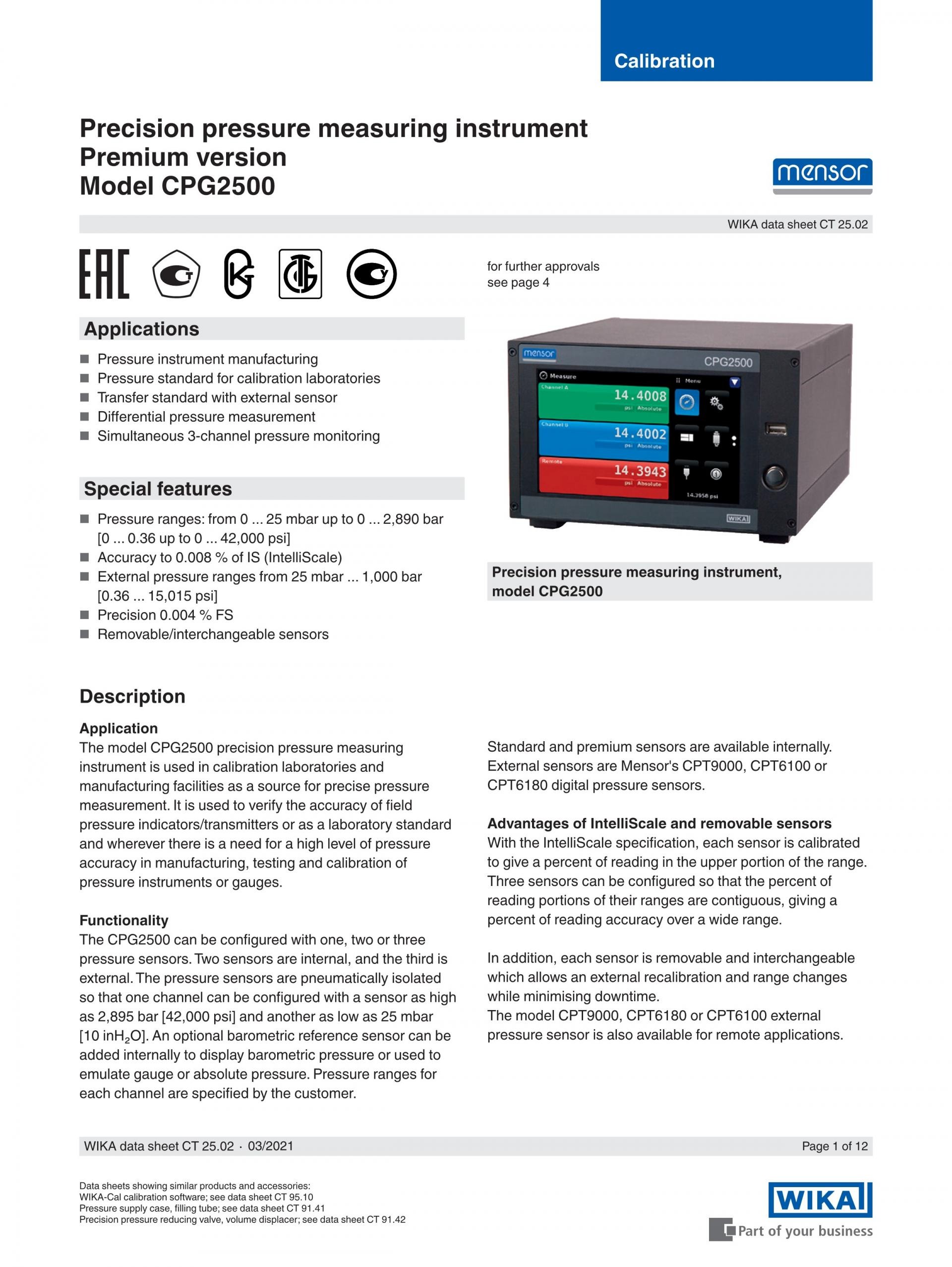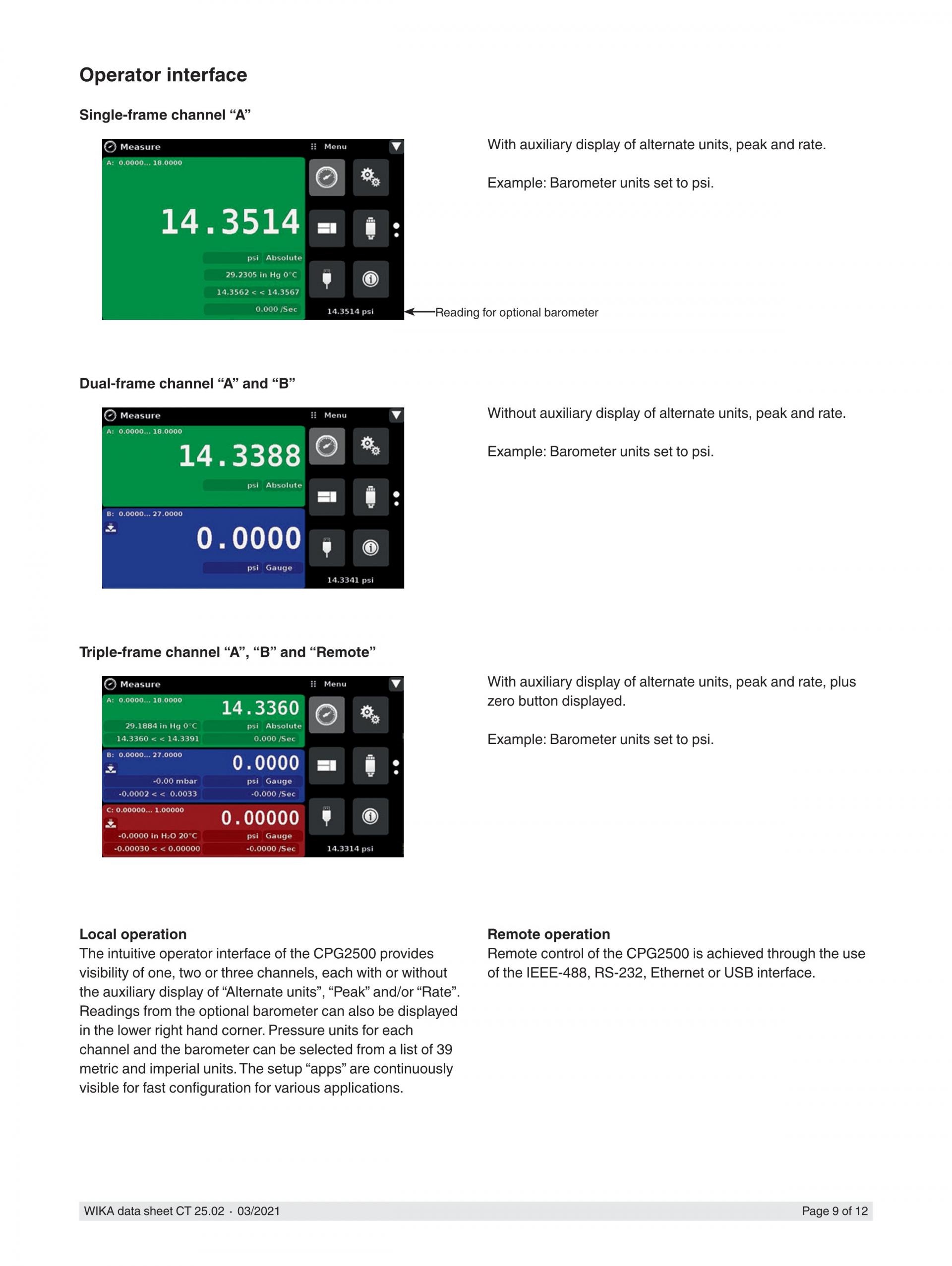 CPG2500은 1, 2 또는 3 개의 압력 센서로 구성 될 수있다. 두 개의 센서가 내부이고 세 번째는 외부. 하나의 채널은 690 bar (10,000 PSI) 동시에 다른 낮은 mbar / 10 25 inH2O만큼 높은 센서를 구성 할 수 있도록 디지털 압력 표시기의 압력 센서는 공압식 격리됩니다. 선택적 기압 센서는 기압을 표시하기 위해 내부적으로 첨가하거나 또는 절대 압력 게이지를 에뮬레이트하기 위해 사용될 수 있습니다. 각 채널에 대한 압력 범위는 고객이 지정됩니다..