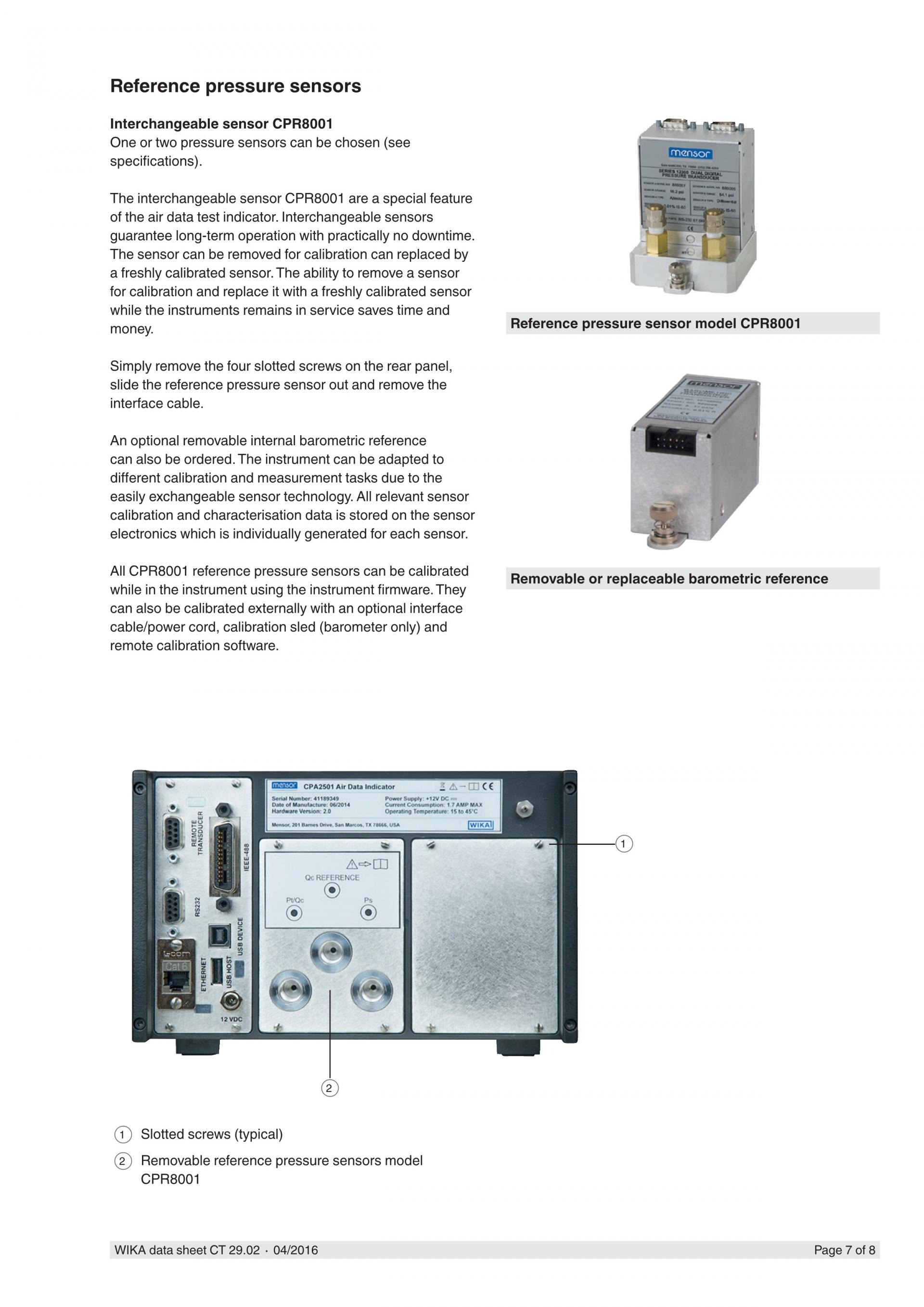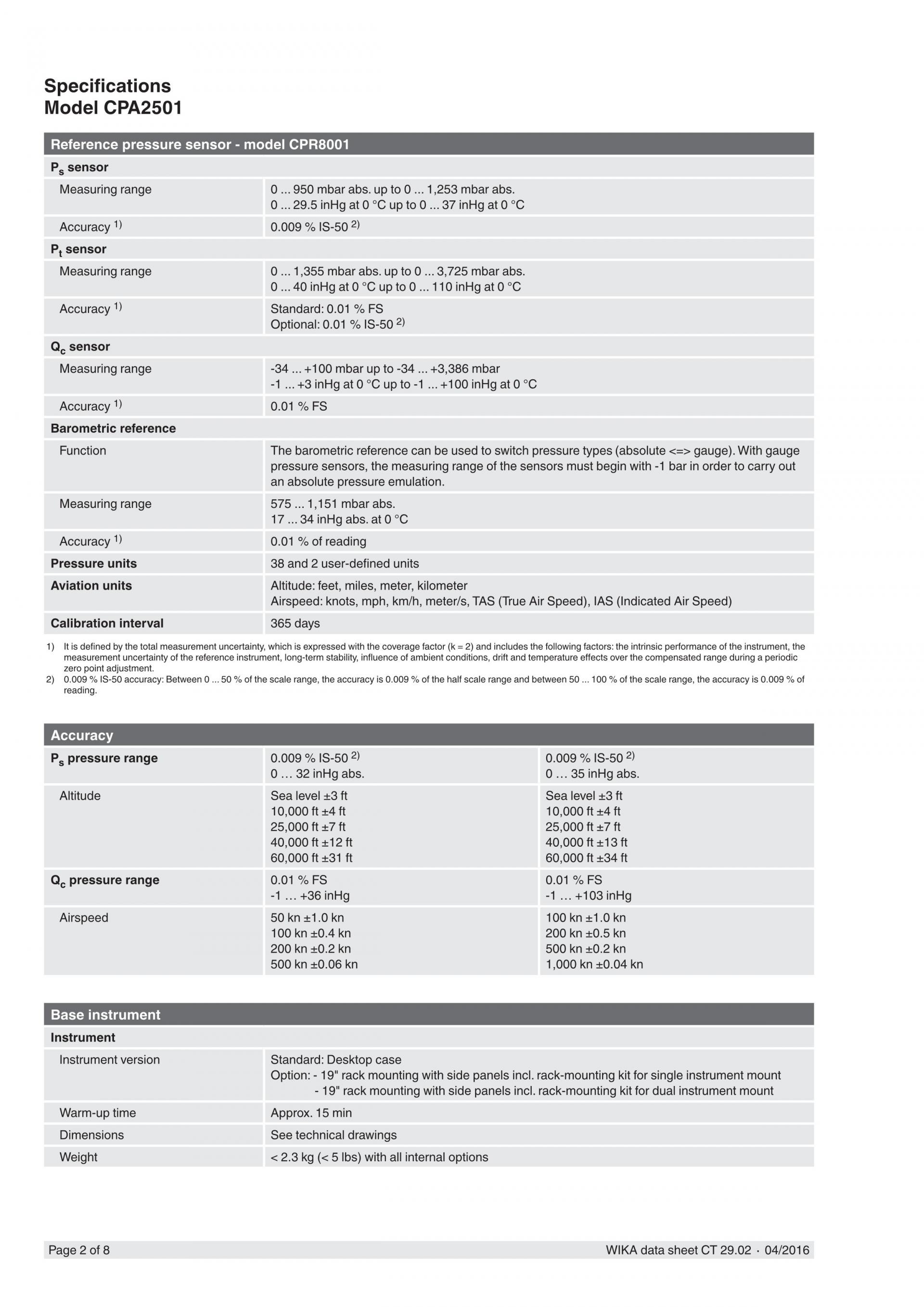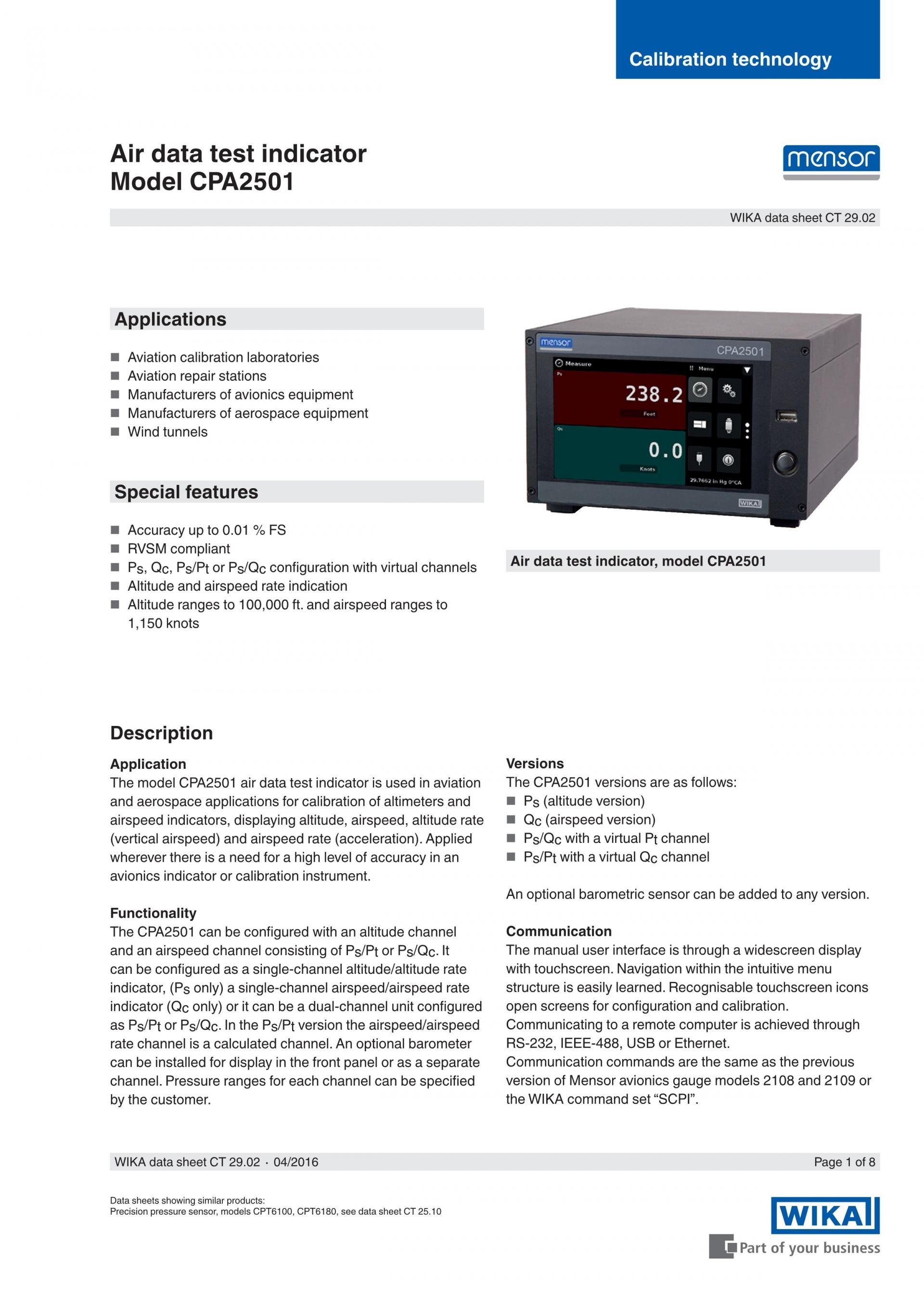 모델 CPA2501 공기 데이터 테스트 인디케이터는 고도계와 대기 속도계, 고도 표시, 대기 속도, 고도율 (수직 공기 속도) 및 대기 속도율 (가속) 의 교정이 필요한 항공 및 우주 어플리케이션에서 사용됩니다. 교정 기기 또는 항공 전자 공학 인디케이터에서 높은 정확도가 요구되는 어느 곳에서나 사용될 수 있습니다.