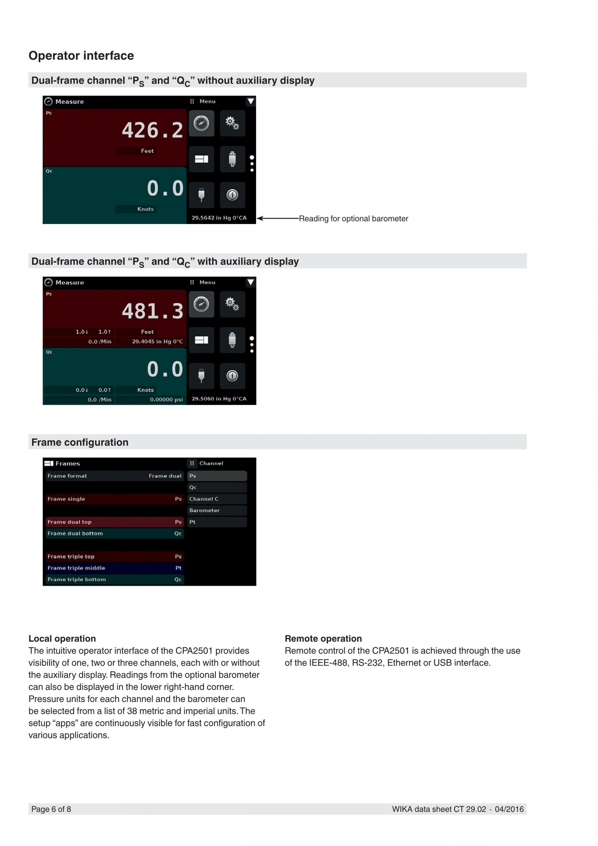 CPA2501은 Ps/Pt or Ps/Qc로 구성된 대기 속도 채널과 고도 채널로 구성됩니다. 단일 채널 고도/고도율 인디케이터, (Ps만) 단일 채널 대기 속도/ 대기 속도율 인디케이터 (Qc만) 로 구성될 수 있으며 Ps/Pt 또는 Ps/Qc 로 구성된 듀얼 채널도 가능합니다. Ps/Pt 버전에서 대기 속도/대기 속도율 채널은 계산된 채널이며 기압계 (옵션) 는 디스플레이를 위해 전면 패널 또는 분리된 채널에 설치될 수 있습니다. 각 채널의 압력 범위는 고객의 니즈에 따라 구체화될 수 있습니다.