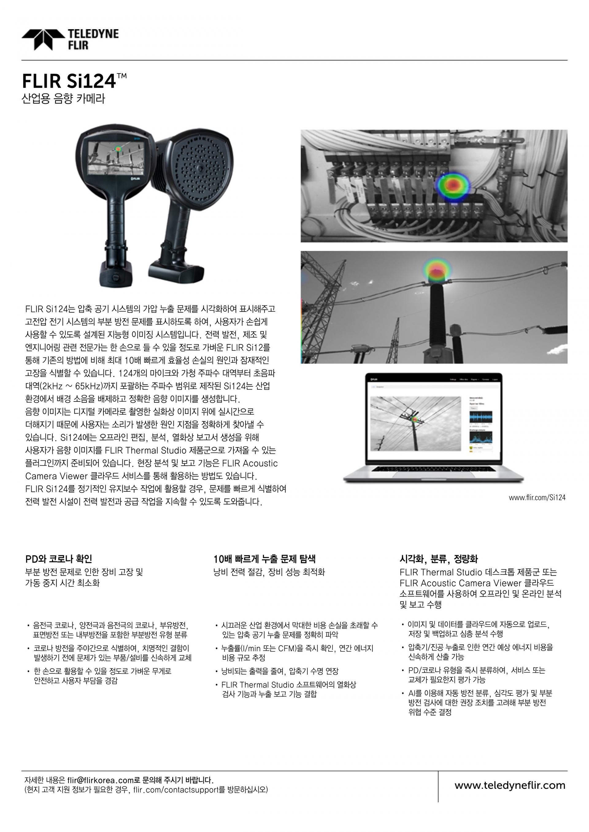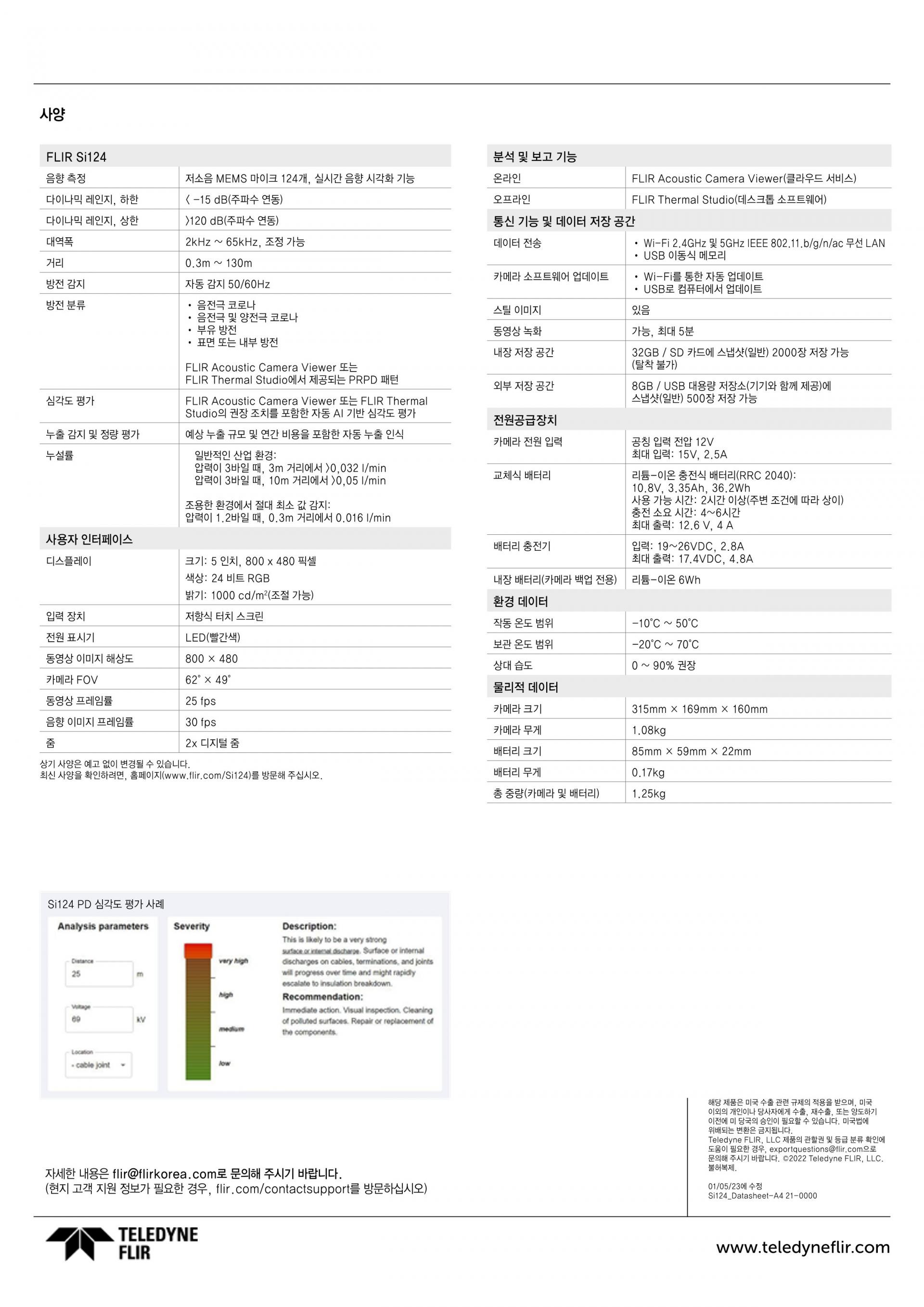 FLIR Si124 음향 이미징 카메라는 압축 공기 시스템에서 가압 누출을 찾거나 고전압 전기 시스템에서 부분 방전 감지를 보조할 수 있습니다. 한 손으로 사용할 수 있는 이 경량 솔루션을 사용하면 기존 방법보다 최대 10배 더 빠르게 문제를 파악할 수 있습니다. 124개의 마이크를 갖춘 Si124는 시끄러운 산업 환경에서도 초음파 정보를 시각적으로 표시하는 정밀한 음향 이미지를 생성합니다. 음향 영향이 디지털 카메라 사진 위에 실시간으로 이동되므로 사운드의 소스를 정확하게 찾을 수 있습니다. Si124는 사용자가 오프라인 편집, 분석, 고급 보고서 생성을 위해 음향 영상을 FLIR Thermal Studio 제품군으로 가져올 수 있는 플러그인 기능을 제공합니다. FLIR Acoustic Camera Viewer 클라우드 서비스를 사용하여 현장 분석 및 보고를 수행할 수도 있습니다. FLIR Si124는 정기적인 유지보수 일정을 통해 시설의 공과금 비용을 절감하고 새로운 압축기를 설치하는 것을 지연하는 데 도움을 드릴 수 있습니다.