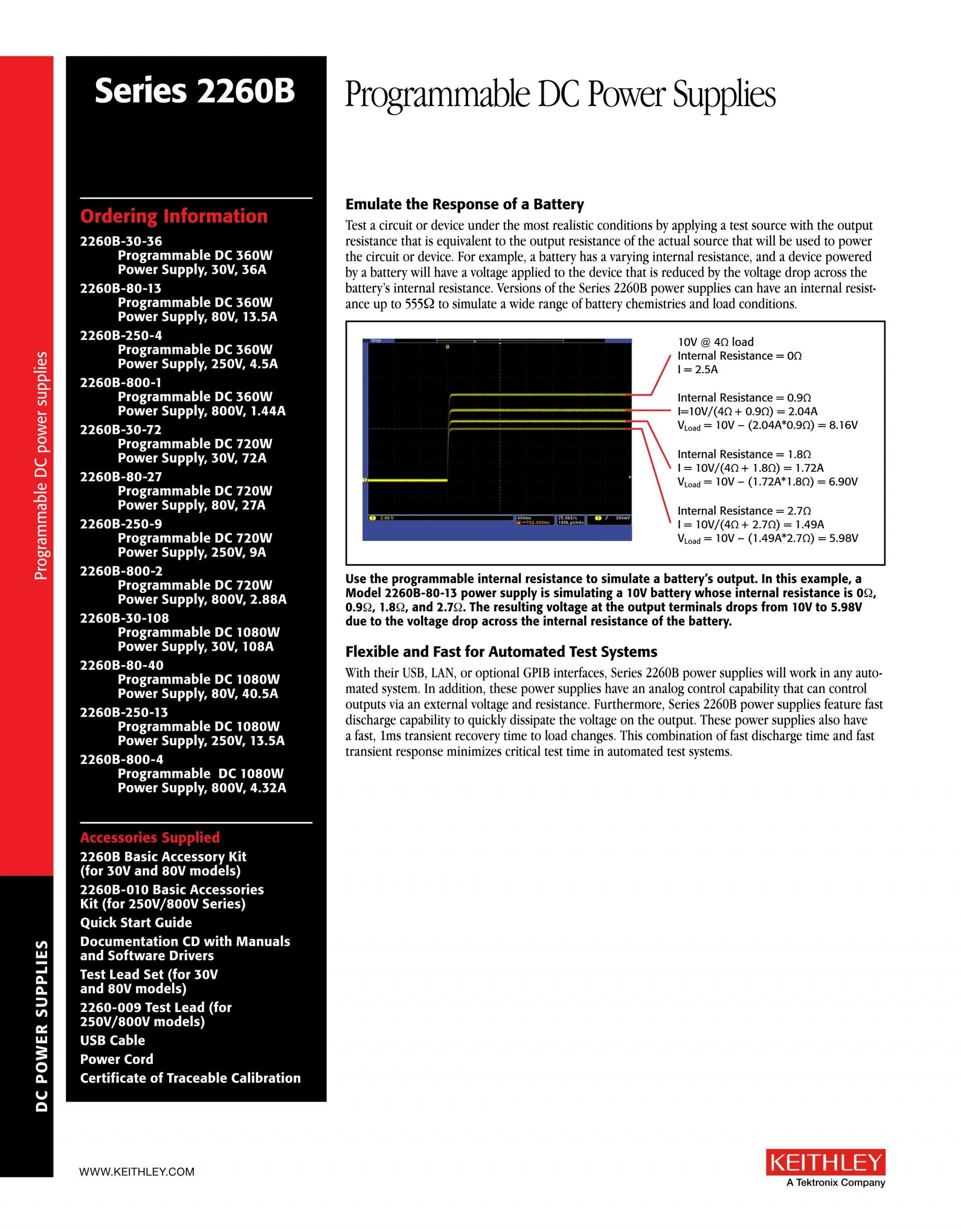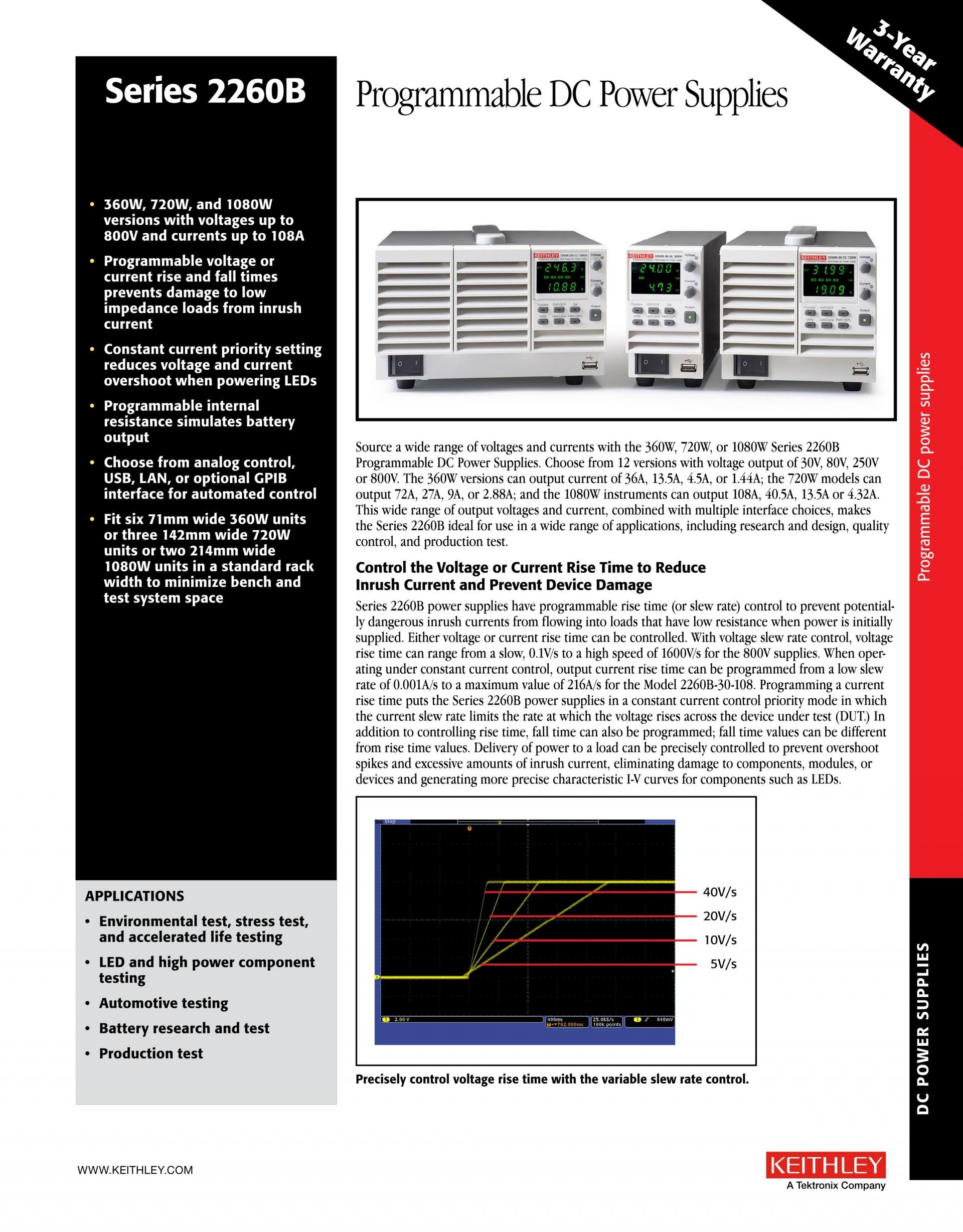 이러한 광범위한 출력 전압과 전류가 여러 인터페이스 옵션과 결합되어 시리즈 2260B는 연구 및 설계, 품질 제어, 생산 테스트를 비롯한 다양한 적용 분야에서 사용하기에 적합합니다.
